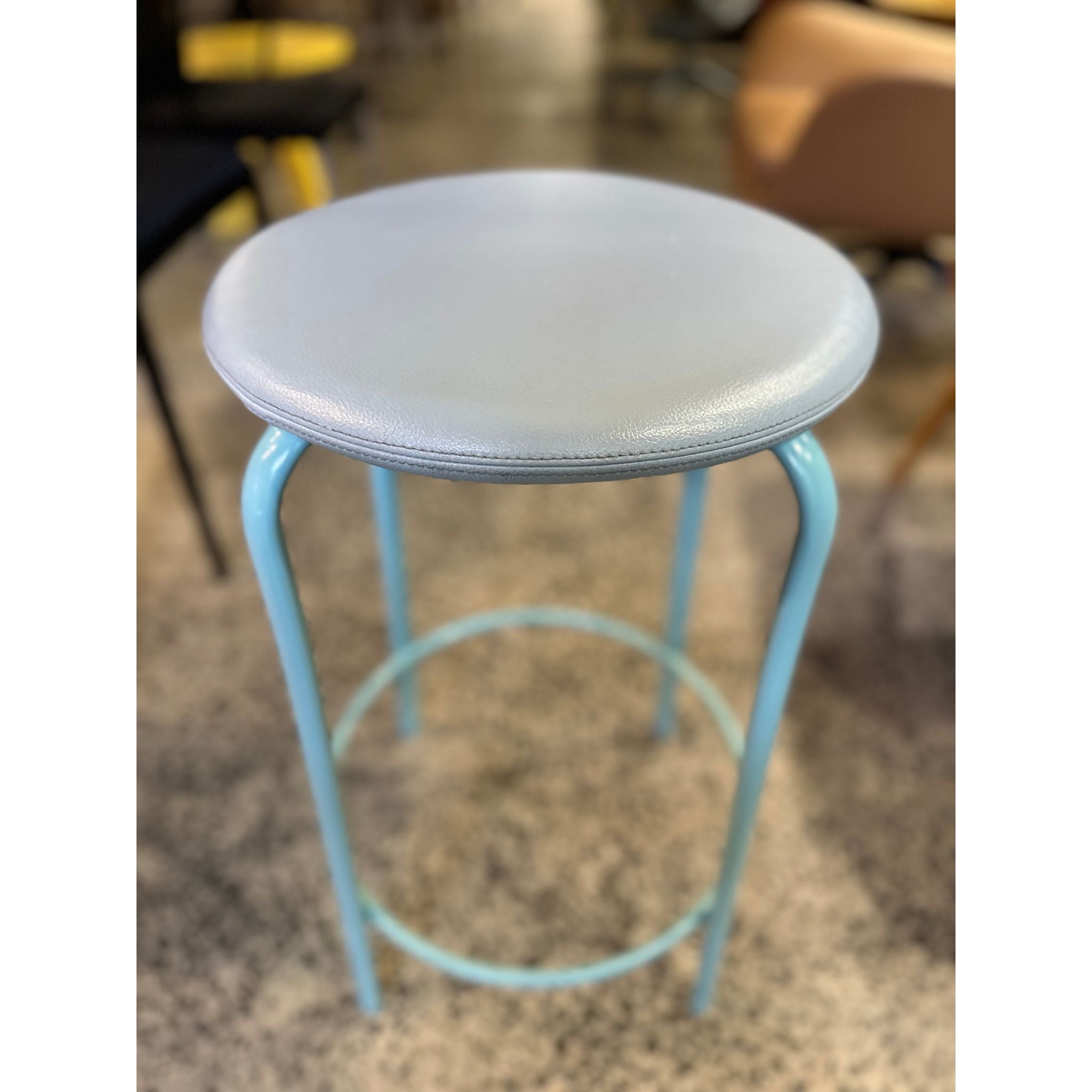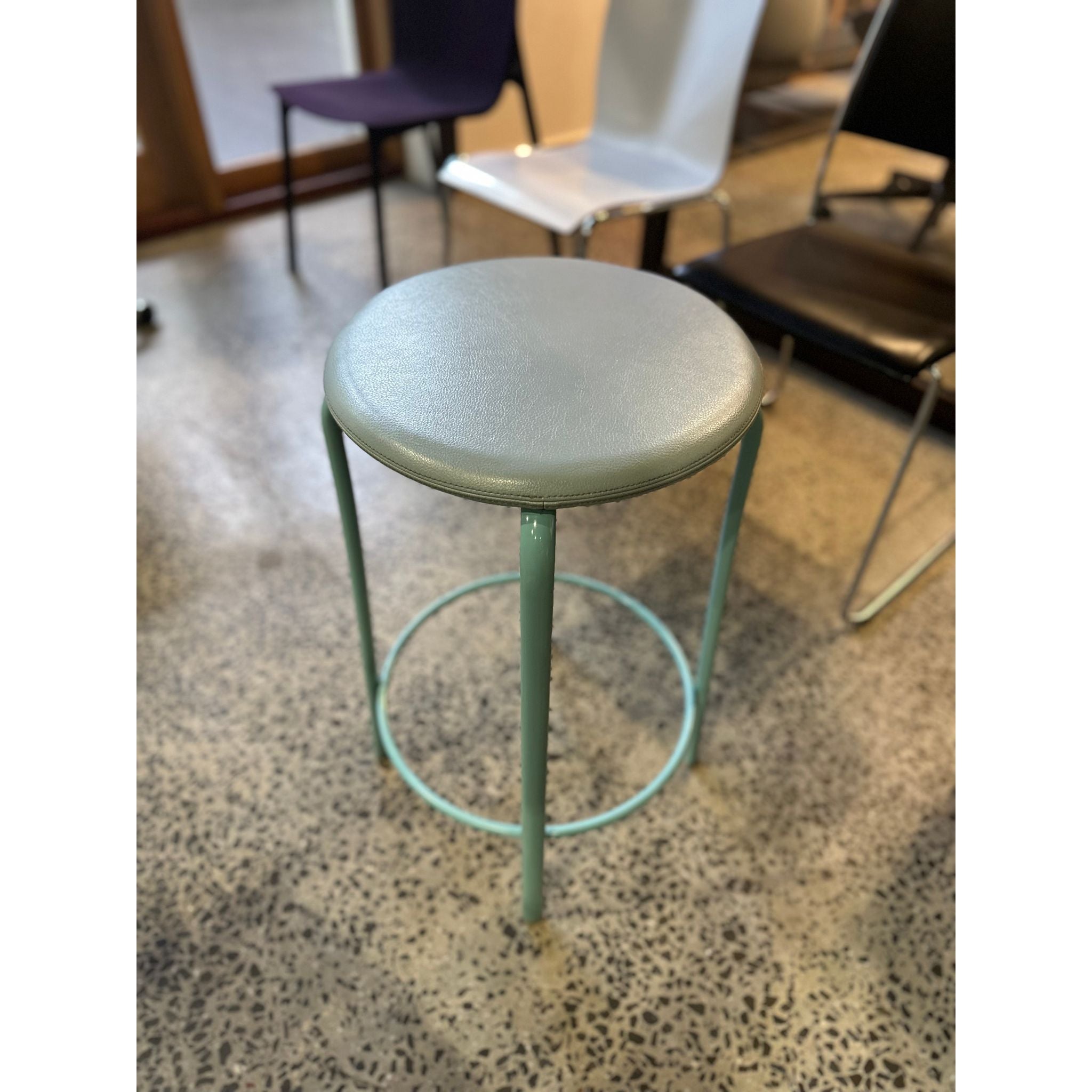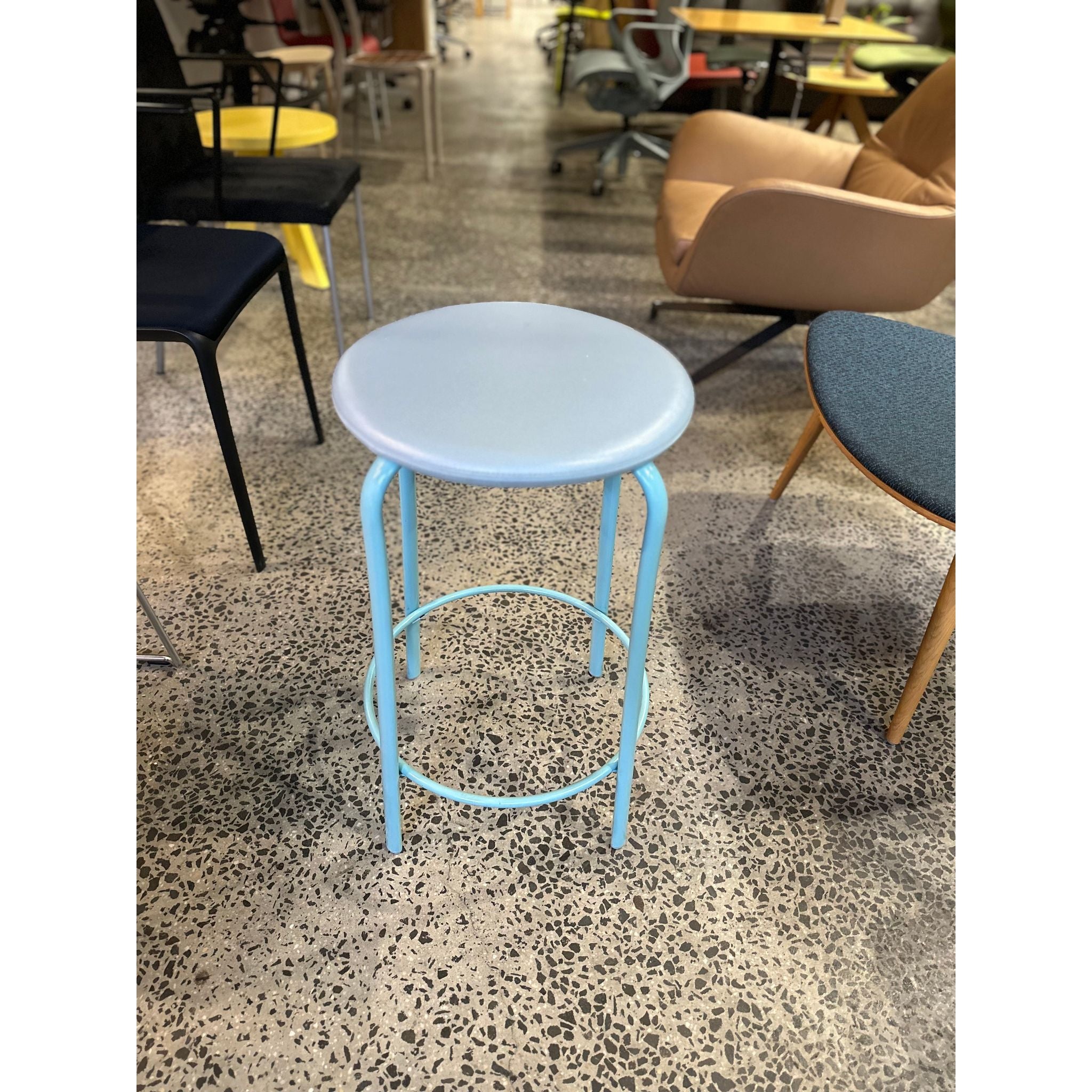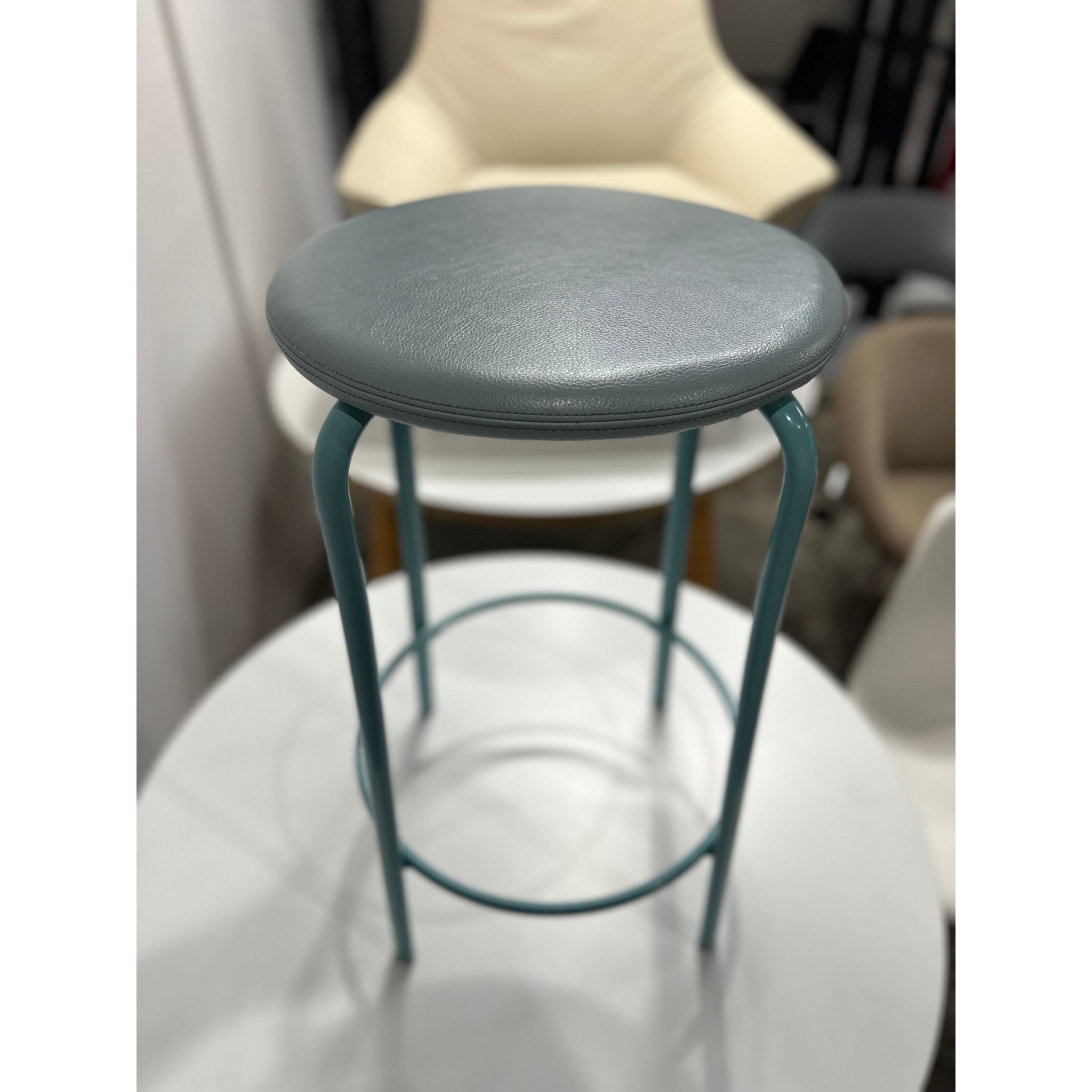 High stool with a lacquered metal stand and upholstered seat. The simple design makes it suitable for most spaces. The low weight makes it easy to pull out or put away if necessary. Has a footrest for comfortable support.
