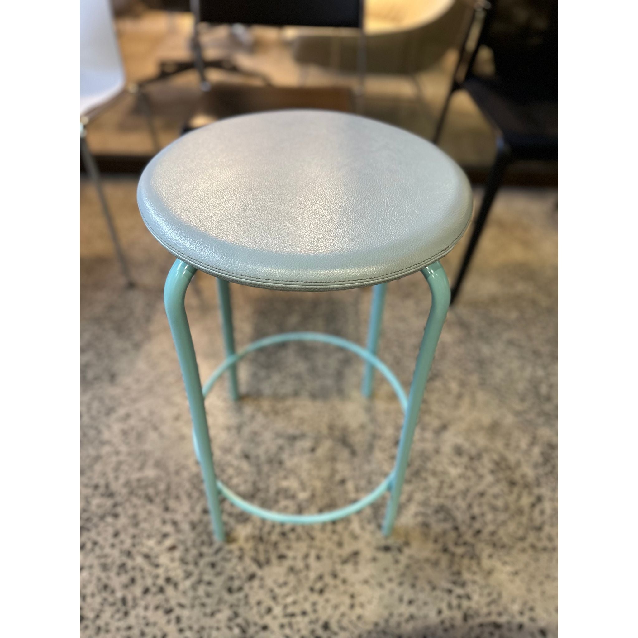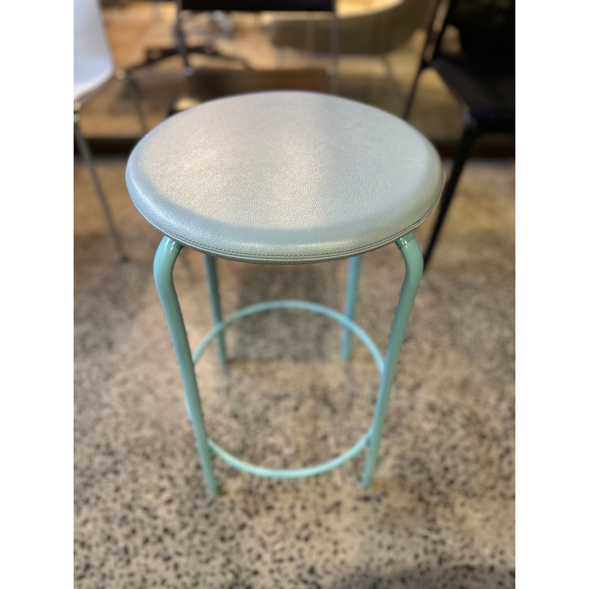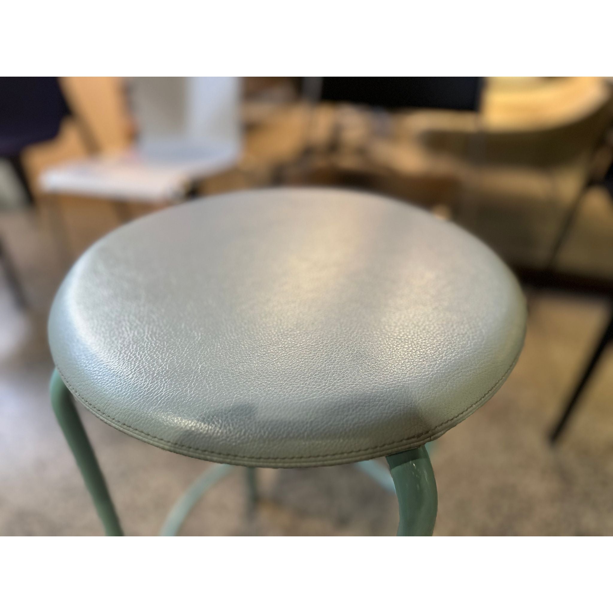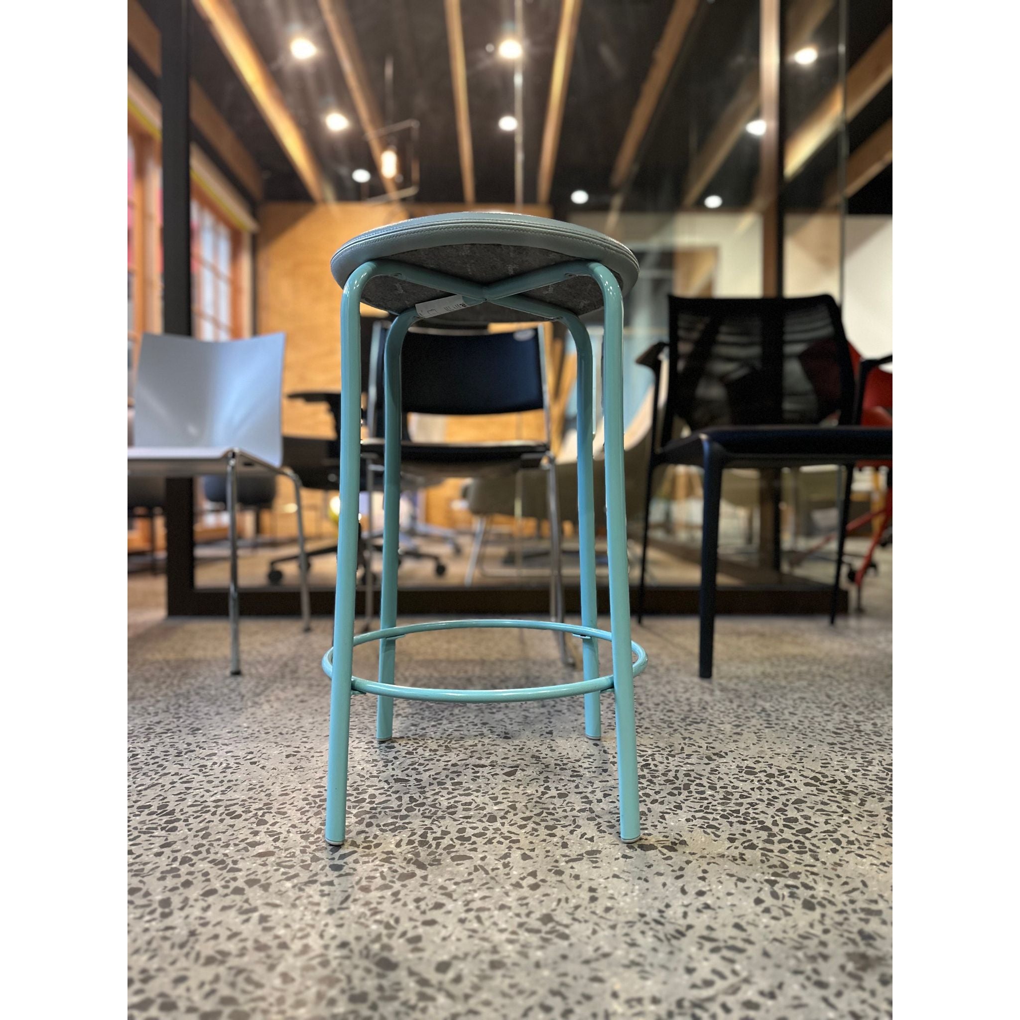 High stool with a lacquered metal stand and upholstered seat. The simple design makes it suitable for most spaces. The low weight makes it easy to pull out or put away if necessary. Has a footrest for comfortable support.