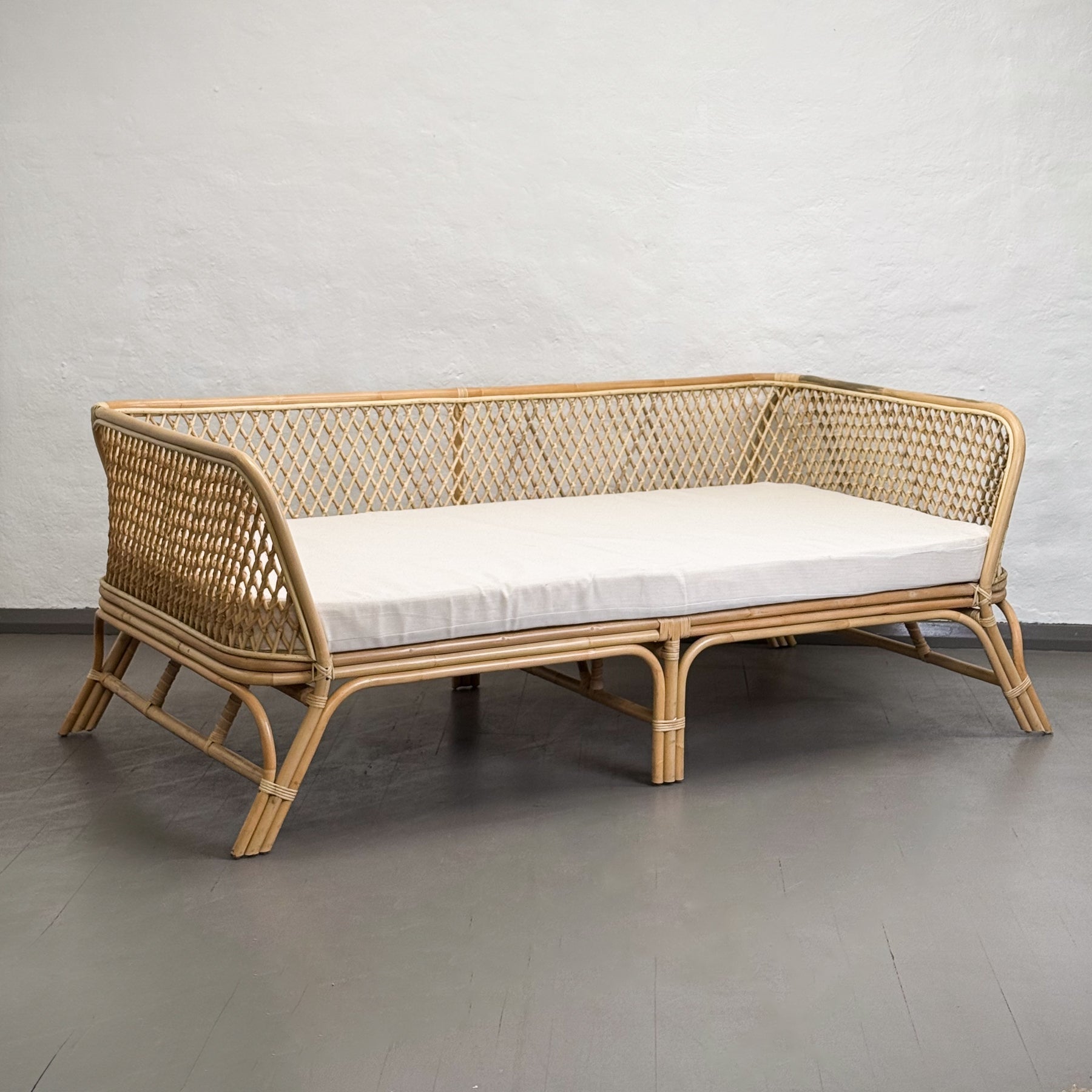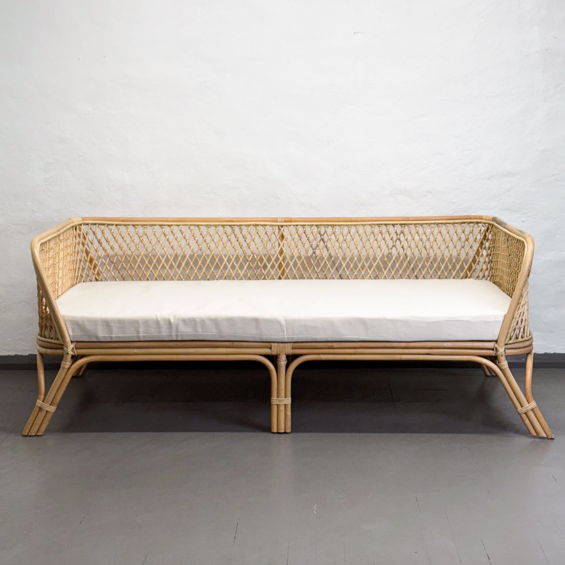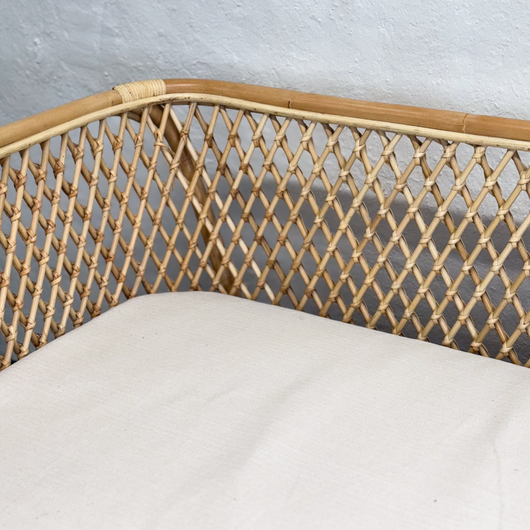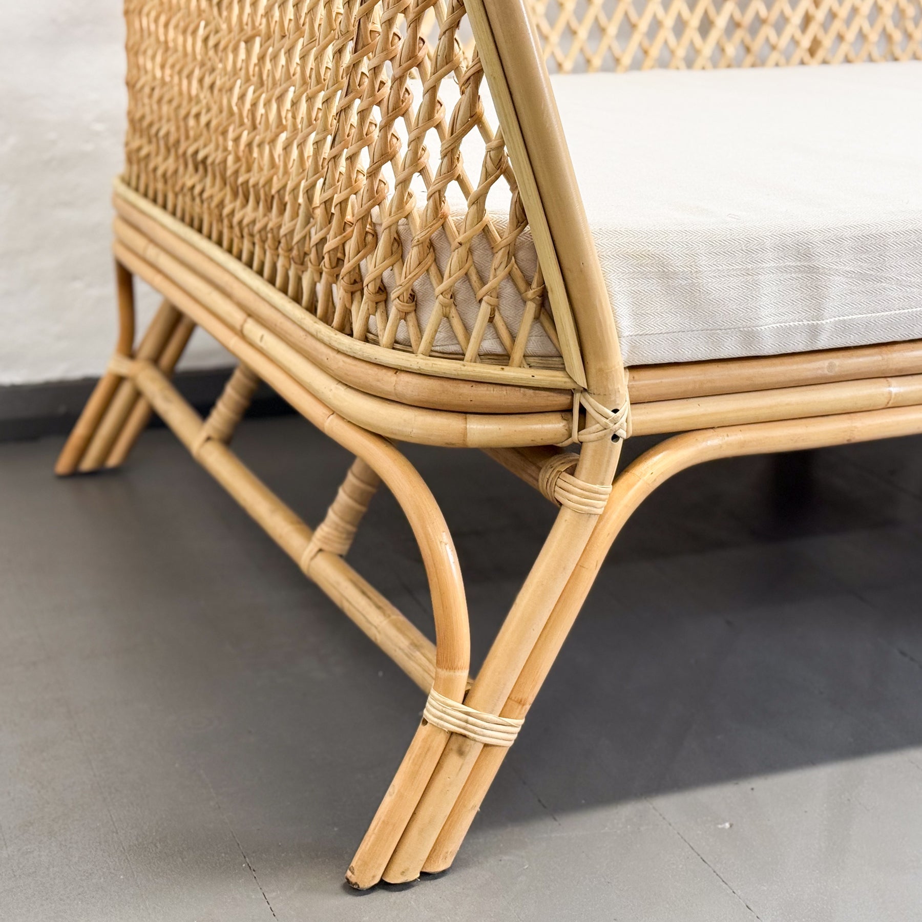 Featuring a trellis-style cane design, this wide and inviting daybed is paired with a cotton-covered beige off-white cushion. Its mid-century feel and Balinese craftsmanship make it a versatile addition to contemporary interiors.