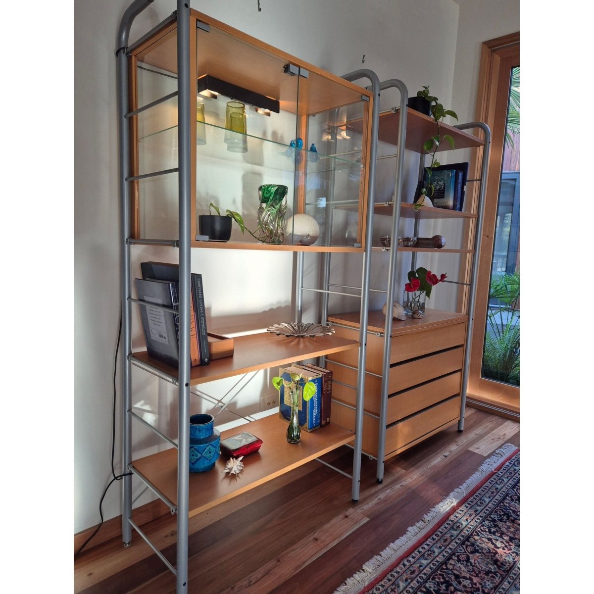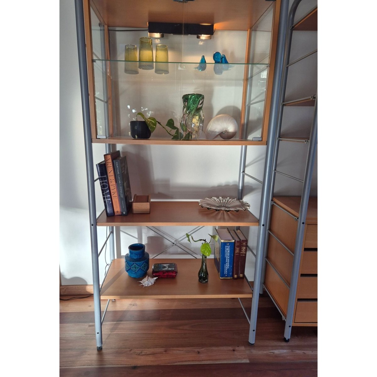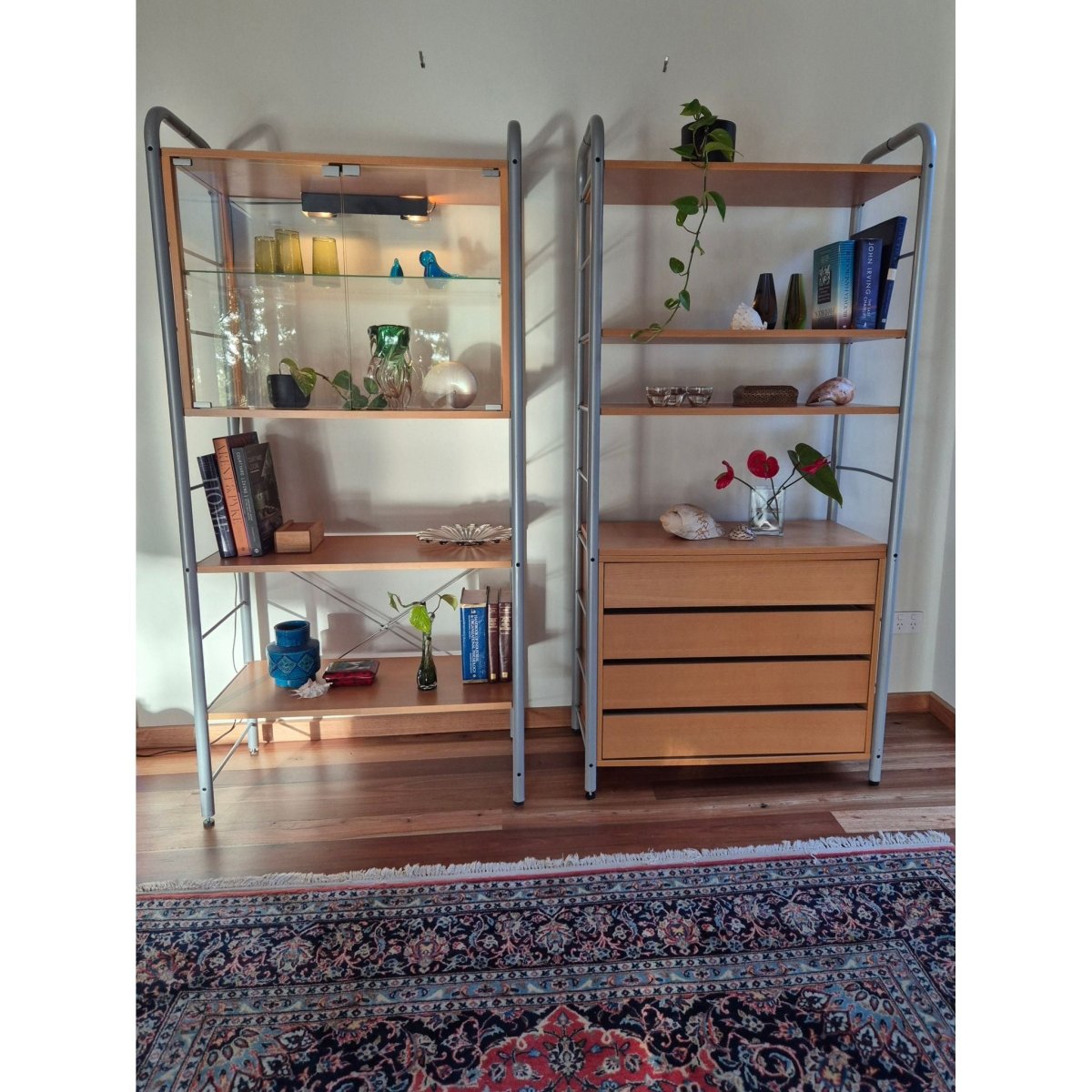 Sought after vintage Ikea "Niklas" unit by Rutger Andersson. These are two freestanding units: one consists of a backlit glass display cabinet and shelves; the other unit consists of open shelving and drawers.