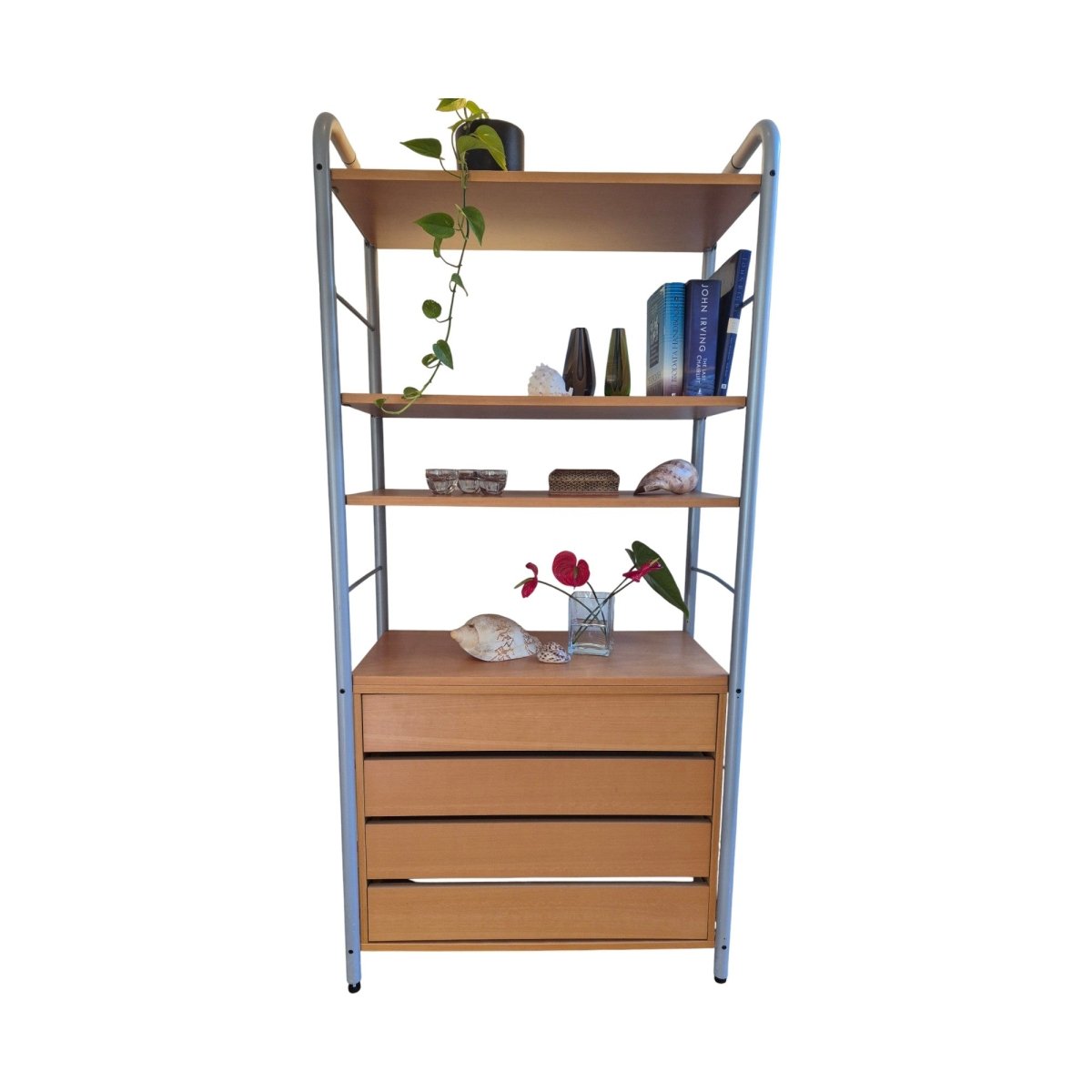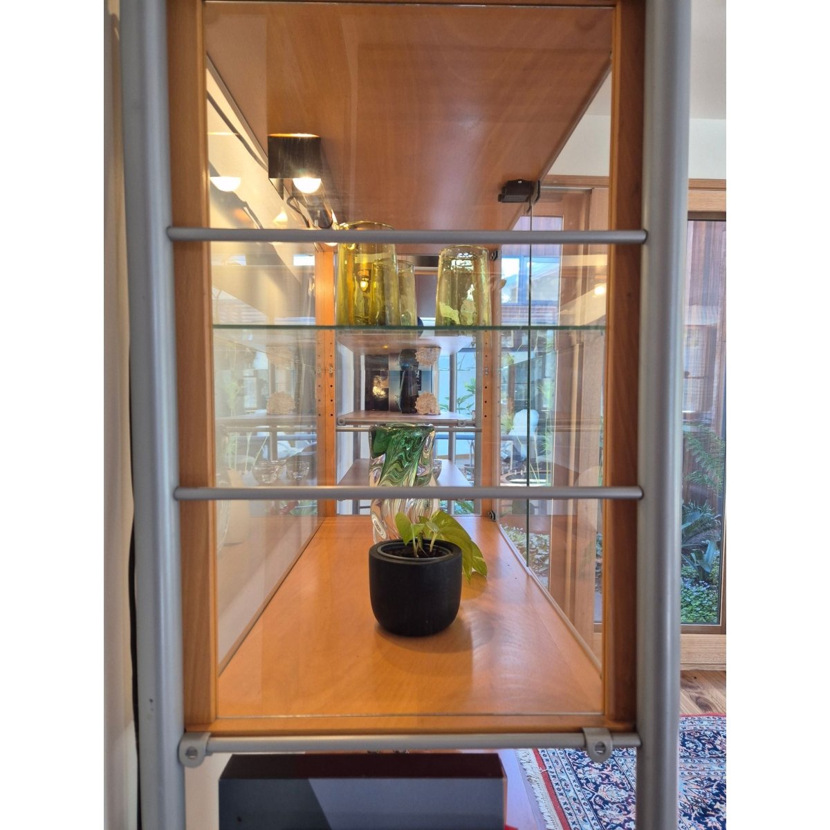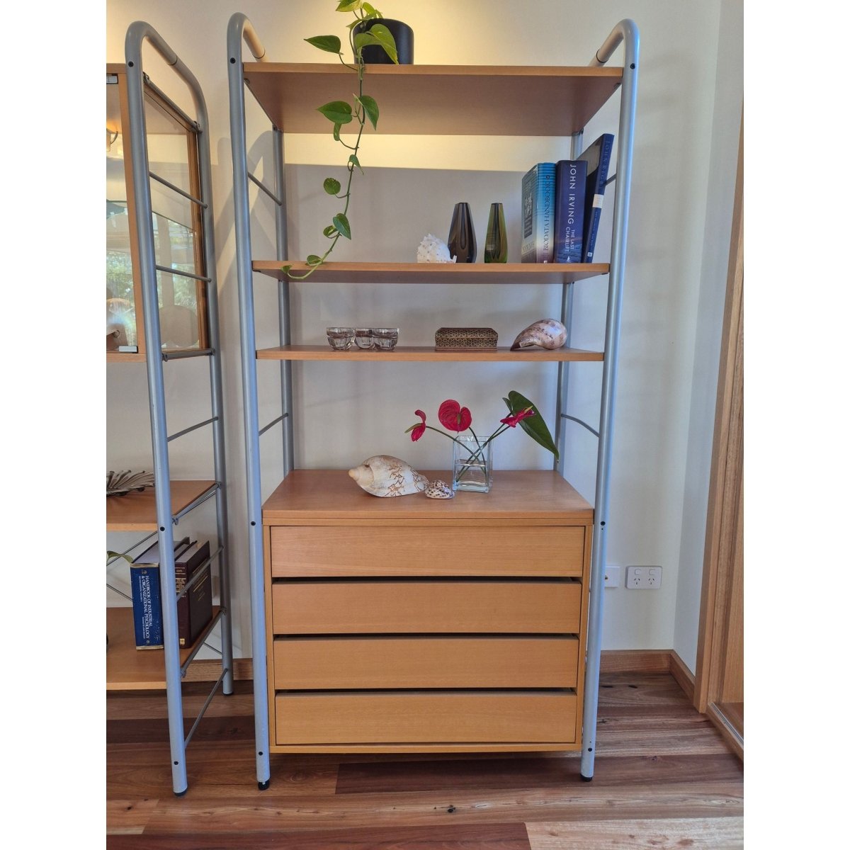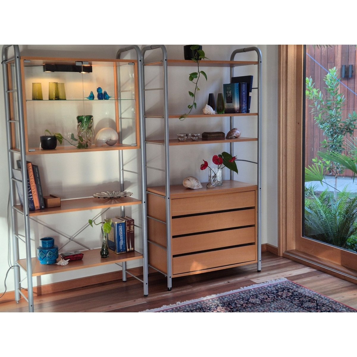 Sought after vintage Ikea "Niklas" unit by Rutger Andersson. These are two freestanding units: one consists of a backlit glass display cabinet and shelves; the other unit consists of open shelving and drawers.