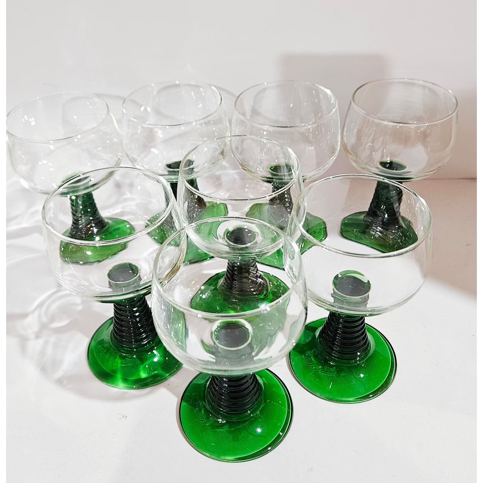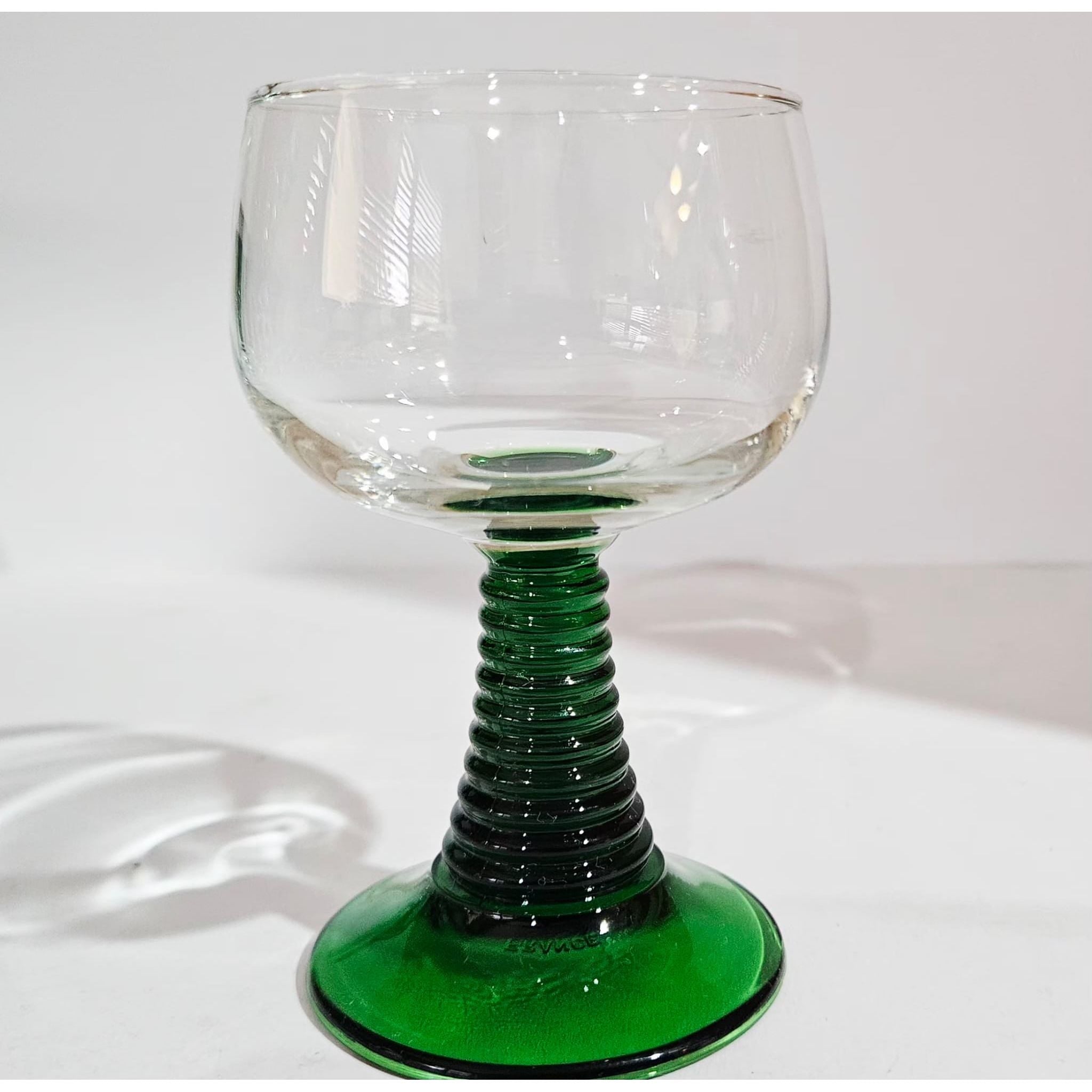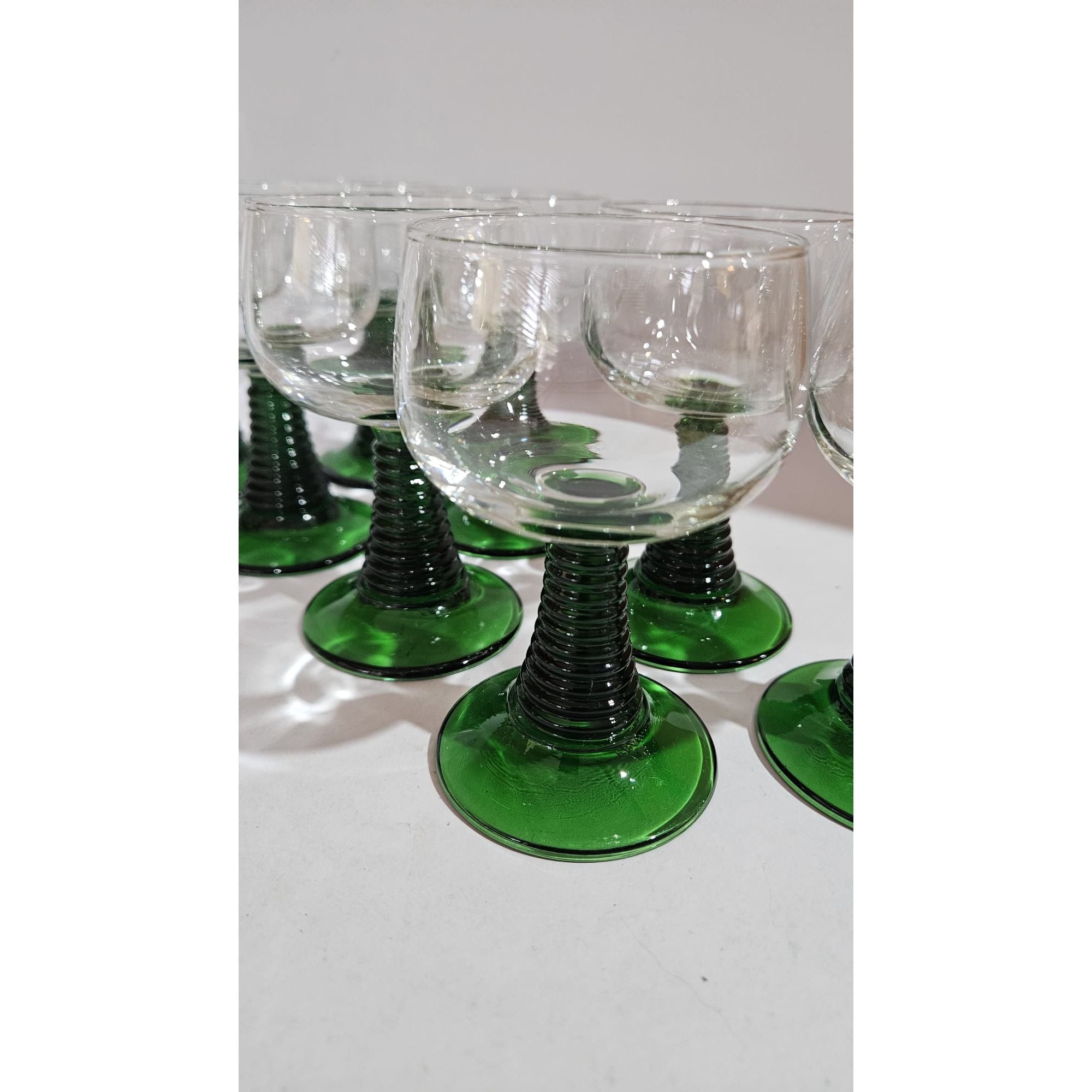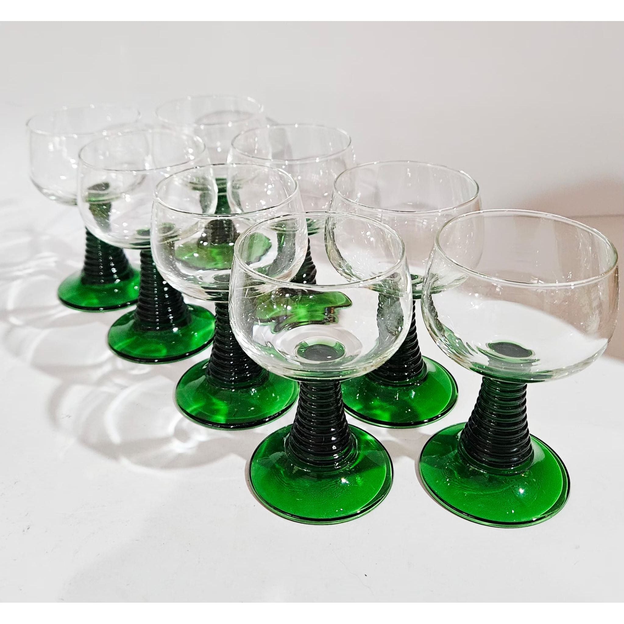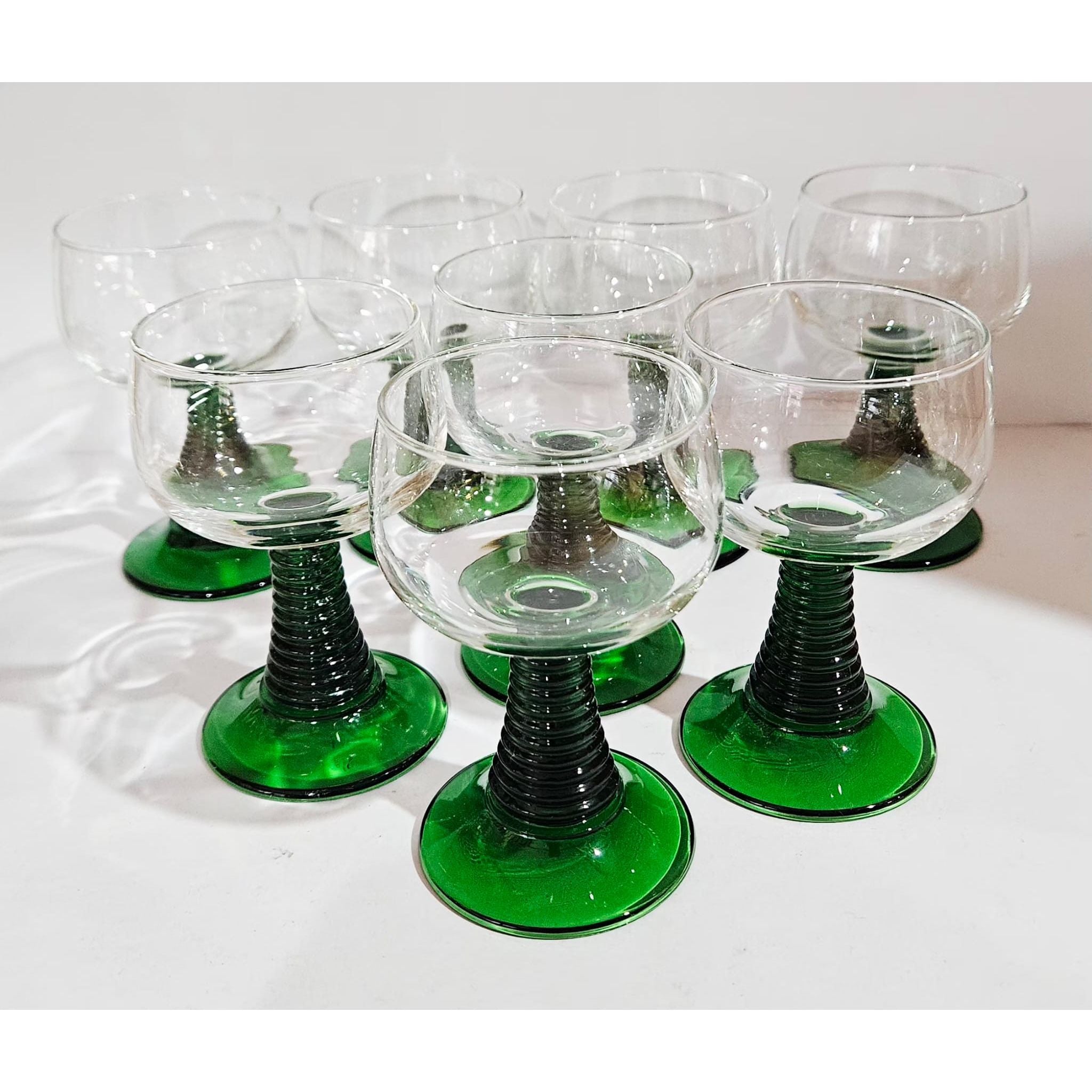 Vintage set of 8 Luminarc roemer wine glasses, medium sized glasses with a green ribbed base, they have a capacity of just over 200ml, marked at the bottom, 1970s, France. These wine glasses were very popular in the 1970s. They are also called Roemer or Römer glasses and are very recognizable by the green base and stem with increasingly wider rings. In perfect vintage condition, no cracks, breaks or chips, check the photos for more details! Dimensions: 11cm high, 6cm diameter.