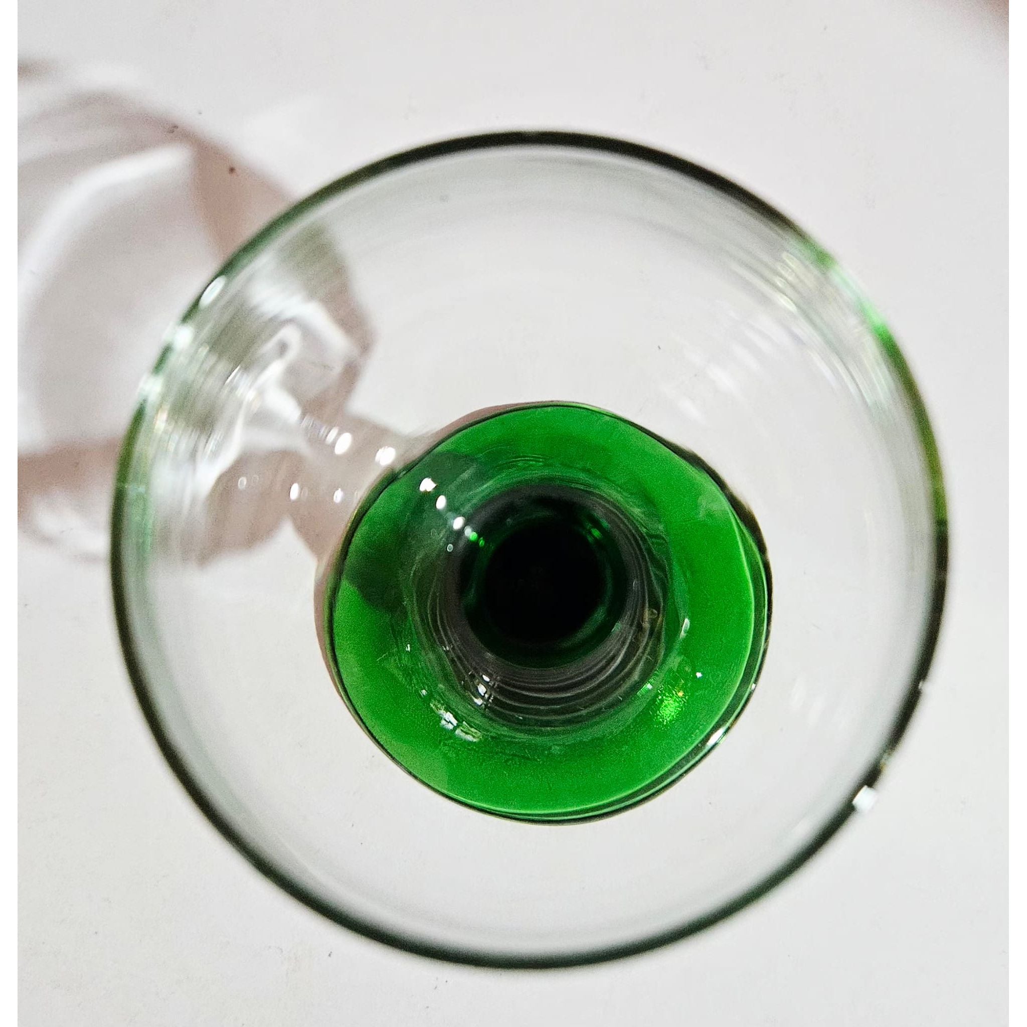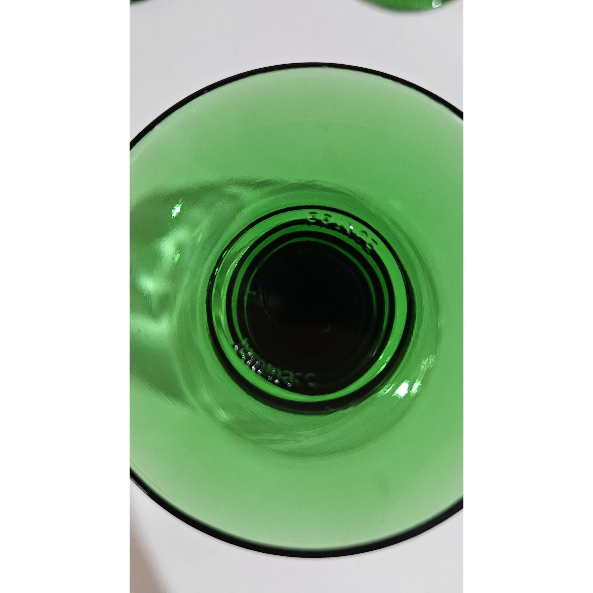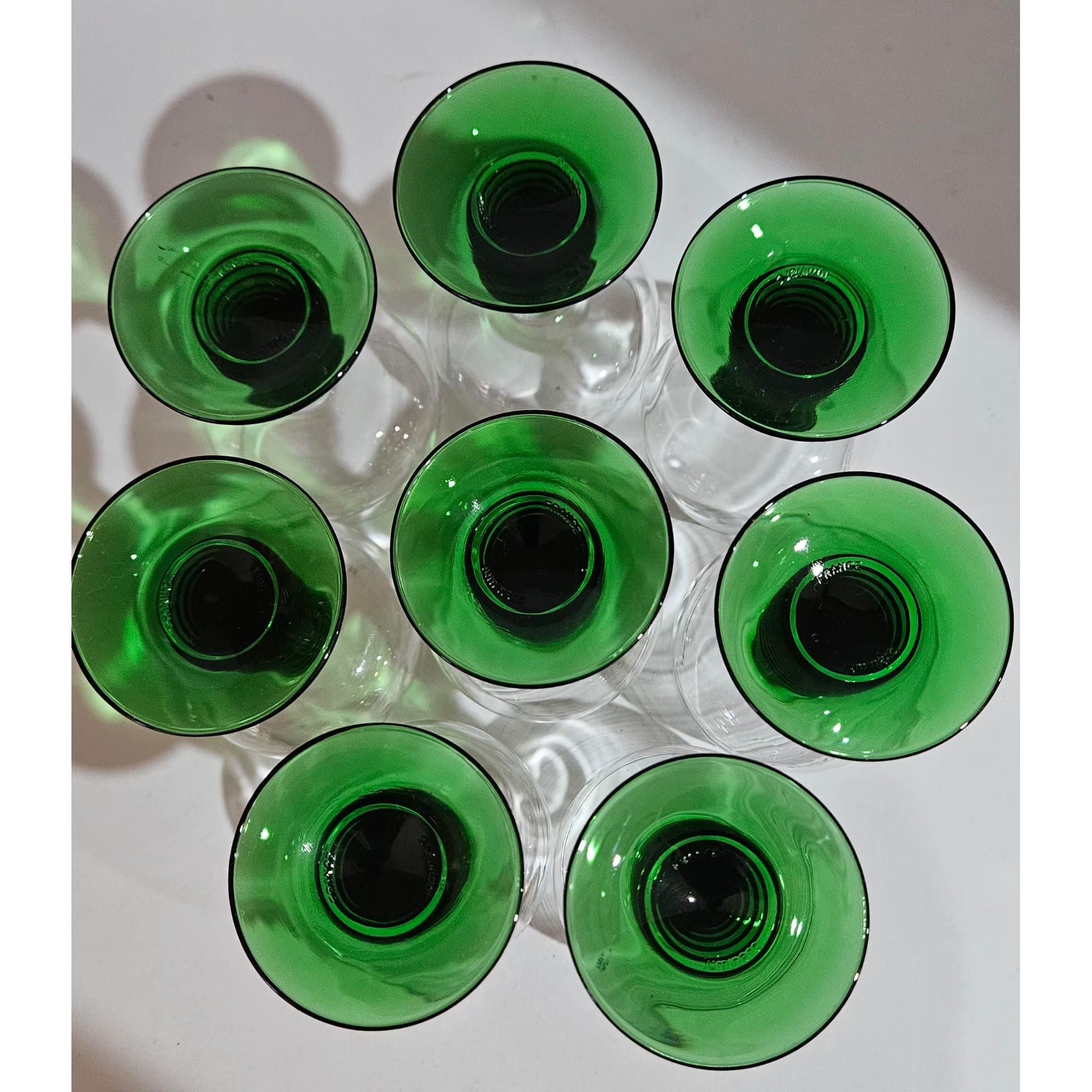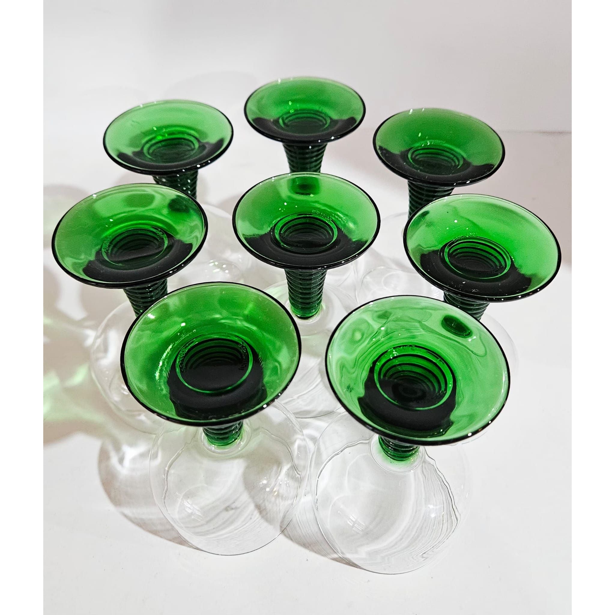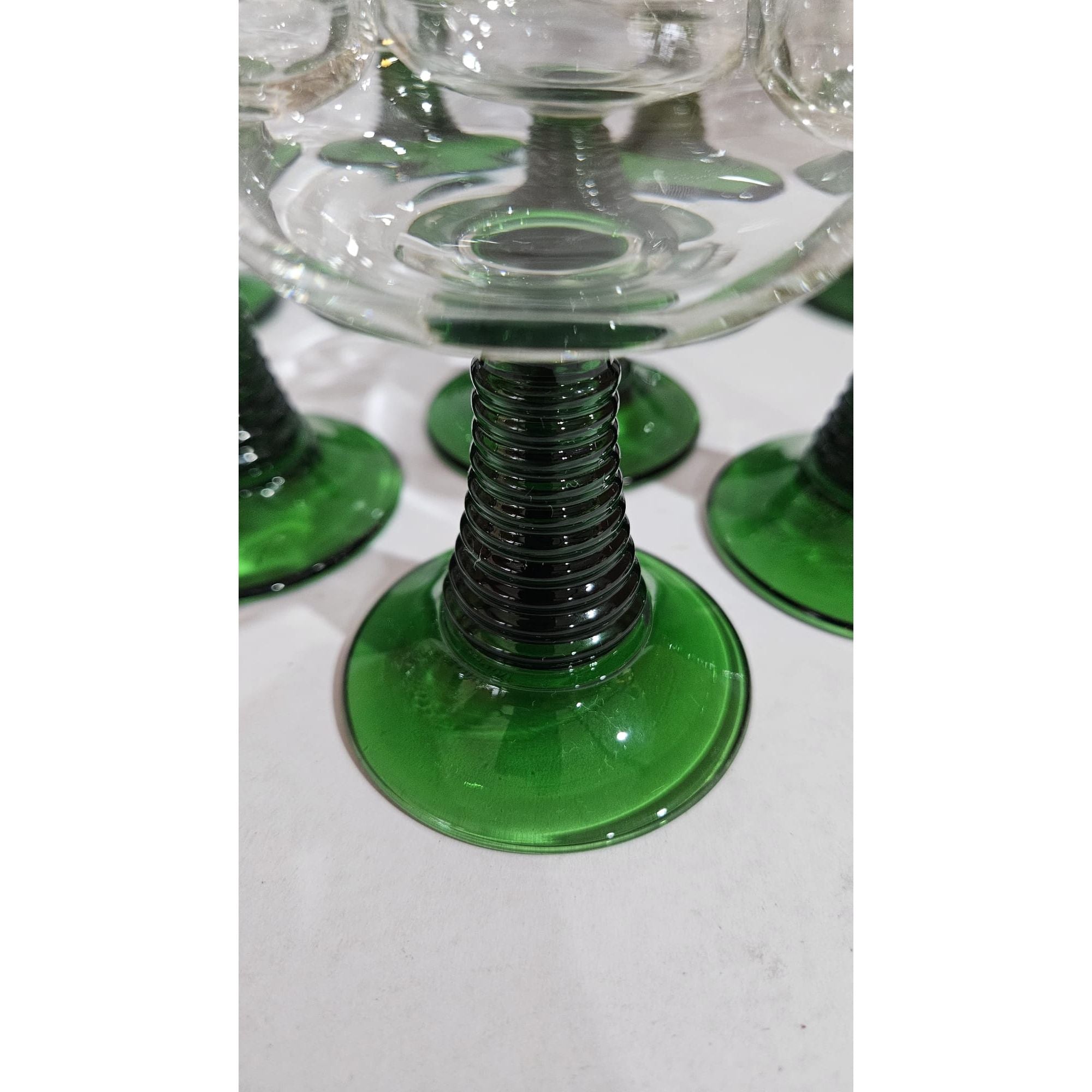 Vintage set of 8 Luminarc roemer wine glasses, medium sized glasses with a green ribbed base, they have a capacity of just over 200ml, marked at the bottom, 1970s, France. These wine glasses were very popular in the 1970s. They are also called Roemer or Römer glasses and are very recognizable by the green base and stem with increasingly wider rings. In perfect vintage condition, no cracks, breaks or chips, check the photos for more details! Dimensions: 11cm high, 6cm diameter.