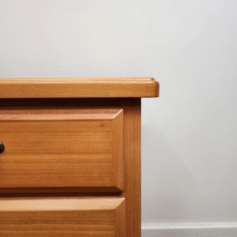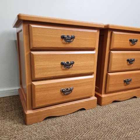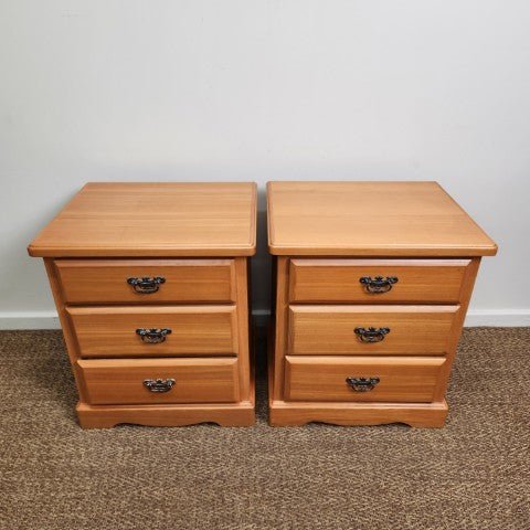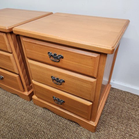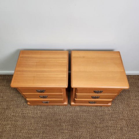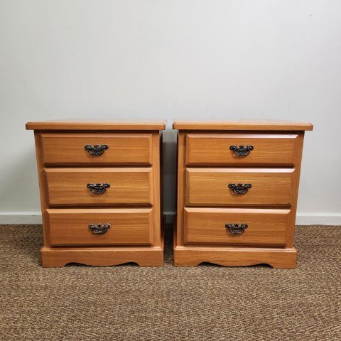 This pair of timber bedsides features a clean, classic silhouette in ash wood with a plinth base and three drawers on smooth runners. Finished with brass handles, they bring a simple traditional feel that suits colonial, Victorian, or timeless bedroom styles. The natural timber tone keeps them versatile. Their practical form and understated design make them an easy fit beside a bed or in a living space.