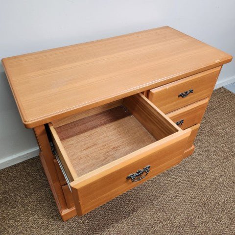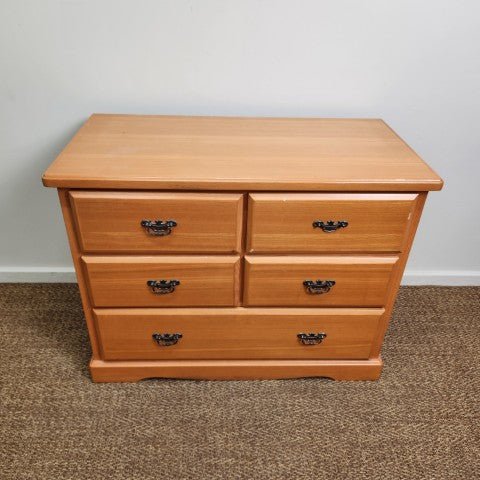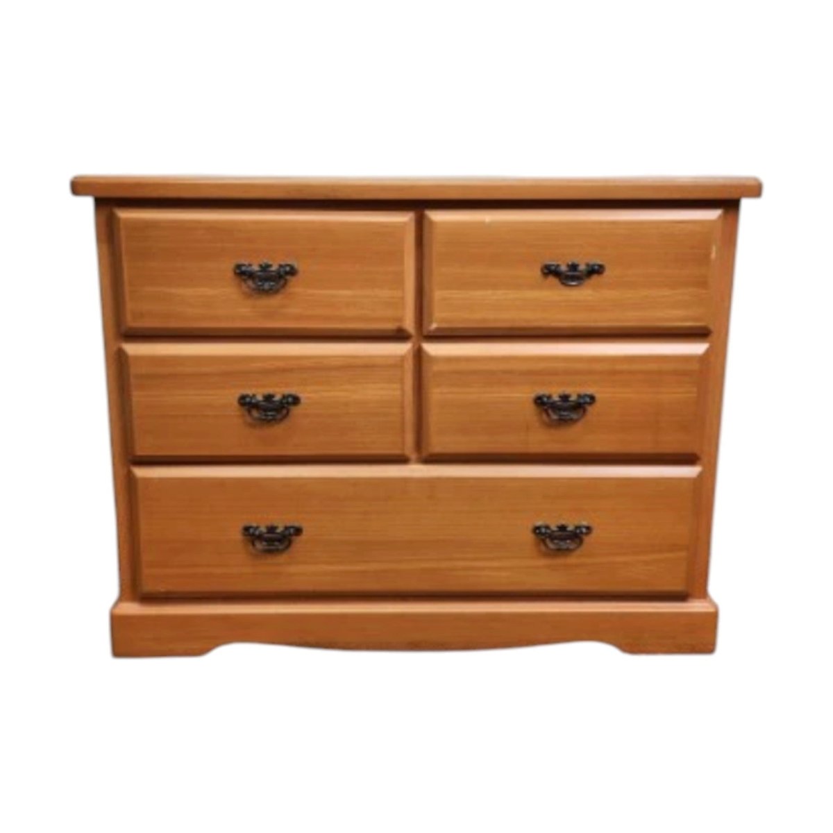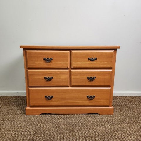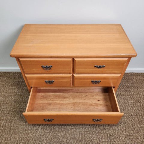 This timber chest of 5 drawers is crafted in ash wood with a clean, classic silhouette and a plinth base. It features five drawers on smooth runners, finished with brass drop hardware for a traditional touch. The natural timber tone makes it easy to style in colonial, Victorian, or timeless bedroom interiors.