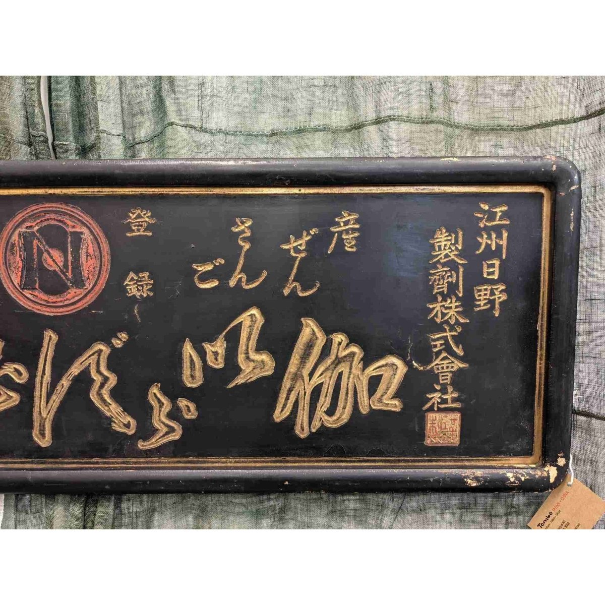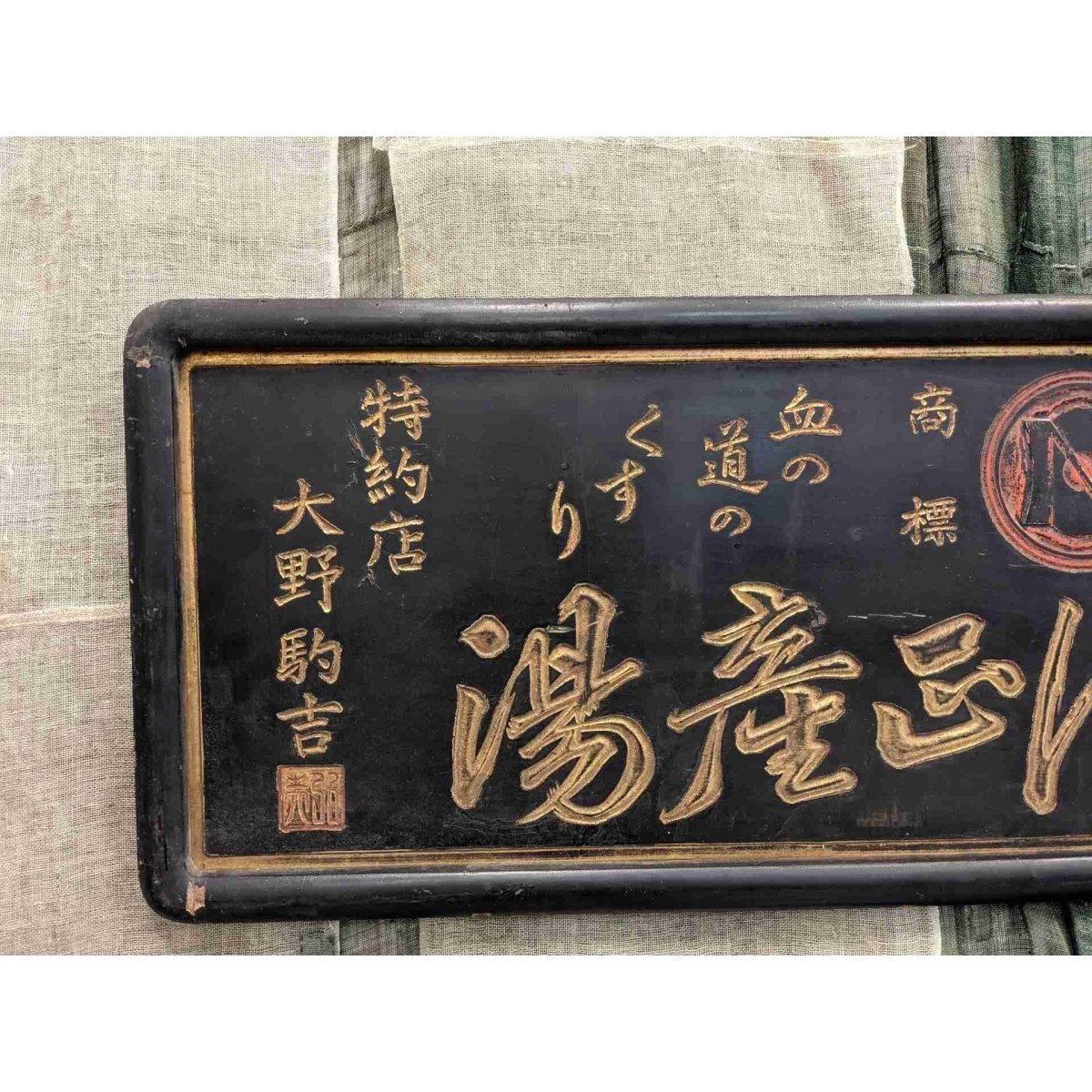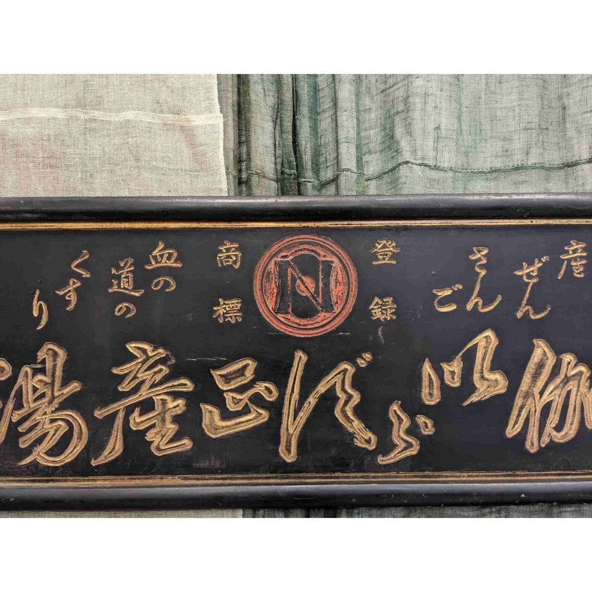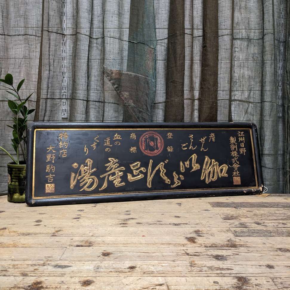 A unique lacquered wooden Japanese shop sign. Selling medicine for women. Late 19th century.