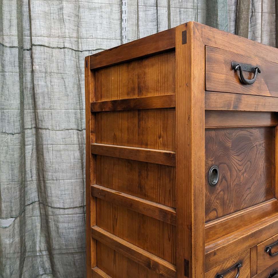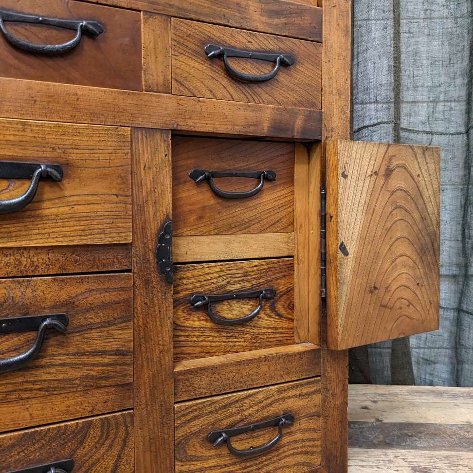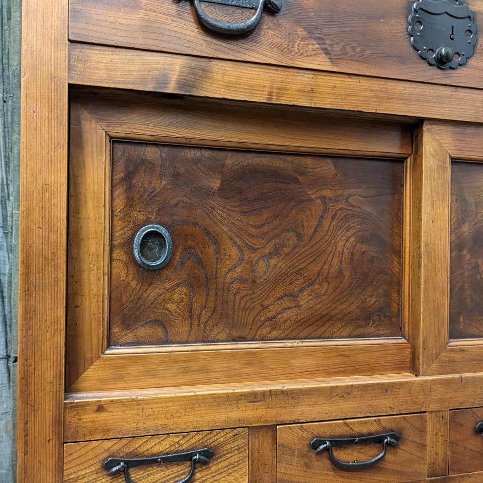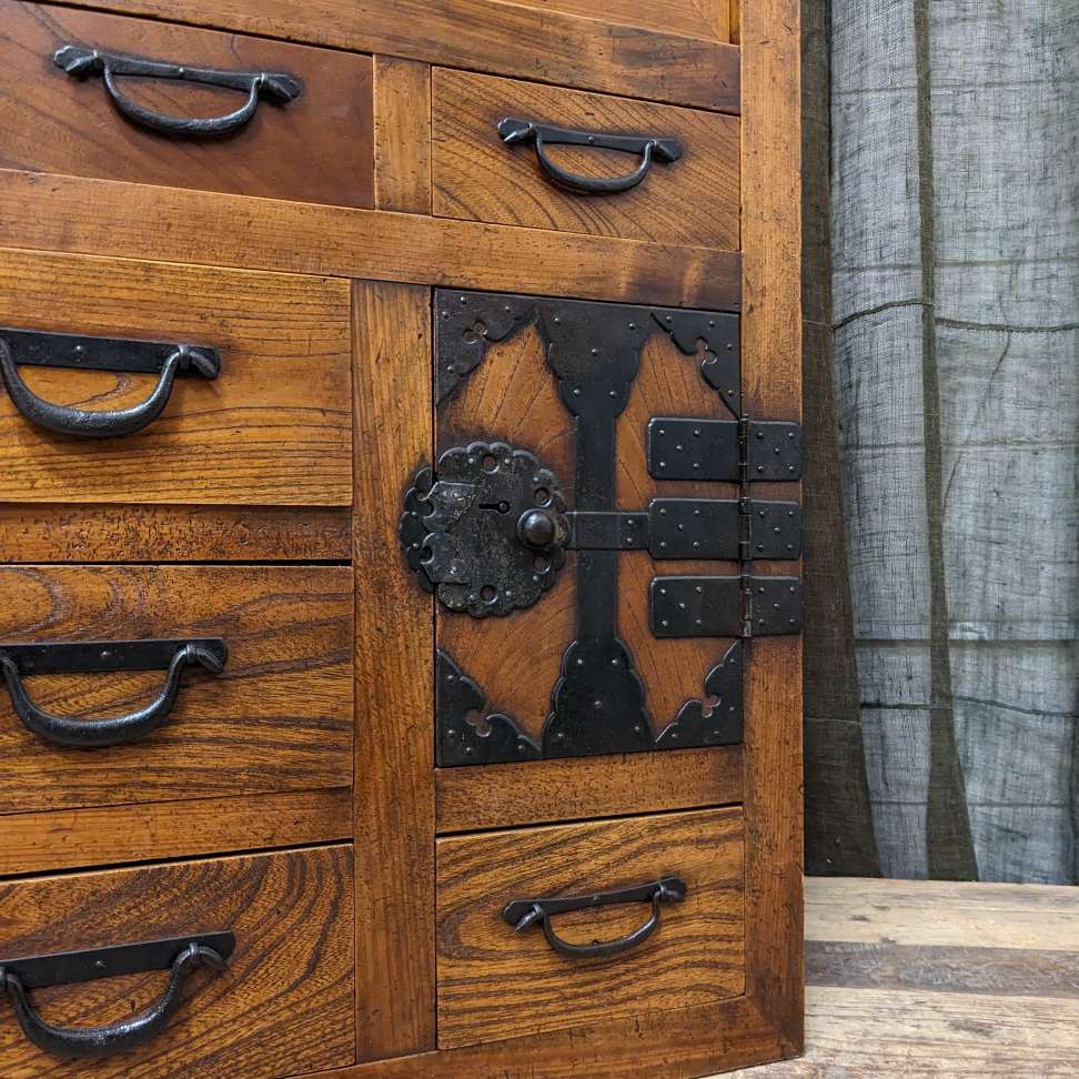 An antique Japanese chest from the Gifu prefecture, used as a merchants chest. These pieces are known as a choba dansu. Made from sugi (cedar) and hinoki (cypress) woods, with keyaki (elm) wood drawers and doors. Meiji period, c.1880