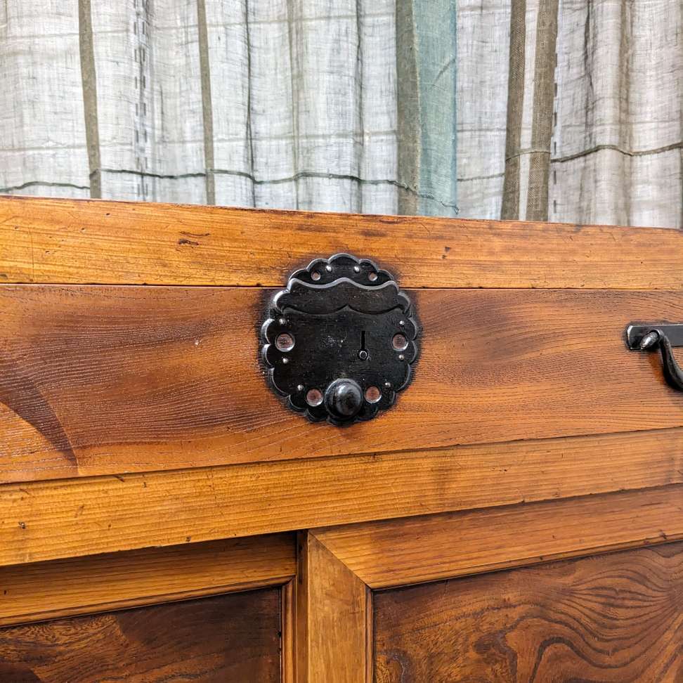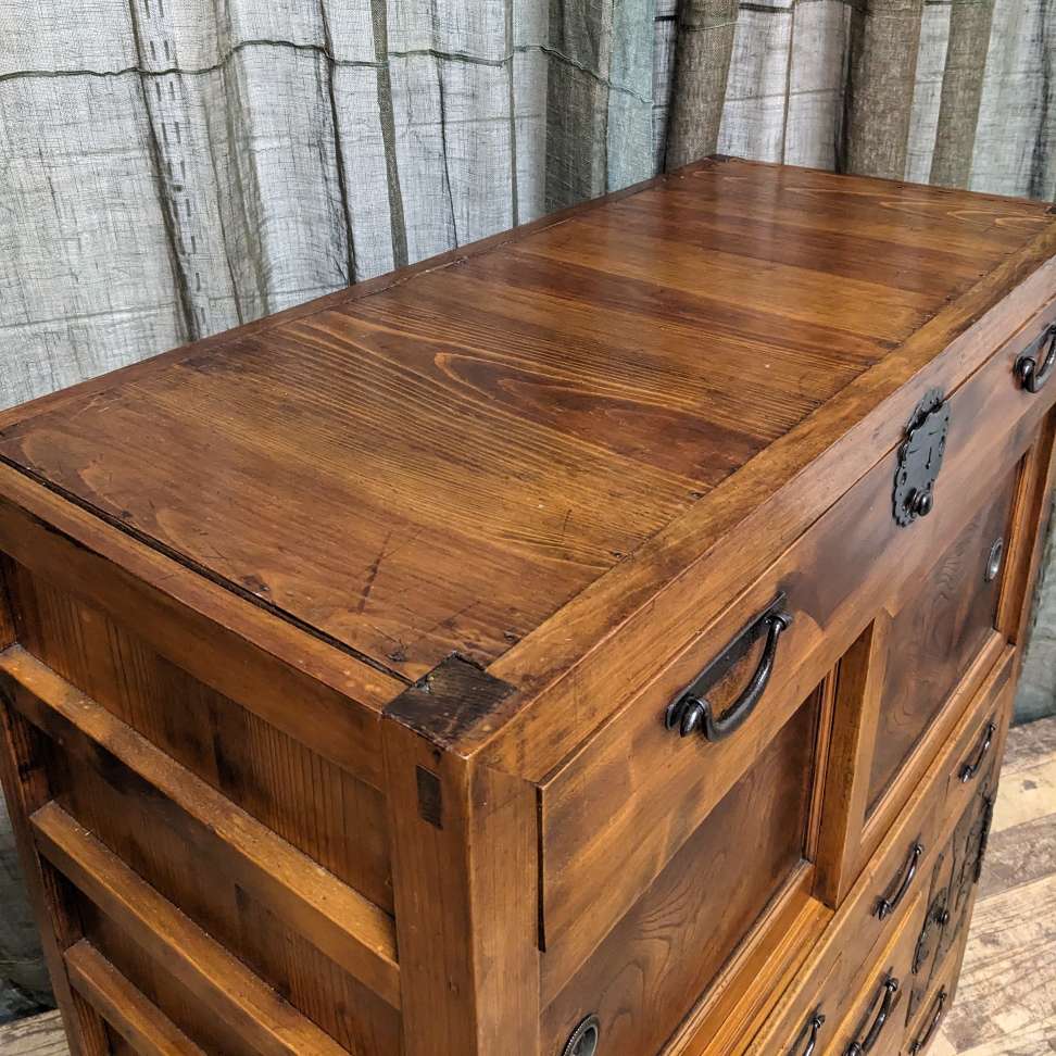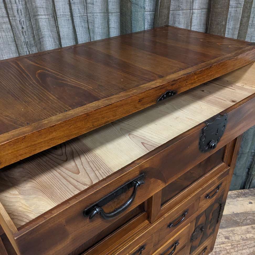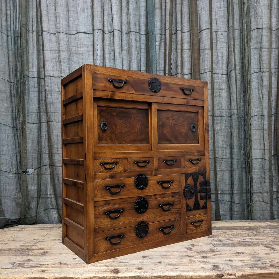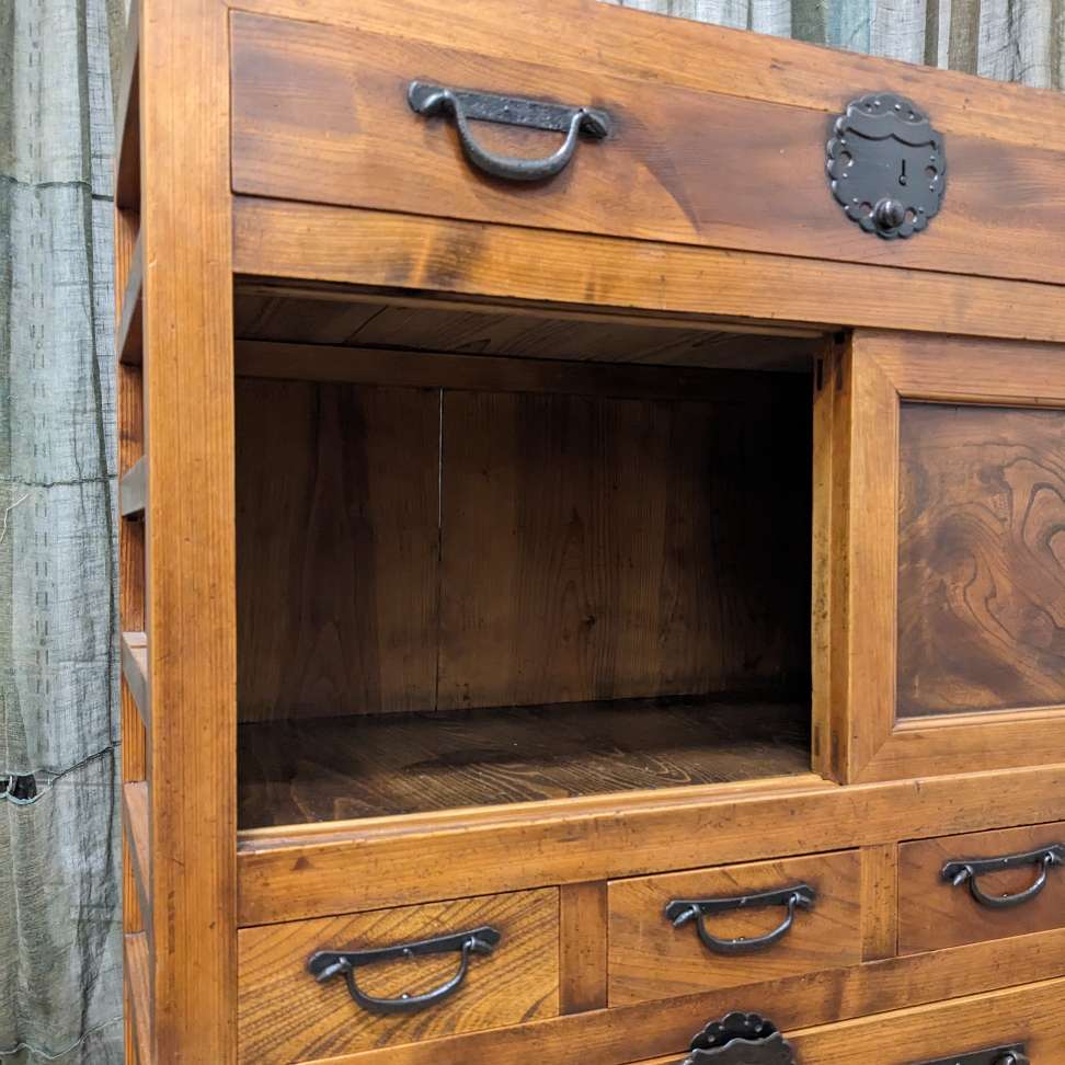 An antique Japanese chest from the Gifu prefecture, used as a merchants chest. These pieces are known as a choba dansu. Made from sugi (cedar) and hinoki (cypress) woods, with keyaki (elm) wood drawers and doors. Meiji period, c.1880
