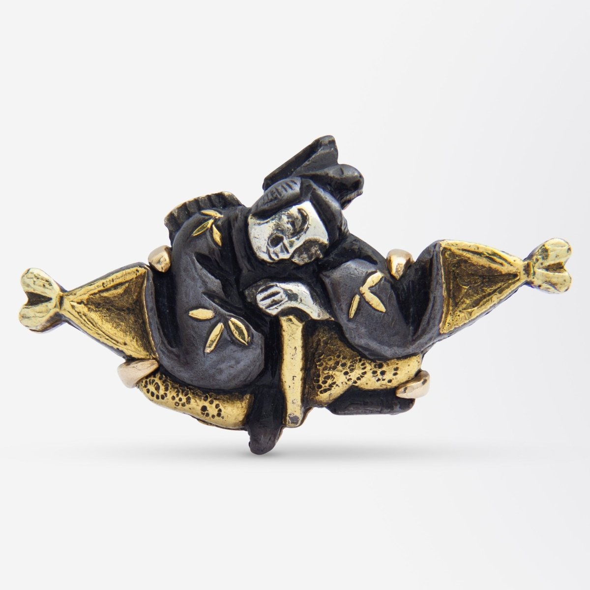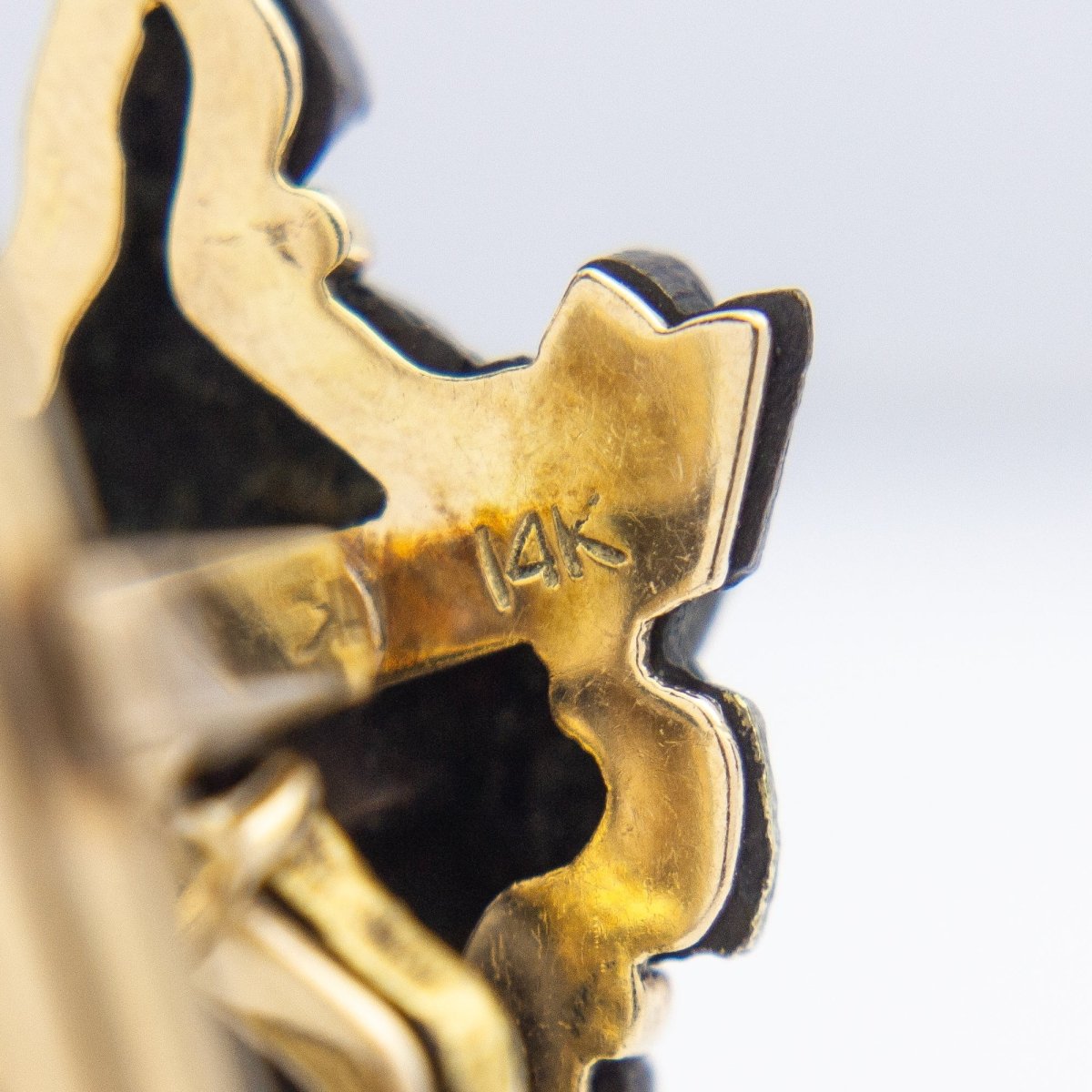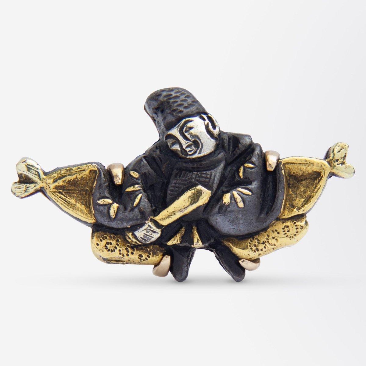 A wonderful pair of novelty, Japanese, 'shakudo' cufflinks set in 14 karat yellow gold. The central components of the cufflinks are likely to have been repurposed from something larger and date to the tail end of the 19th or early 20th century. They have been fashioned into cufflinks with the addition of 14 karat yellow gold settings, likely some time during the 1970s. Shakudo is a Japanese alloy of copper and gold which often has a darkened blue patina. The production of shakudo was seen mostly in the late 19th and early 20th century with there being several examples of Western jewellers incorporating elements of shakudo into brooches, earrings and bracelets. The pair feature sprung mechanisms which are both working well and are secure. Such an unusual pair of cufflinks which are undoubtedly one of a kind and very functional.