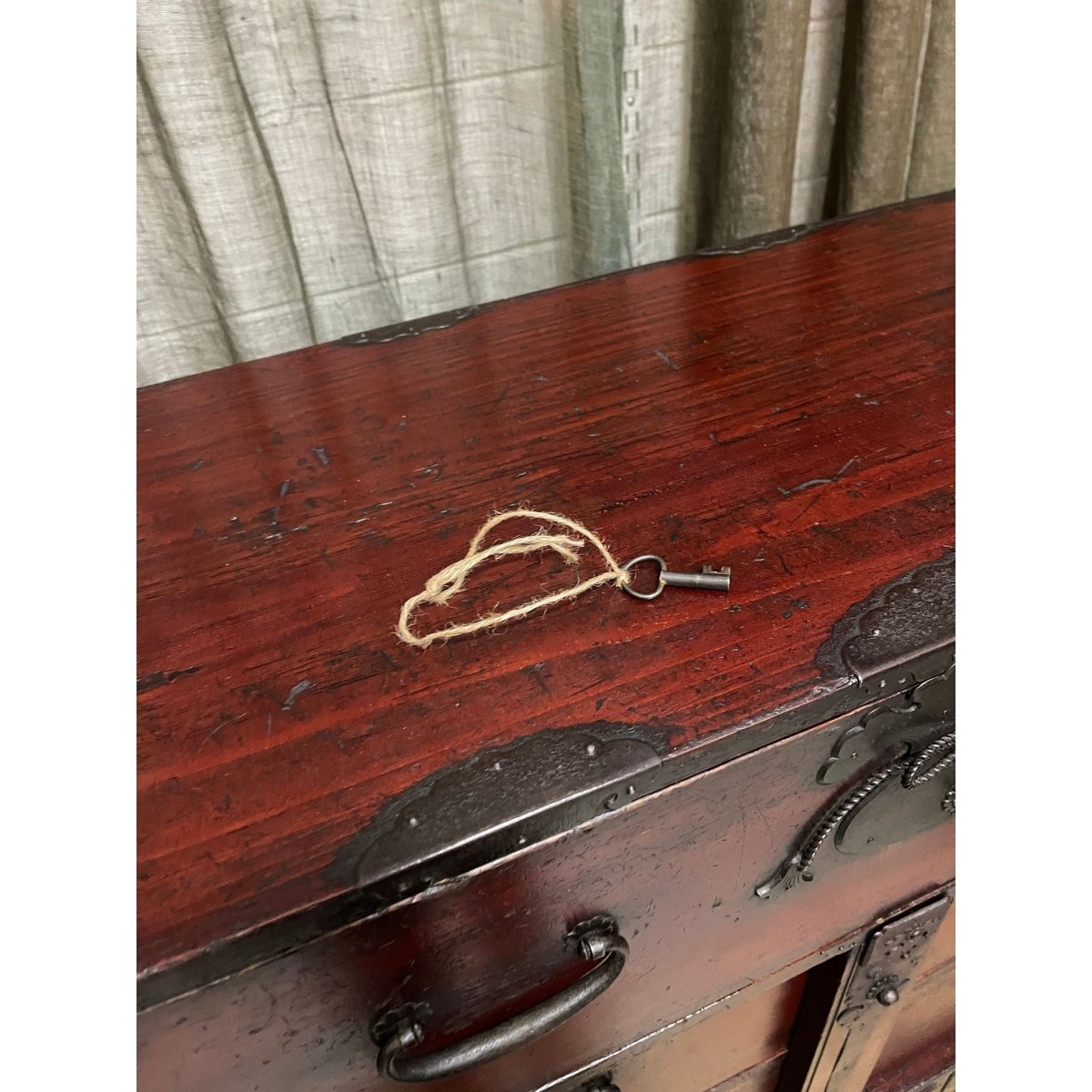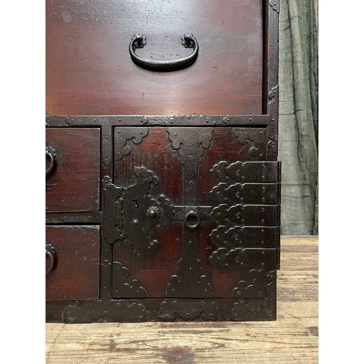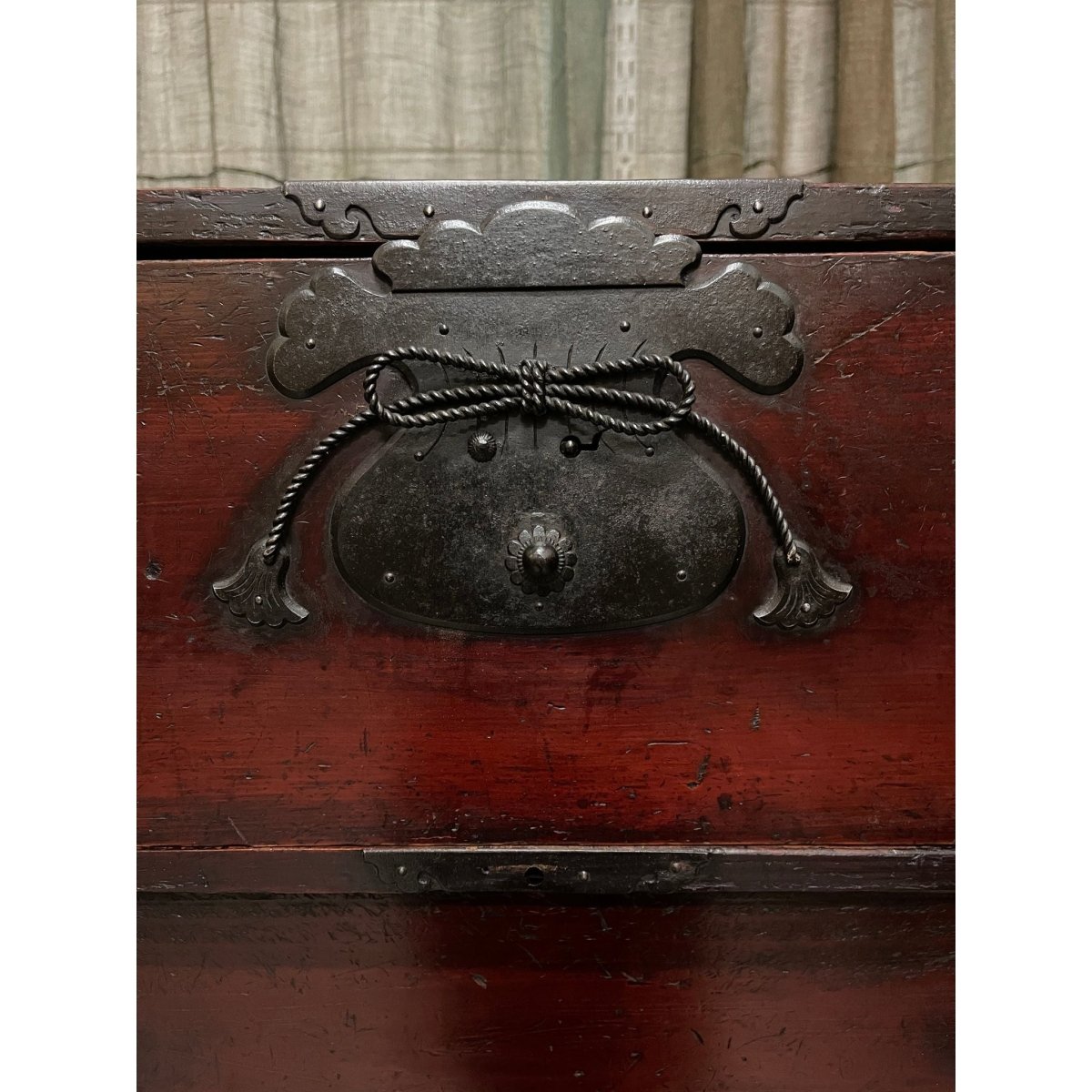Made from Japanese red pine with original deep red lacquer finish and iron hardware. Late Edo period, c.1850.