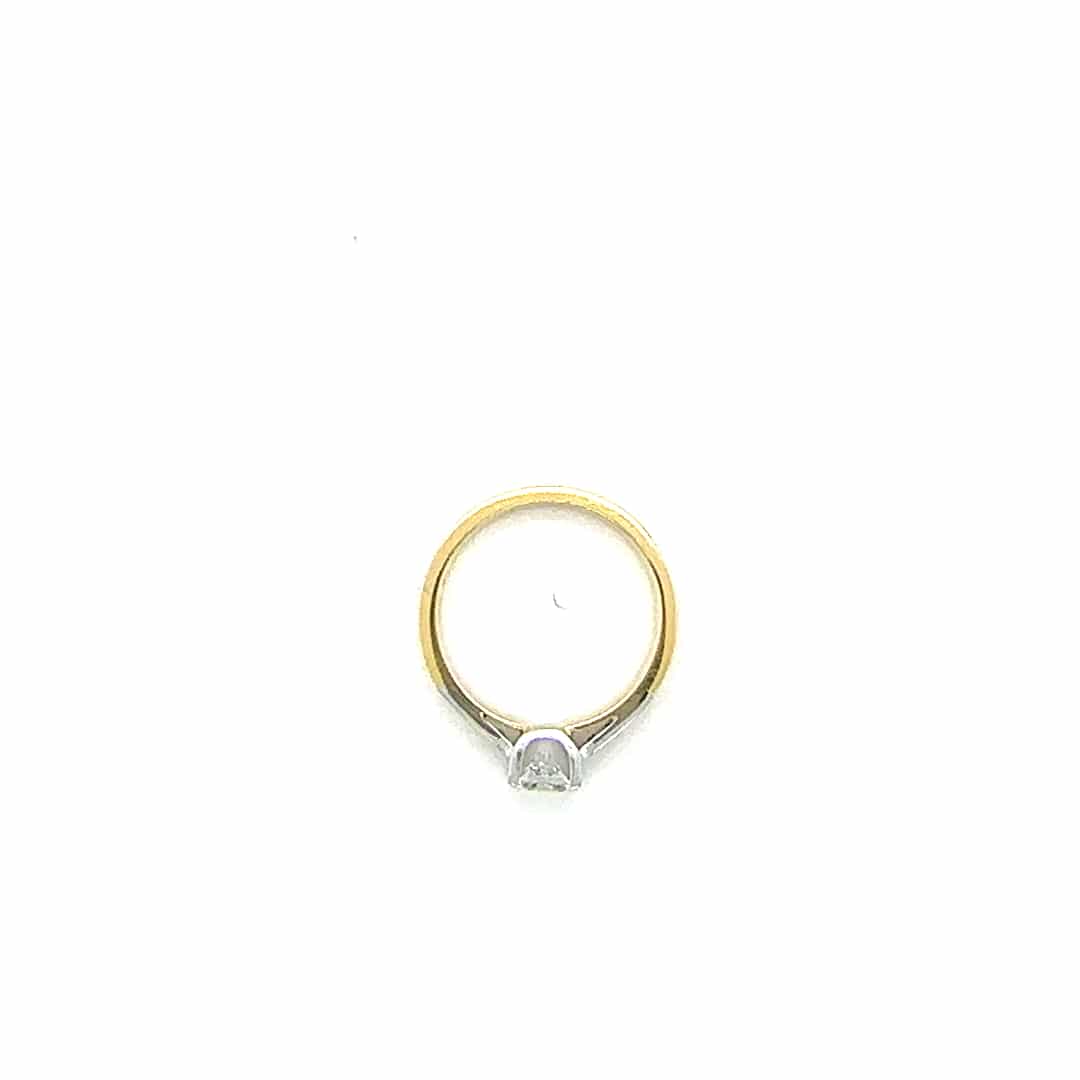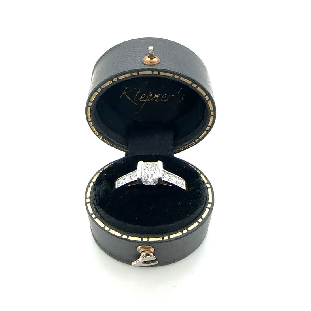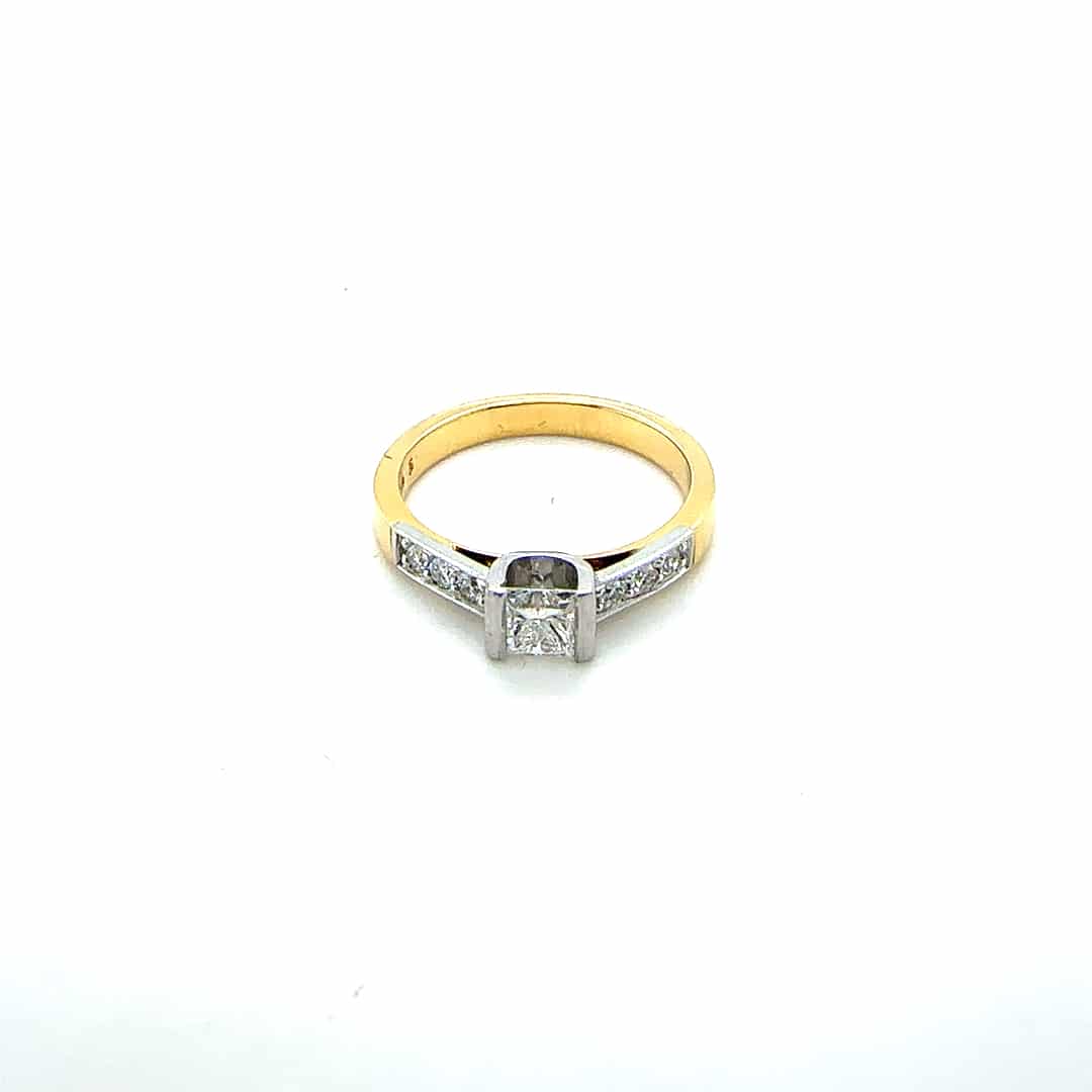This lovely 18ct gold ring features a 0.5ct princess cut diamond as the central stone, that is surrounded by 6 smaller diamonds to the shoulders. A lovely understated ring that is classically beautiful for everyday wear.