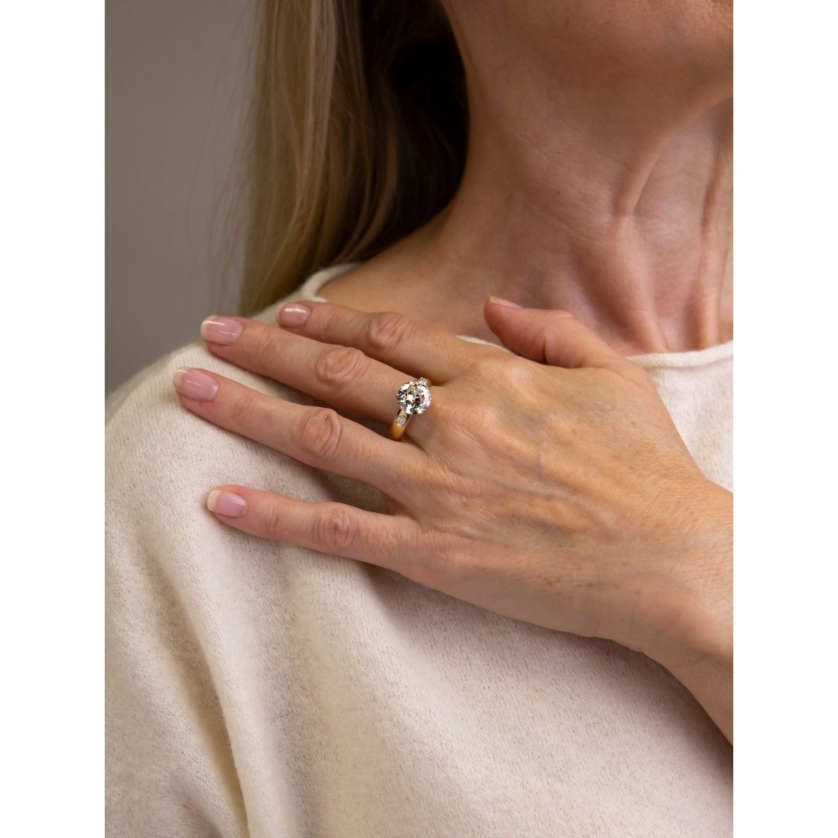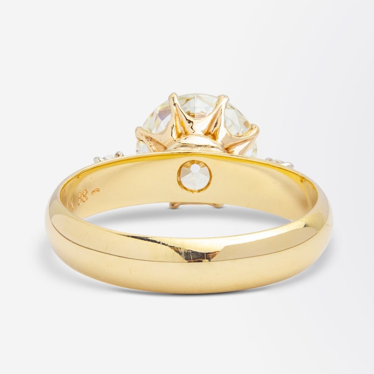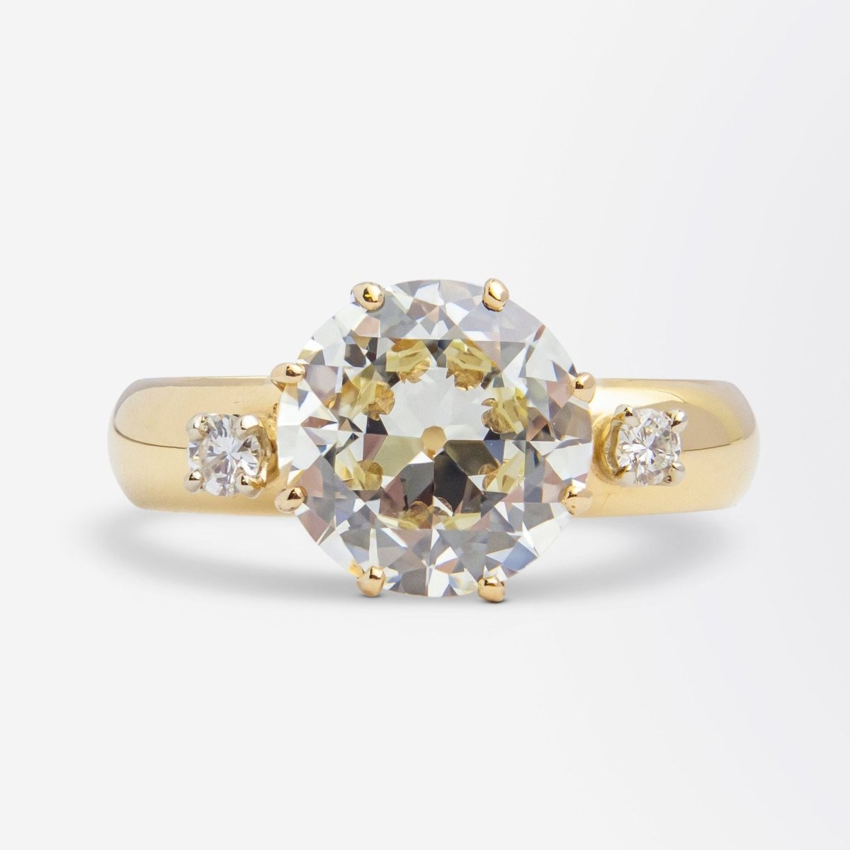 We love a big chunky old European cut diamond, and this ring is set with an exceptional example. The contemporary ring mount has been crafted in 14 karat yellow gold and set centrally with a 3.30 carat old European cut diamond of M colour and VVS1 clarity which has an accompanying GIA certificate. The ring's central diamond has been eight claw set and features a four claw set modern brilliant cut diamond on each shoulder graded as H/I colour and VS-SI clarity totalling 0.13 carat together. Whilst the ring is of contemporary manufacture it is most likely that the central diamond has been repurposed from an older piece of jewellery from the early part of the 20th century. The images show the stone as being more grey in colour than it shows in real life, and it must be noted that it fronts up much nicer in person. The current ring size of this piece is quite large, however it can be reduced in size quite dramatically if required due to the simplicity of the band. A knockout old European cut diamond that could be worn every day with such ease.