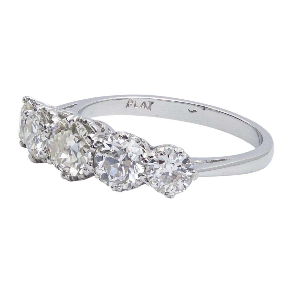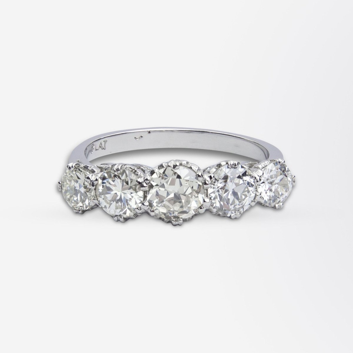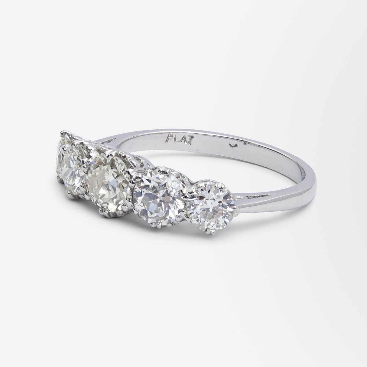 This ring whilst relatively modern in manufacture has been crafted using old European cut diamonds and is in the antique taste. The platinum setting has been mounted with five old European cut diamonds in the taste of a 'London Bridge' ring. The diamonds which range from G to J in colour and from VS1 to I1 in clarity total 2.03 carat. Because of the range of colour and clarity in the stones it is likely that the stones have been pulled from various pieces of antique jewellery and combined to make this ring of recent manufacture. The piece presents in very good order and other than one of the stones having a slight flea bite to the girdle there are no other apparent areas of note and is ready for everyday wear. Whilst this ring utilises old diamonds it however could be purposed beautifully as a modern day engagement ring for a bride who doesn't necessarily want a solitaire stone.