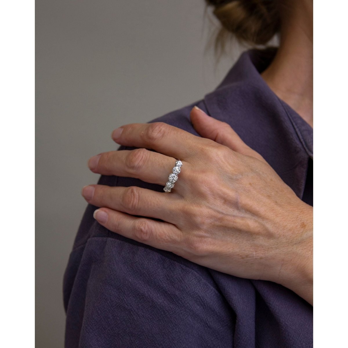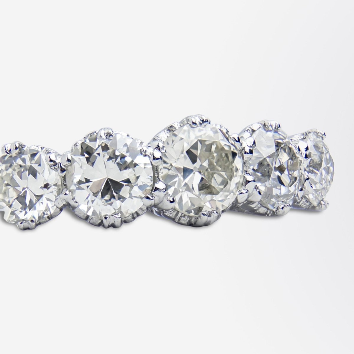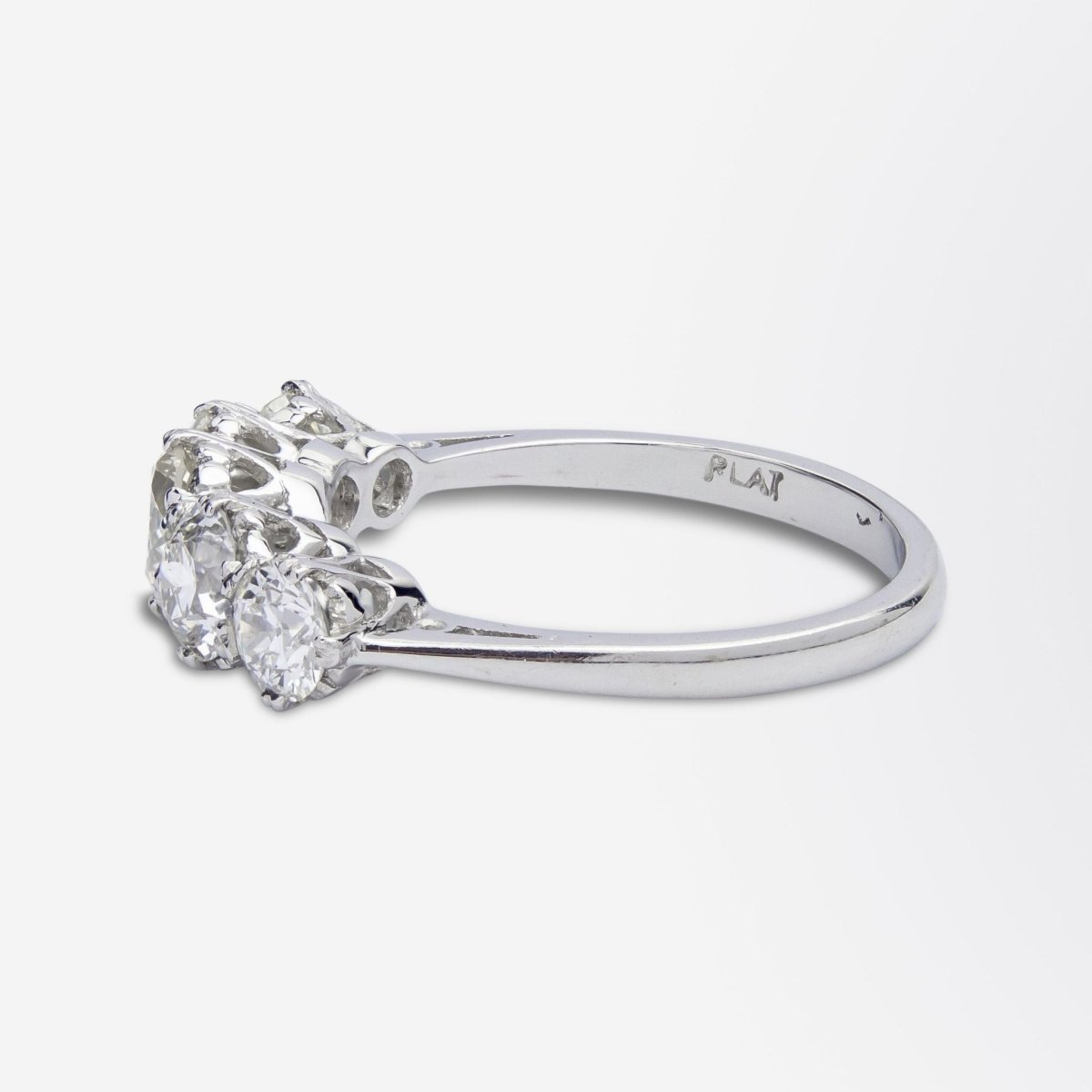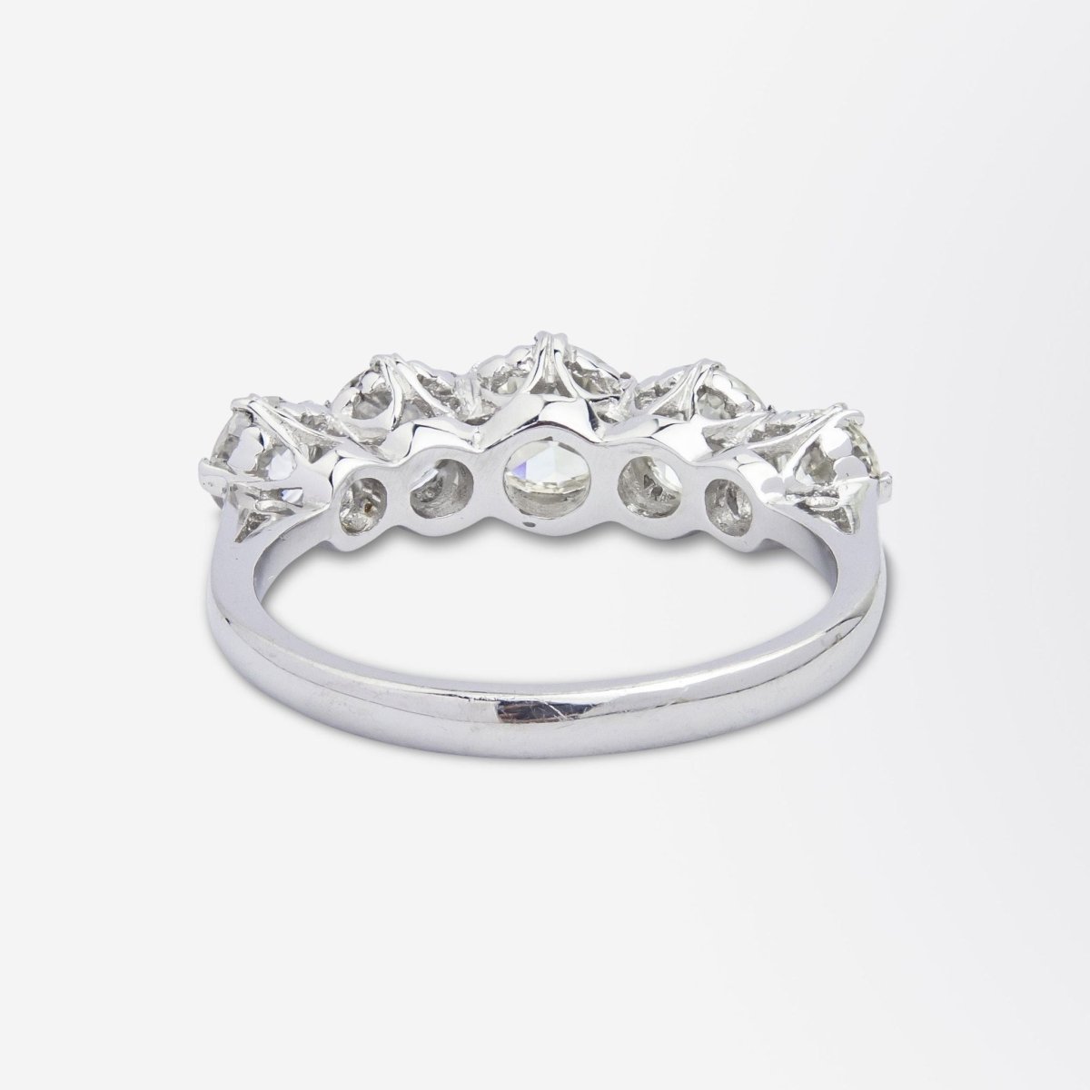 This ring whilst relatively modern in manufacture has been crafted using old European cut diamonds and is in the antique taste. The platinum setting has been mounted with five old European cut diamonds in the taste of a 'London Bridge' ring. The diamonds which range from G to J in colour and from VS1 to I1 in clarity total 2.03 carat. Because of the range of colour and clarity in the stones it is likely that the stones have been pulled from various pieces of antique jewellery and combined to make this ring of recent manufacture. The piece presents in very good order and other than one of the stones having a slight flea bite to the girdle there are no other apparent areas of note and is ready for everyday wear. Whilst this ring utilises old diamonds it however could be purposed beautifully as a modern day engagement ring for a bride who doesn't necessarily want a solitaire stone.
