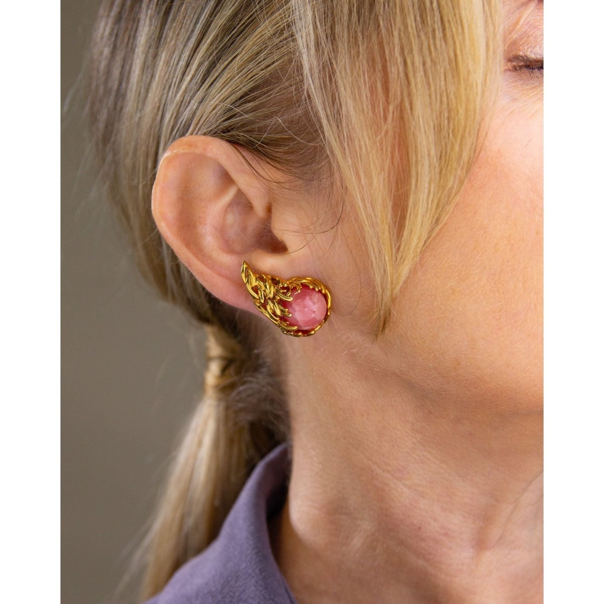 Crafted from 18 karat yellow gold, this pair of ear clips have been designed to be interchangeable and convert into 8 different pairs of earrings. Designed by the talented Gilbert Albert (1930-2019) who was born in Switzerland, the gold 'comma' style ear clips have a section that allows small spheres of semiprecious stones to be inserted, allowing the pair to transform into 8 different looks. The small 13 milimeter spheres comprise of rock crystal, black onyx, blue chalcedony, rhodochrosite, amazonite, red resin, ruby zoisite and a further unidentified pair. The pair have clip fittings to the rear which hold the spheres in place, and feature a small silicone insert that softens the hold on the ear. Gilbert Albert was a jeweller known for his extremely contemporary designs, often utilising unusual materials and even at one point designed watches for Omega. The wonderful thing about this pair of earrings is that you can change the look to match the occasion - black onyx for an evening event or bright pink rhodochrosite for a summery cocktail party.