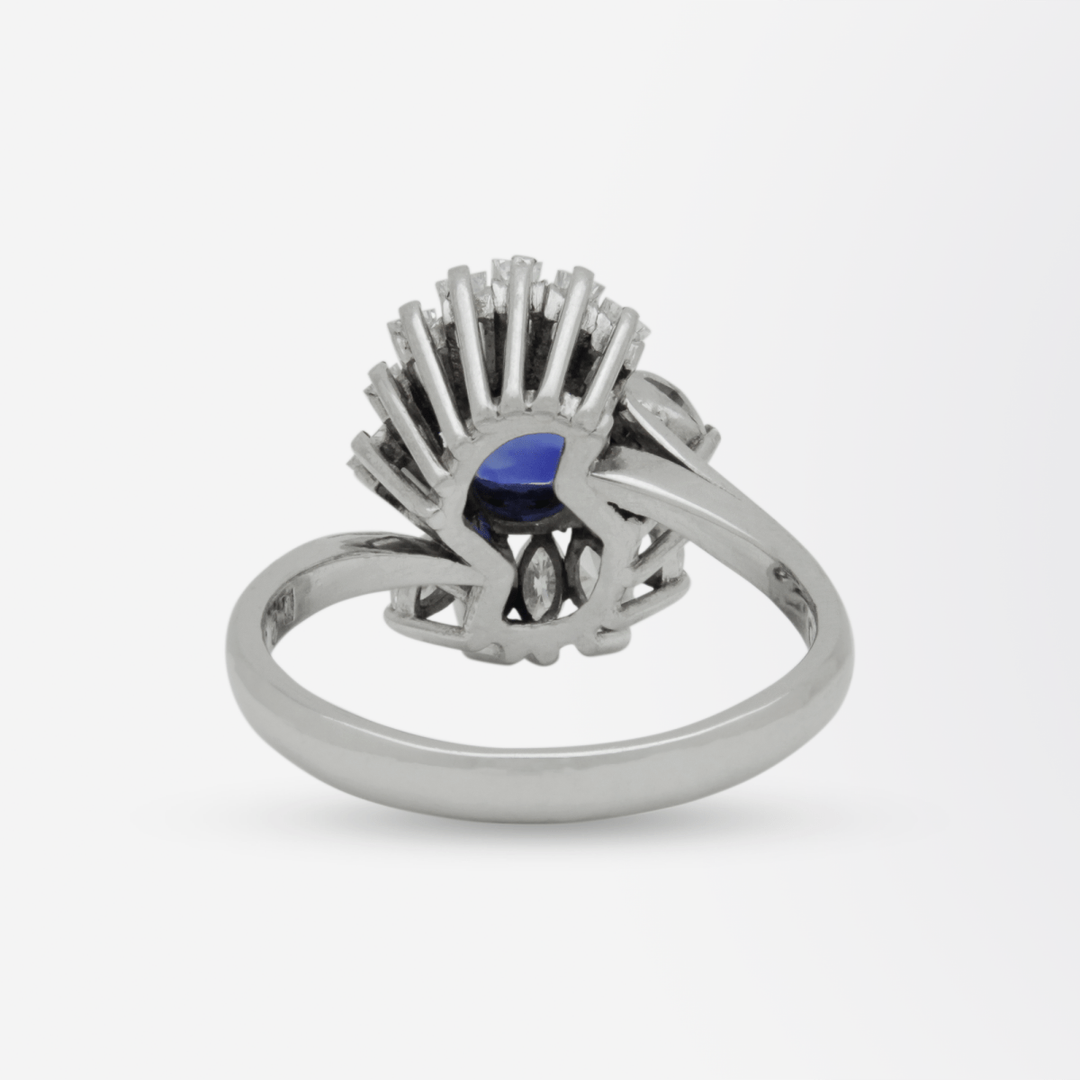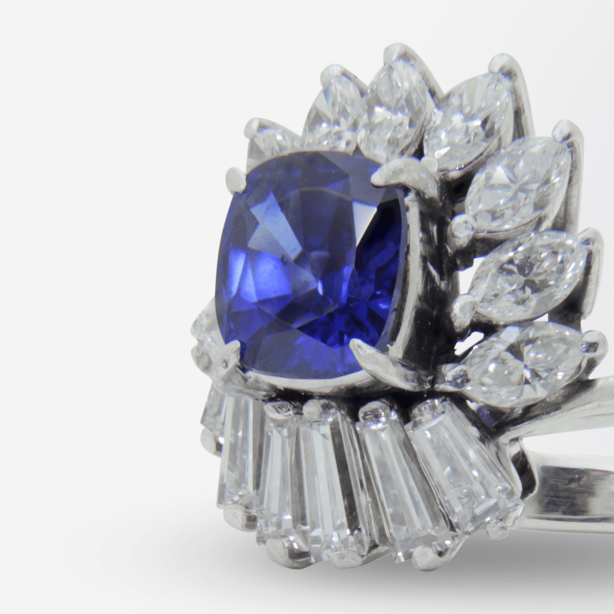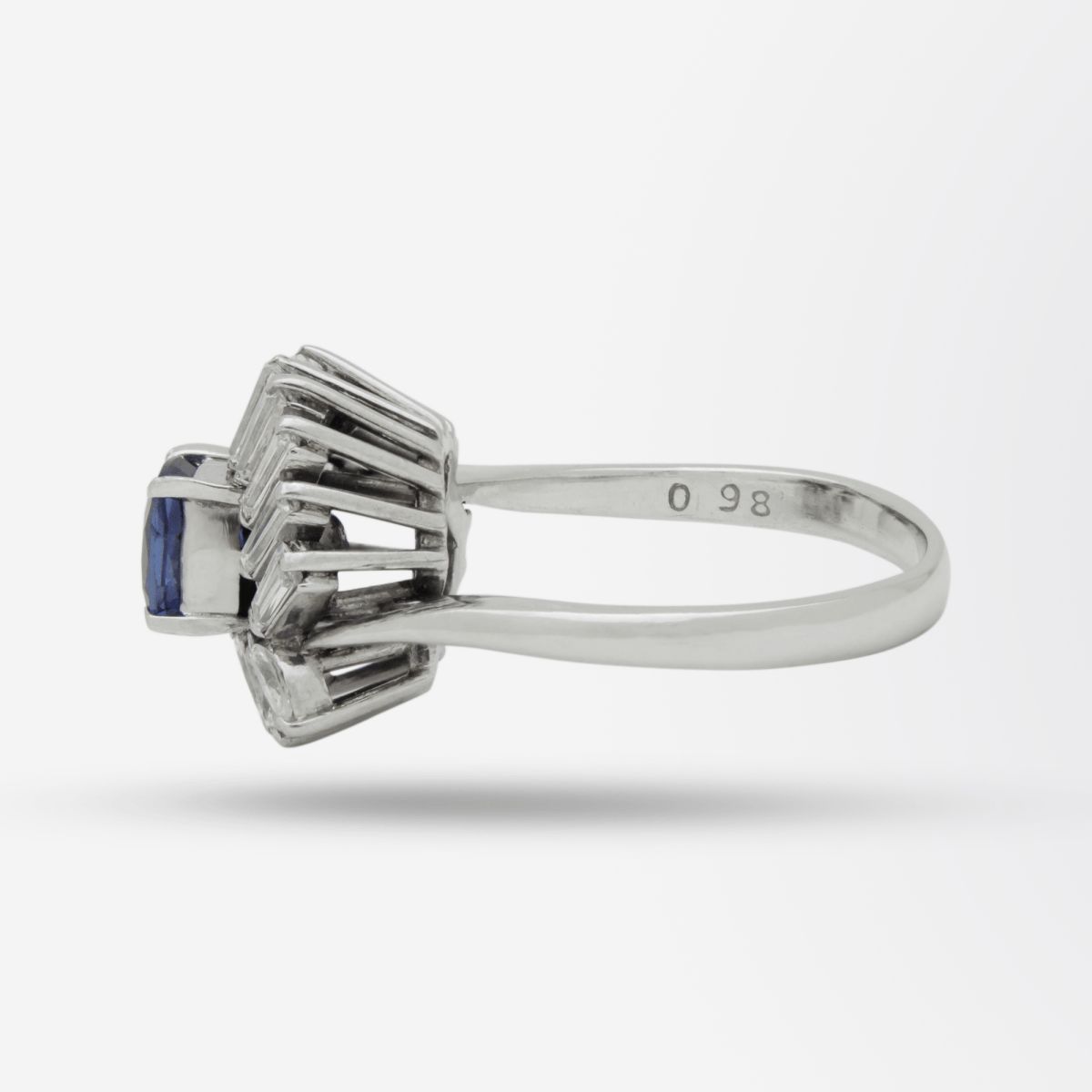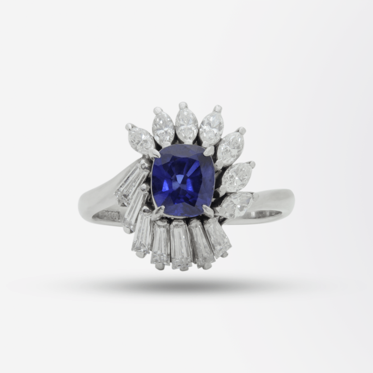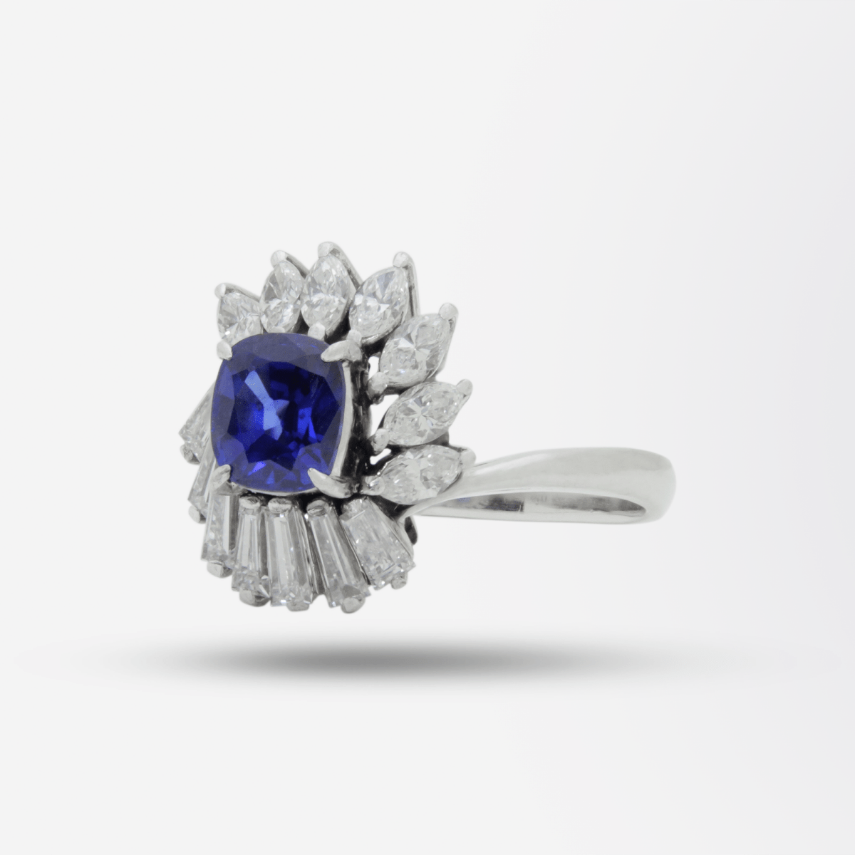 A fine ladies dress ring crafted from platinum and set with a sapphire and diamonds. The central sapphire is a 0.98 carat Cambodian cushion cut stone which has an accompanying GIA certification. Surrounding this sapphire is a mixture of tapered baguette and marquise diamonds all of G colour and VS clarity, forming a halo. The ring has been handmade and is beautifully crafted. This piece could be used as an engagement ring, or as an everyday ring given the durability of the stones and metal used.