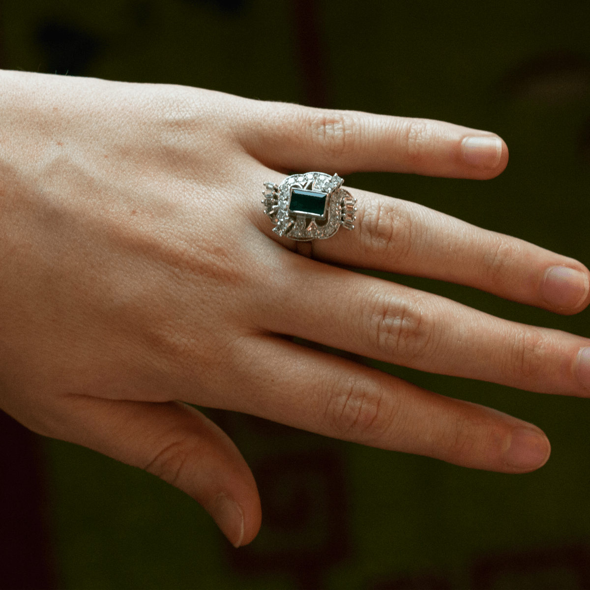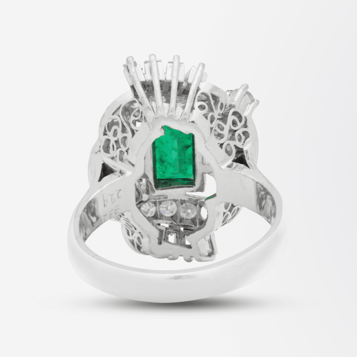 A beautifully crafted cocktail ring from the Retro Period of the 20th Century. This piece hand crafted from platinum centres on an octagonal cut emerald weighing 1.25 carat set in a rub-over setting. Surrounding this emerald is a sea of single cut and baguette cut diamonds of G/H colour and VS to SI clarity which have been set in a Retro style asymmetric 'swirl'. The platinum underside (gallery) of the ring is finely pierced almost appearing to mimic lacework. A really stunning dress ring which has aged beautifully and represents a time of cocktail parties and black tie balls.