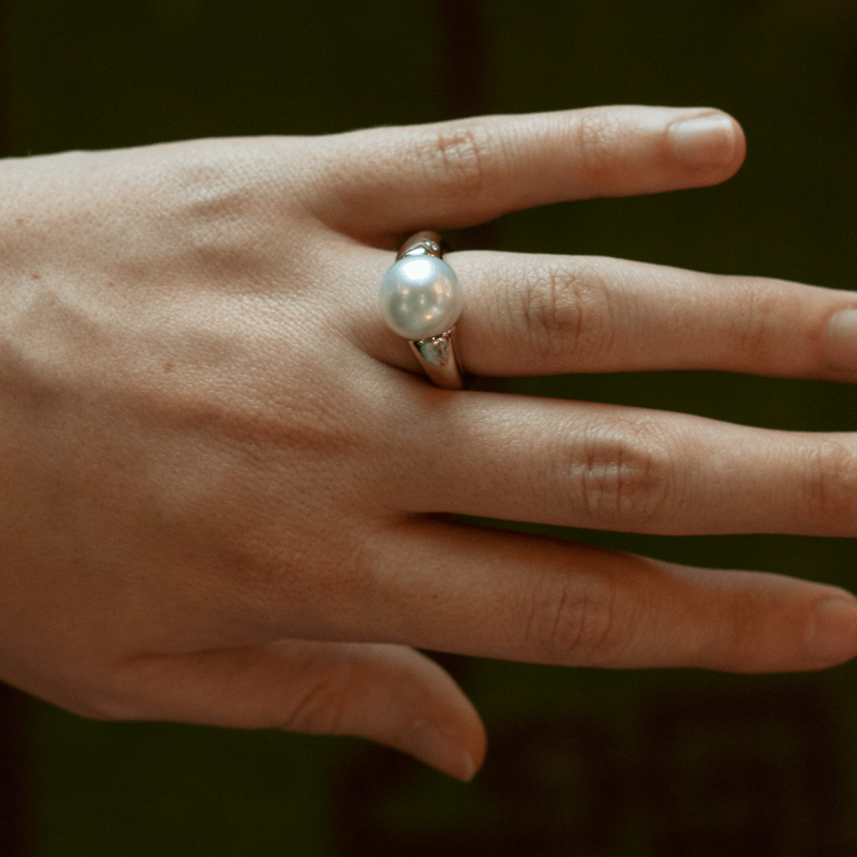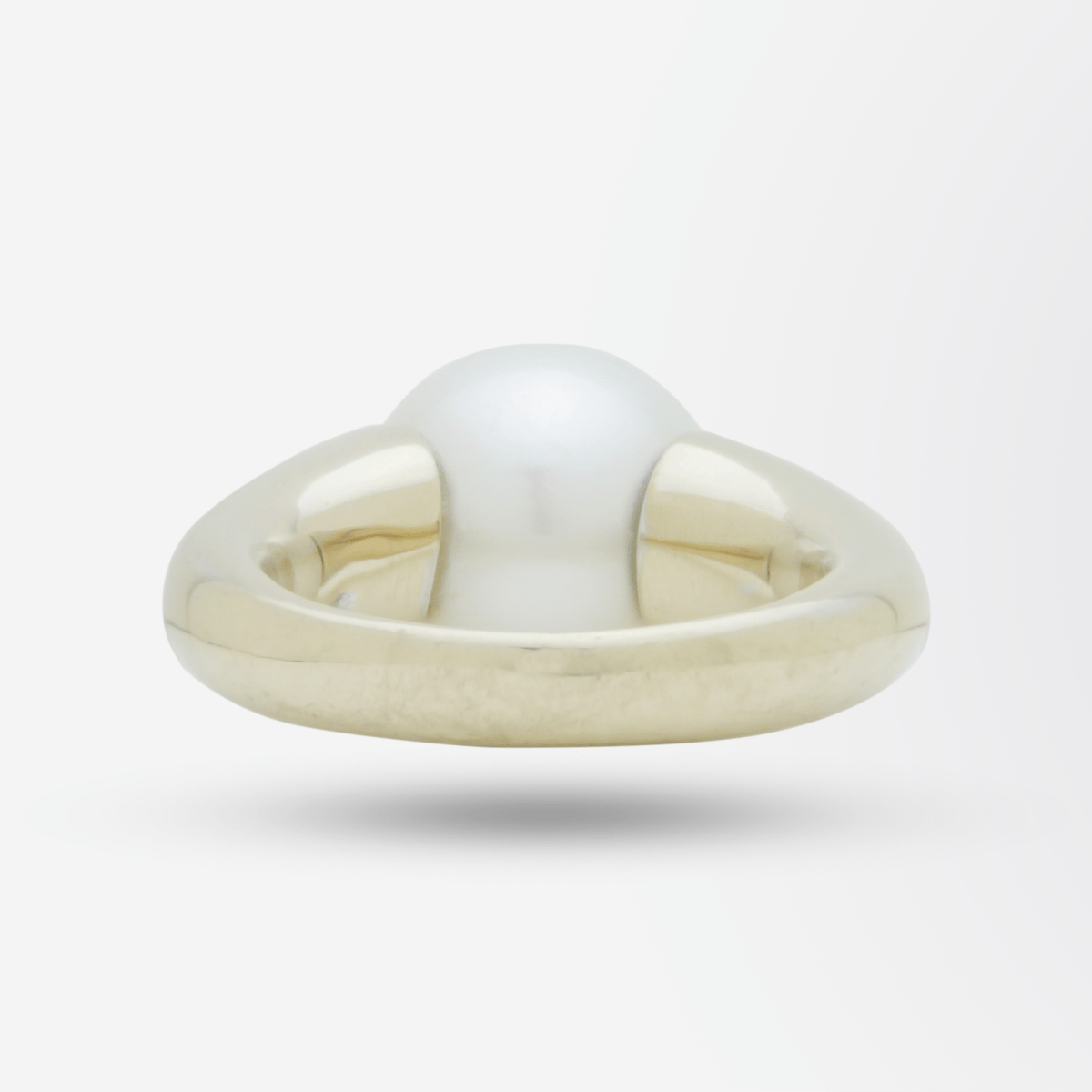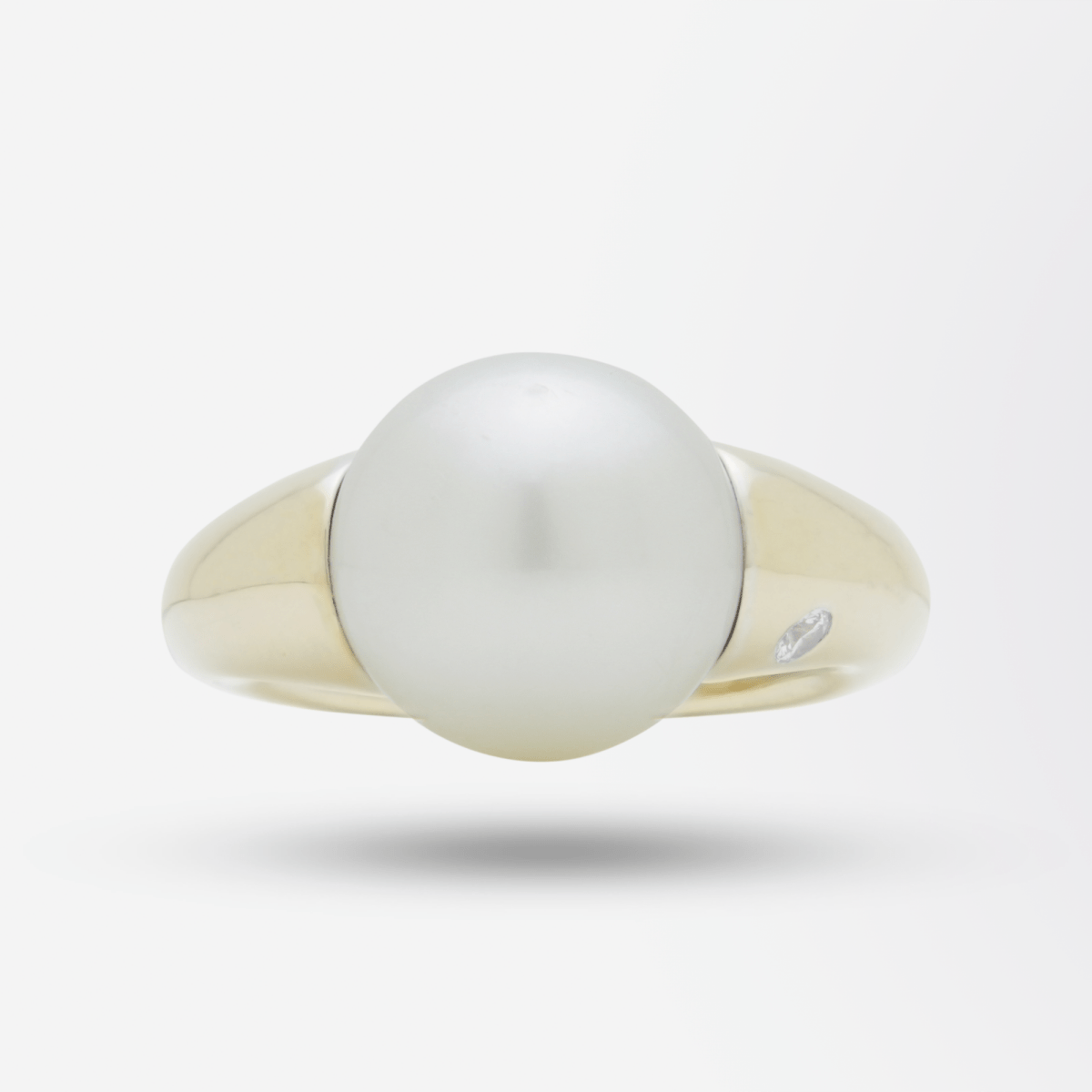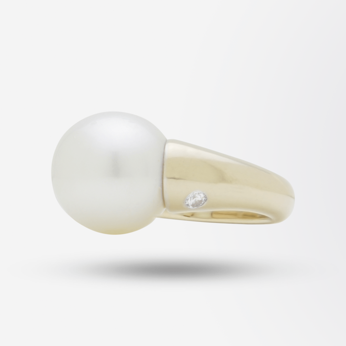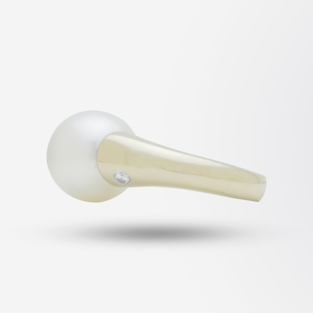 A really sleek and contemporary gold, diamond and South Sea Pearl ring. The tapered shank crafted from rhodium plated 18 karat white gold features a central pin set South Seal pearl which has good lustre and minimal surface blemishes. To one shoulder is set a single brilliant cut G colour and SI clarity diamond which has been hammer set. The sleek ring has a very smooth and natural shape and is one of the most contemporary rings in our collection, both in terms of age and aesthetics. A beautiful piece for someone who likes 'no fuss' simple jewellery.