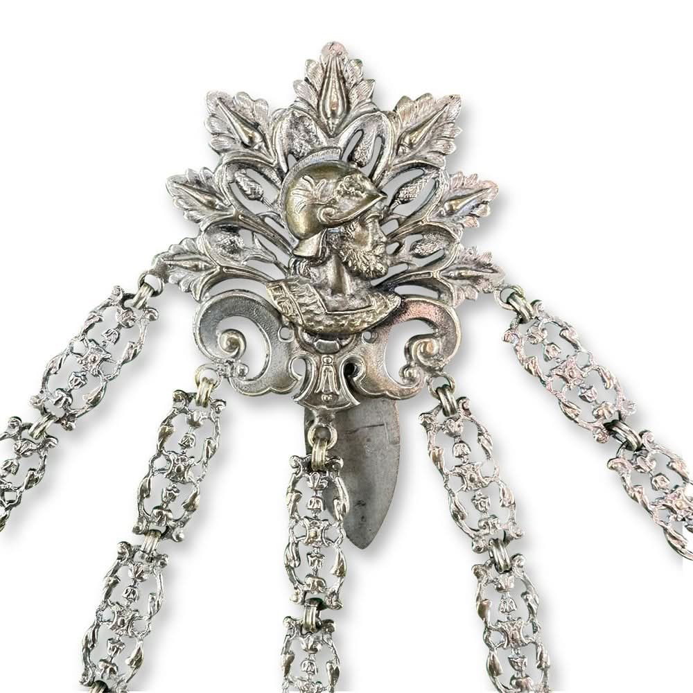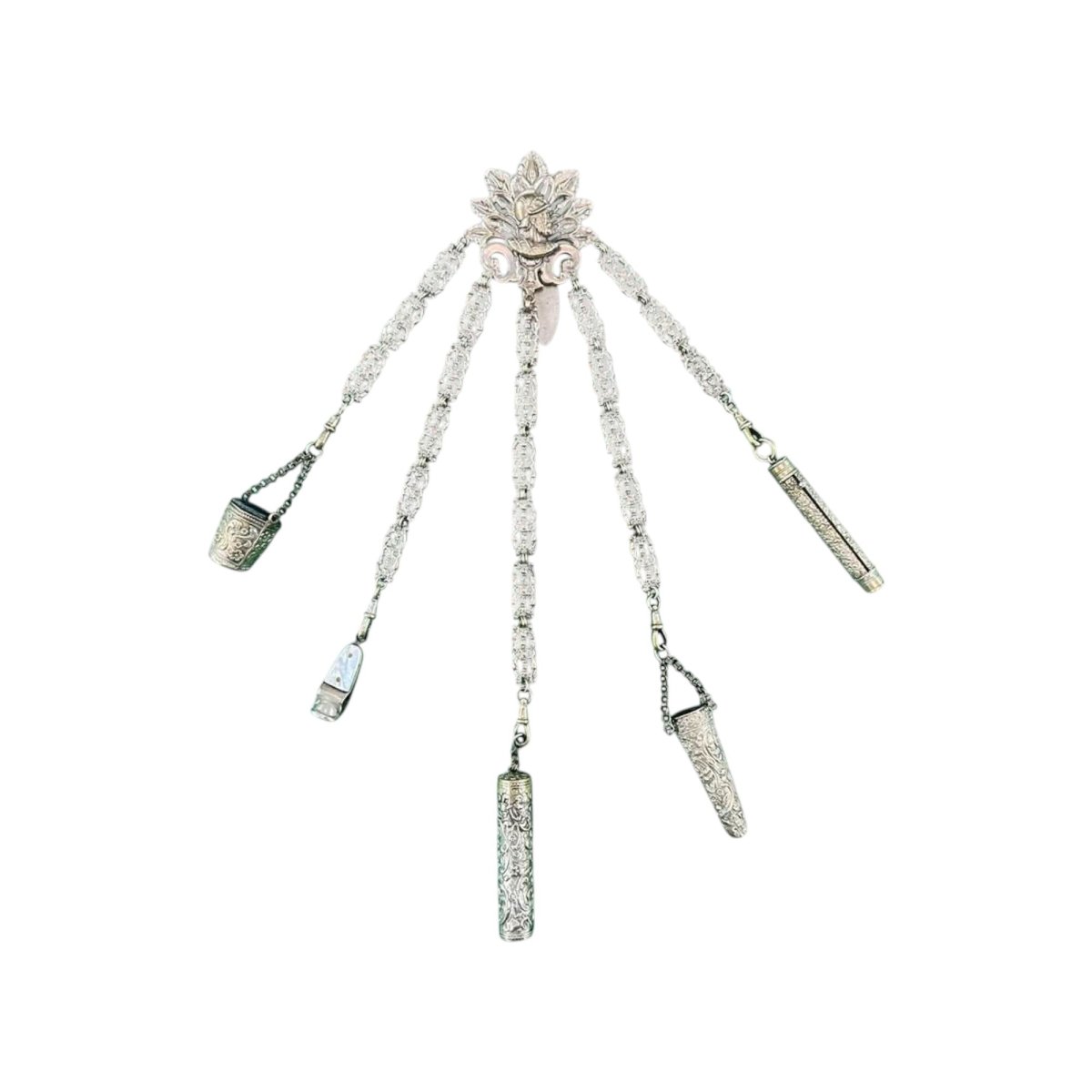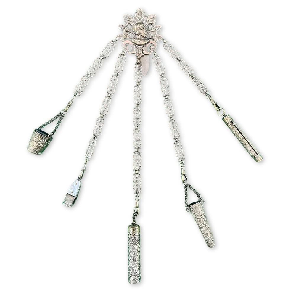Made from silver plate, this piece features a central clip to attach to one’s belt with the head of a knight. From this clasp are 5 chains or branches holding a thimble, a sheath for scissors, a pencil holder, a sewing needle holder, and a cigar cutter.