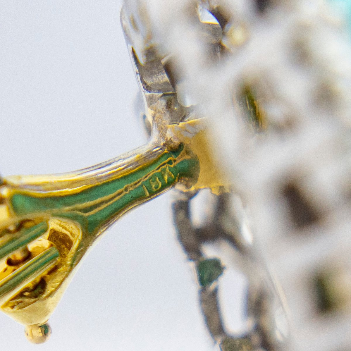 Crafted from 18 karat white and yellow gold, this pair of exquisite ear clips are set with deep blue turquoise and diamonds. The ear clips are shaped like a teardrop and each centre on a pear shaped cabochon piece of what is very likely Persian turquoise. These pieces of turquoise have been beautifully matched and are each five claw set with yellow gold. Surrounding each turquoise drop are 20 round brilliant cut diamonds which graduate in size to the very bottom of each ear clip where the largest stone is present. The two largest stones in the pair are of F/G colour and SI-I1 clarity and weigh approximately 0.45 carat each. The balance of the diamonds in the clips are each of F-I colour and VS-SI clarity, and combined with the two larger stones amass approximately 4.90 carat. The diamonds are all claw set in white gold which shows up their colour beautifully. To the rear each piece is fitted with a yellow gold keyhole clip, which are both working well and are secure, ensuring they stay firmly on the ear. The quality of both the turquoise and the diamonds in this pair of ear clips is exceptional and they would be an incredible addition to an evening gown for a formal event.