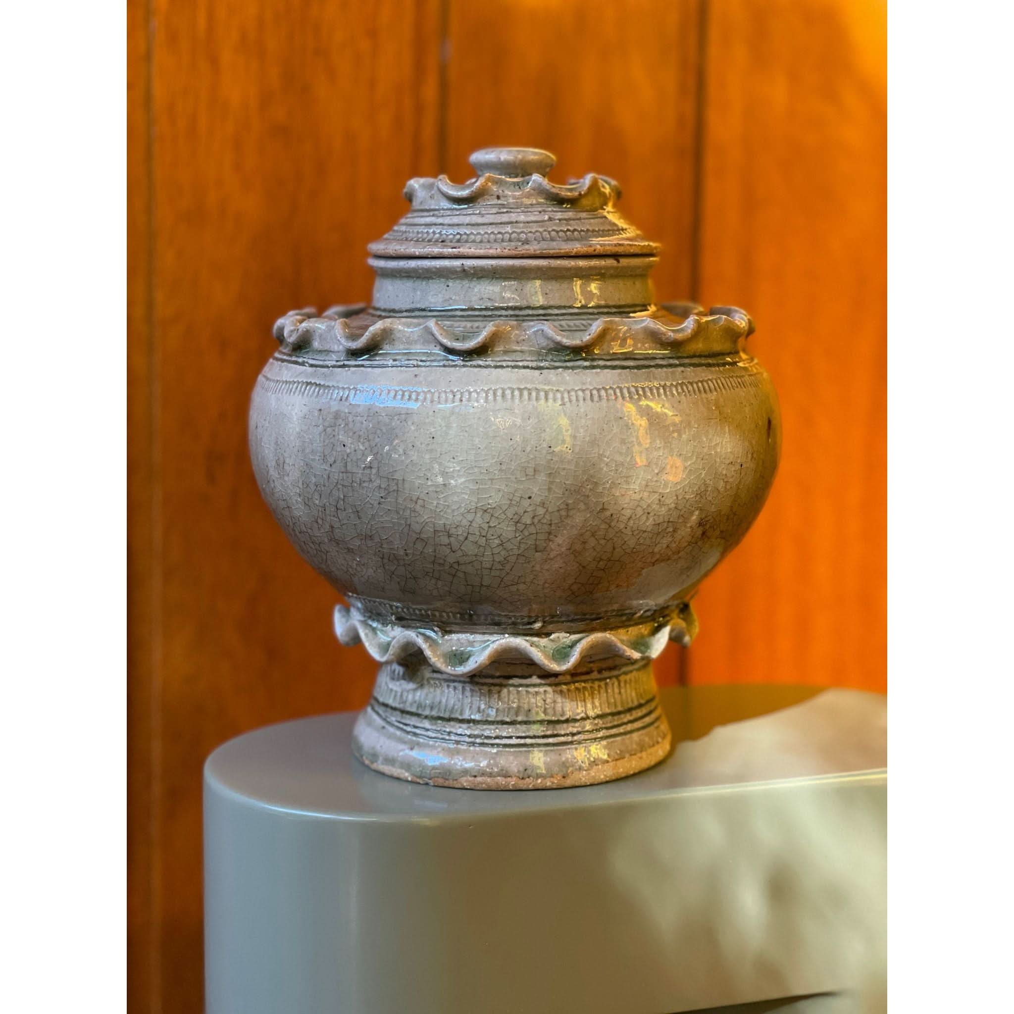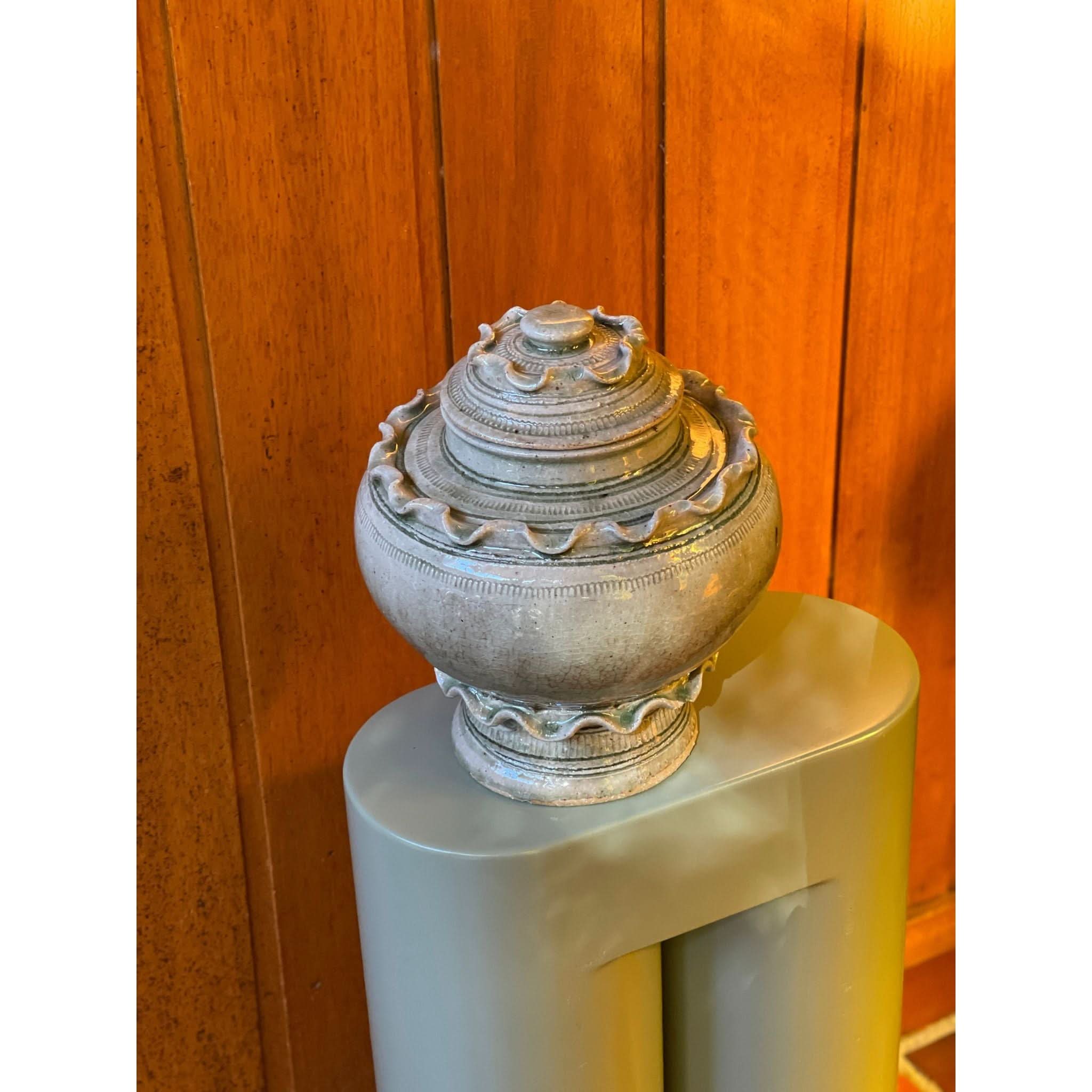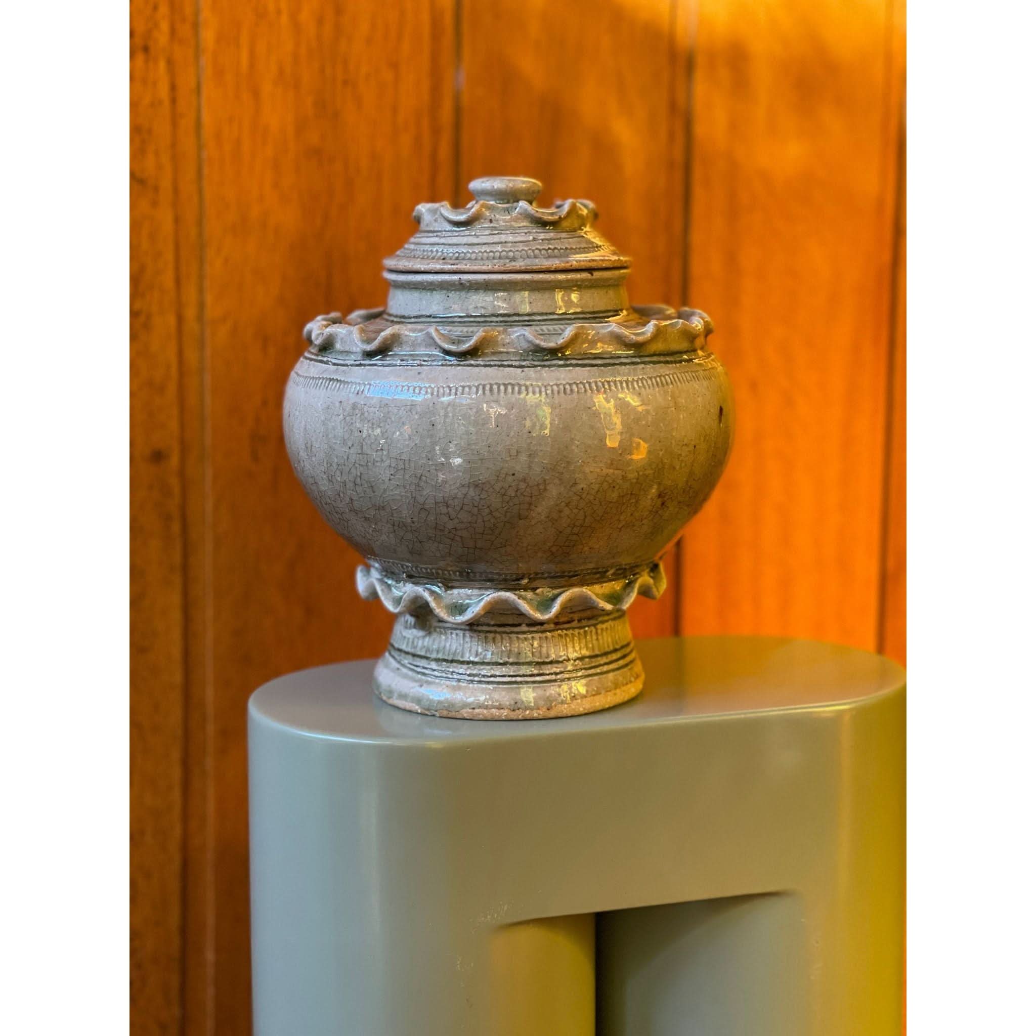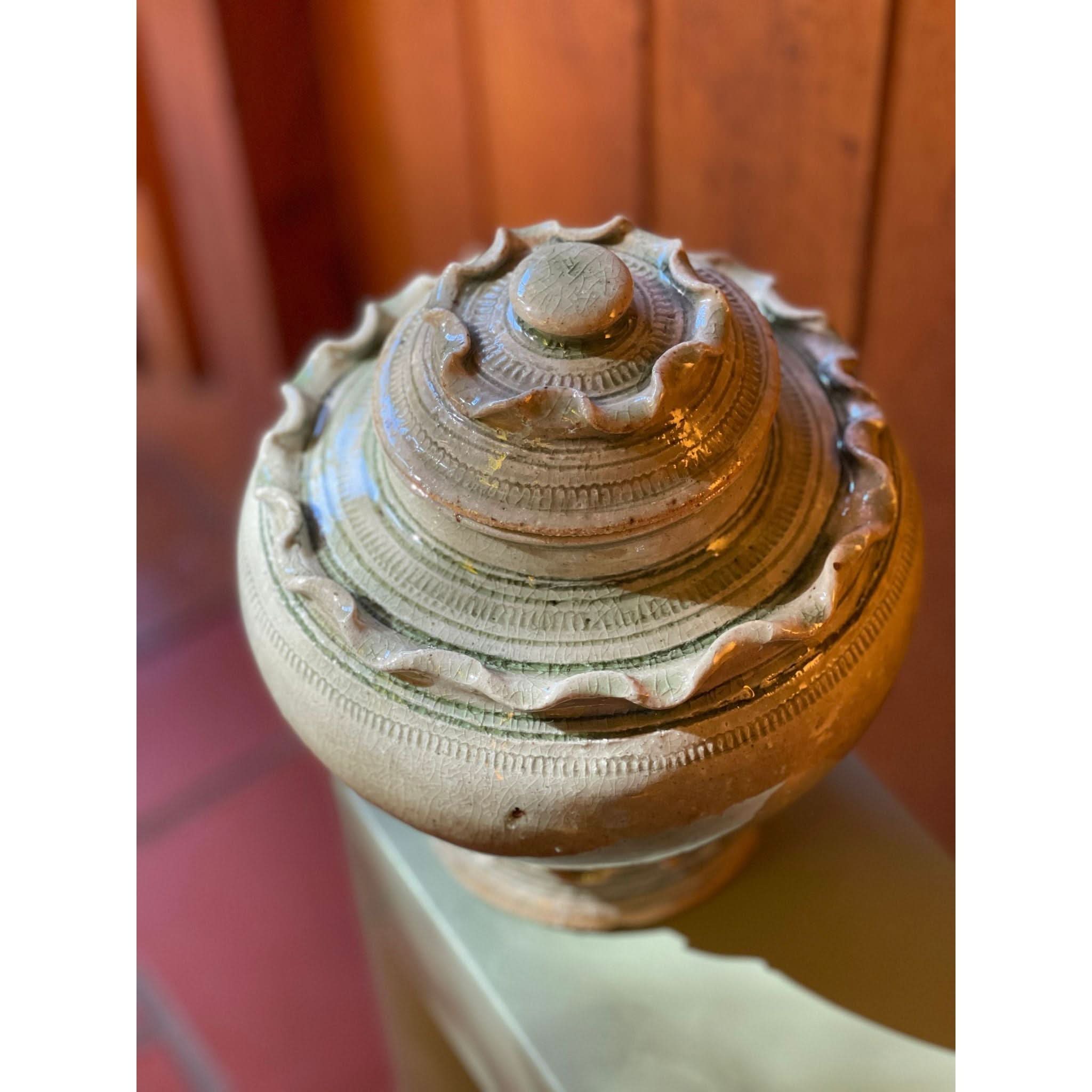 function and beauty! beautiful frill ceramic vessel with lid.