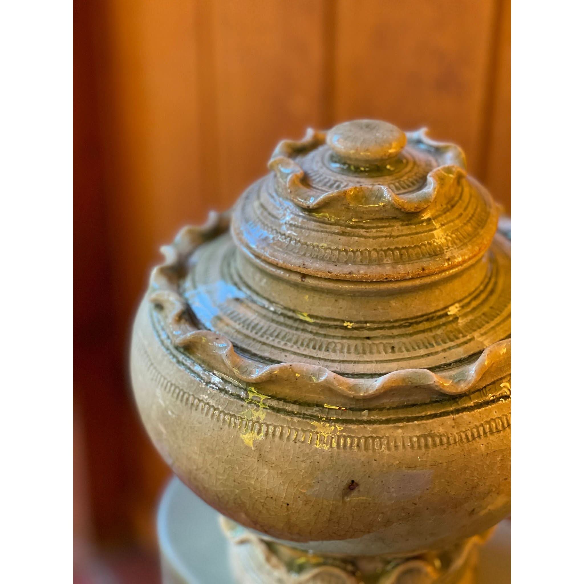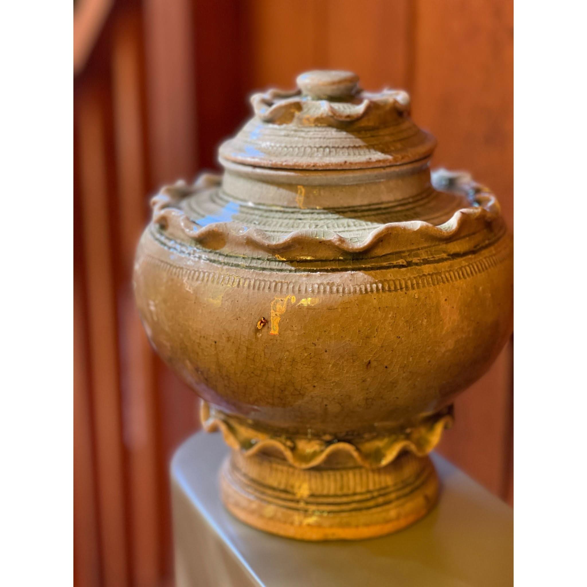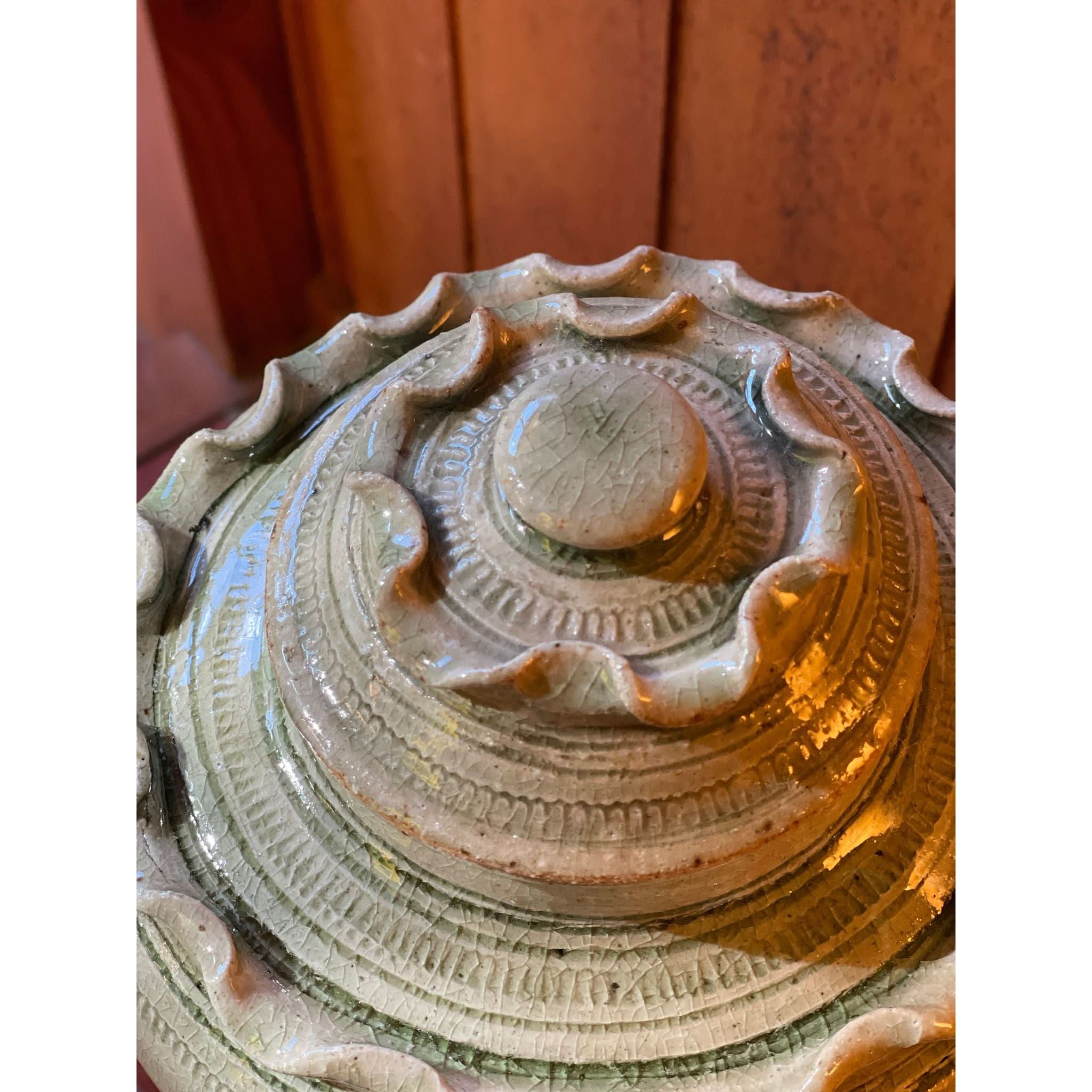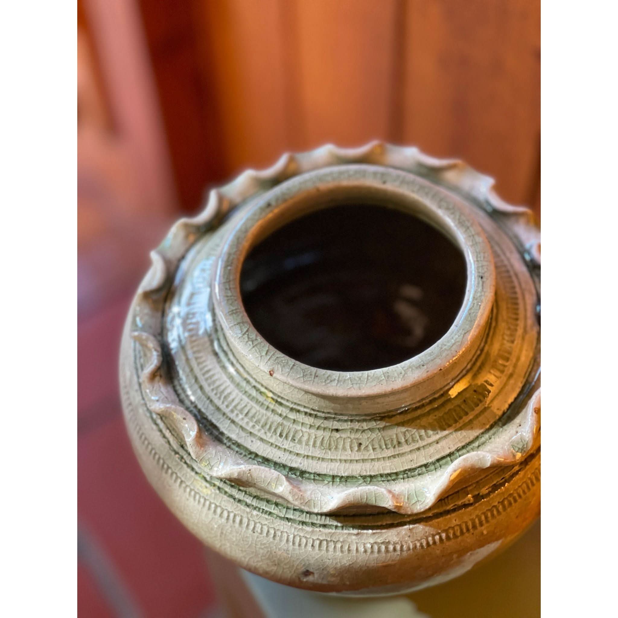 function and beauty! beautiful frill ceramic vessel with lid.
