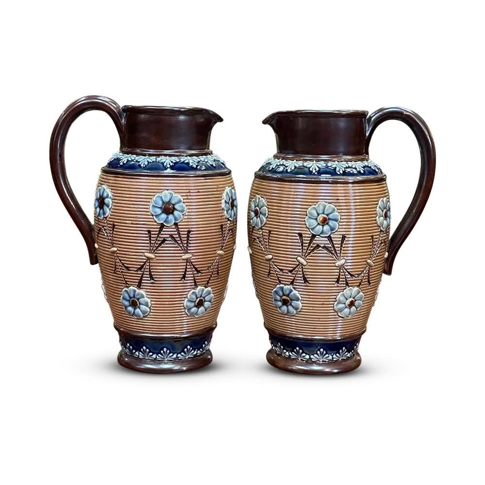 Hailing from England and made circa 1900, this lovely solid pair of jugs are quintessentially Doulton! Featuring a rich blue glaze and a floral design, this pair would be perfect as a kitchen decoration.