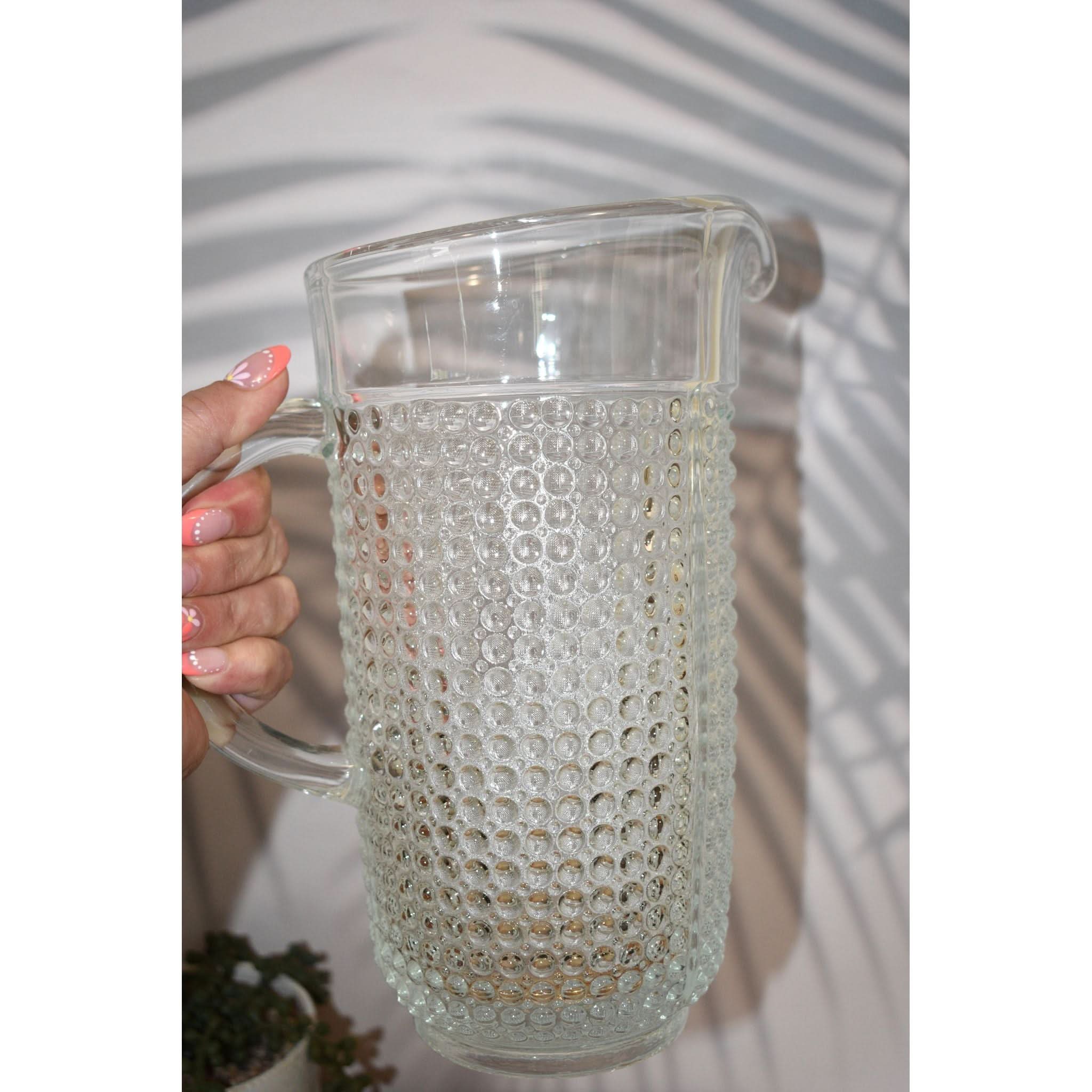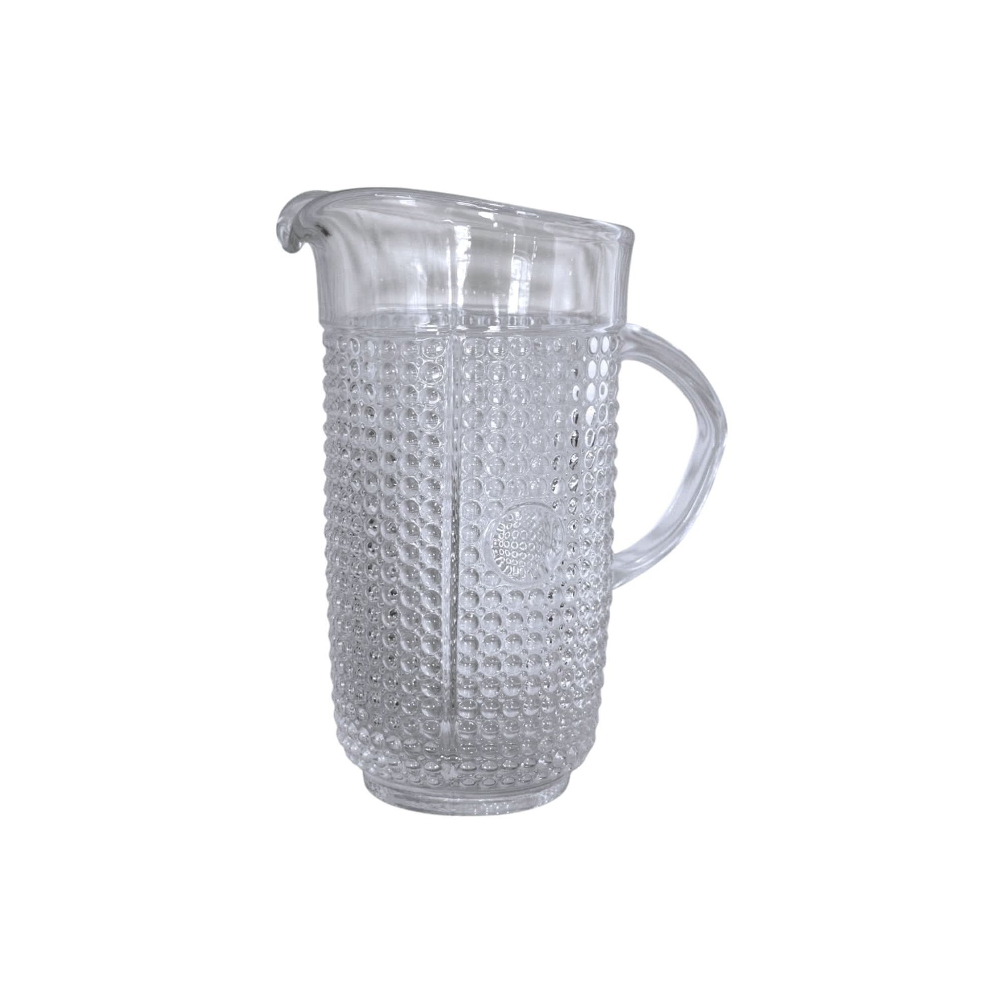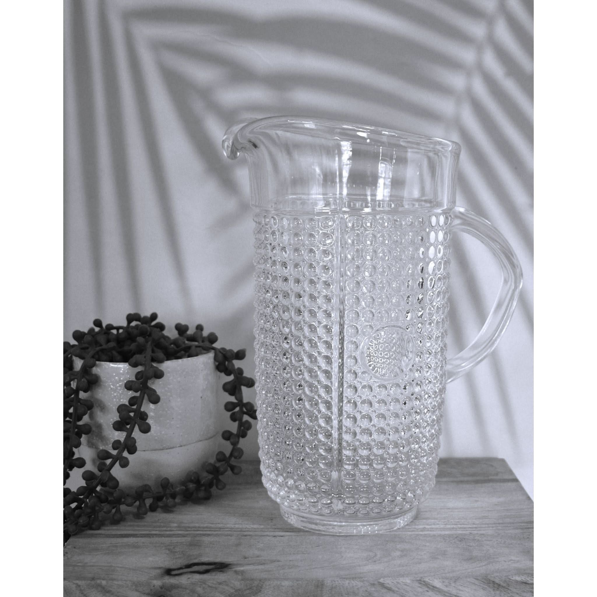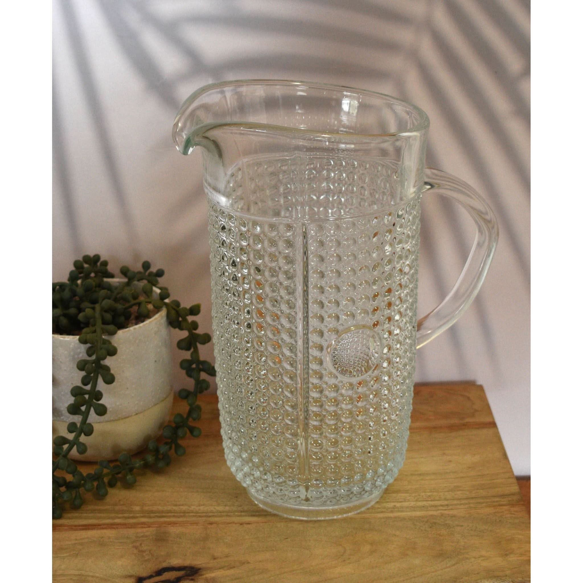 A rare opportunity to acquire this stunning pitcher from the 'Perlicka ' collection designed in 1977 by Adolf Matura for the Libochovice glassworks. The pitcher features a raised beaded decoration with a single concave lens to one side. The lens detail projects beyond the body of the pitcher.