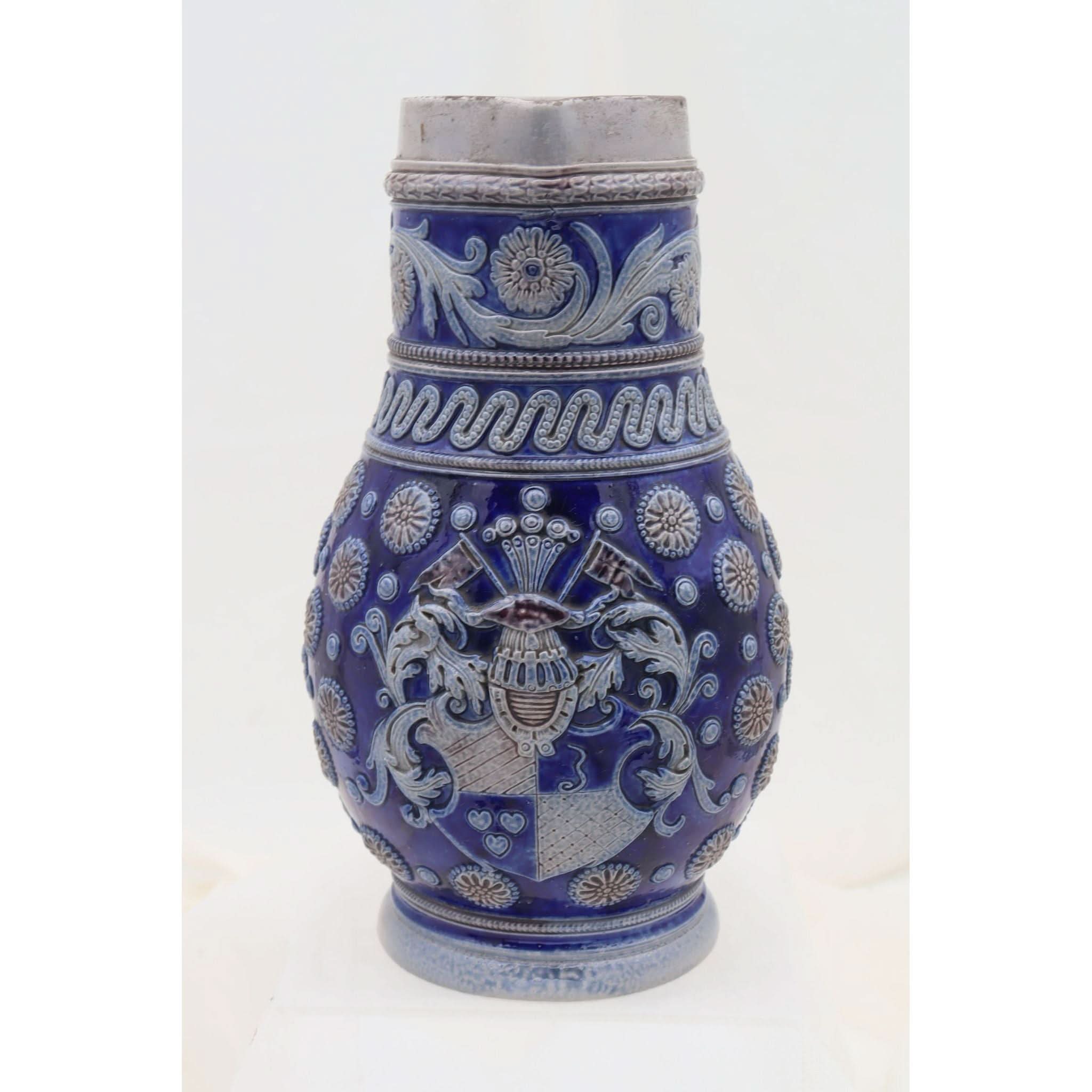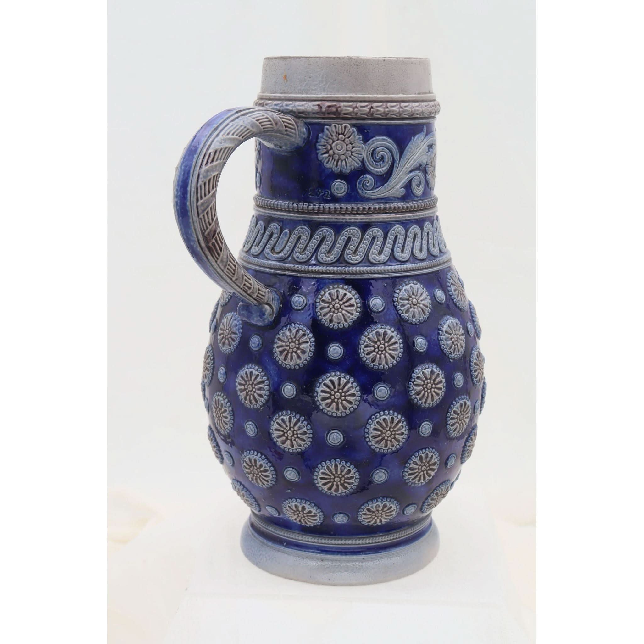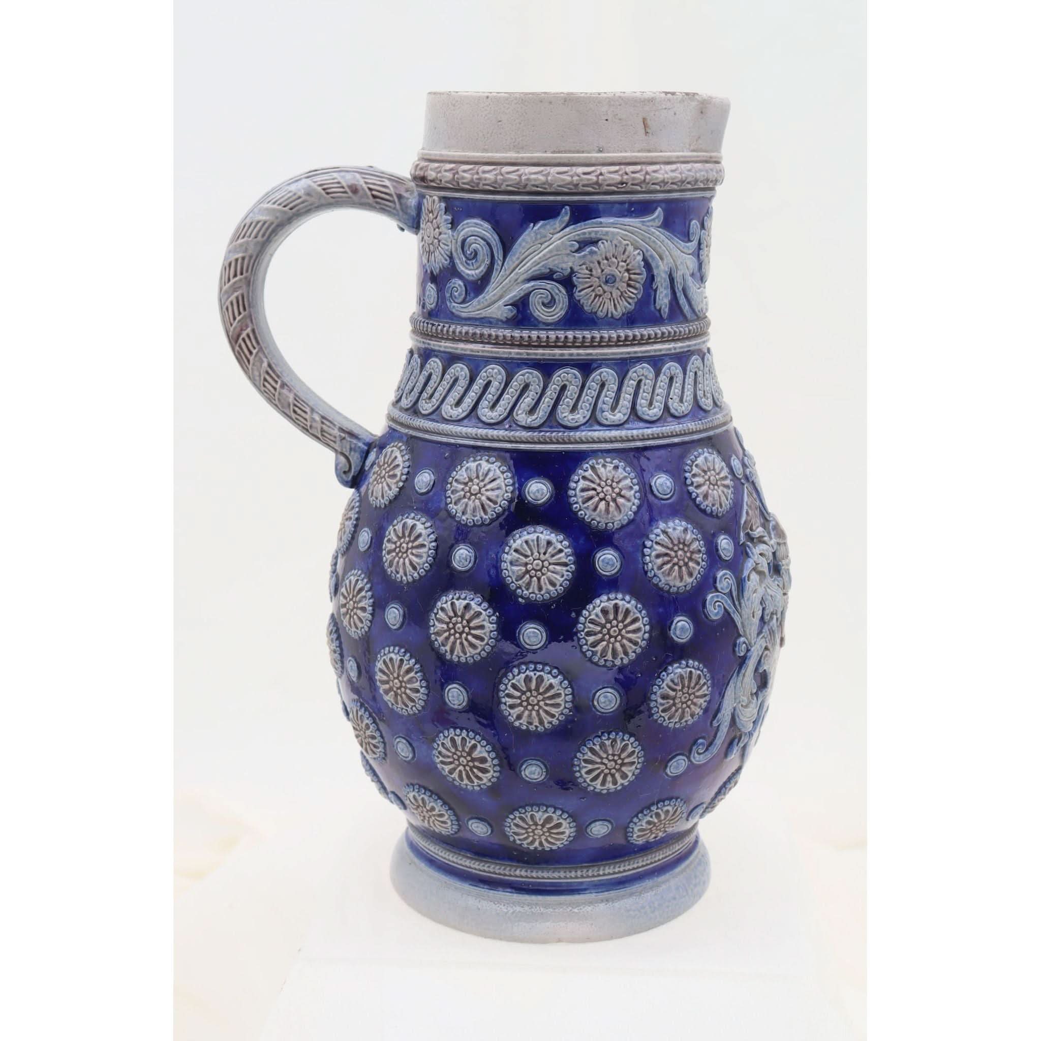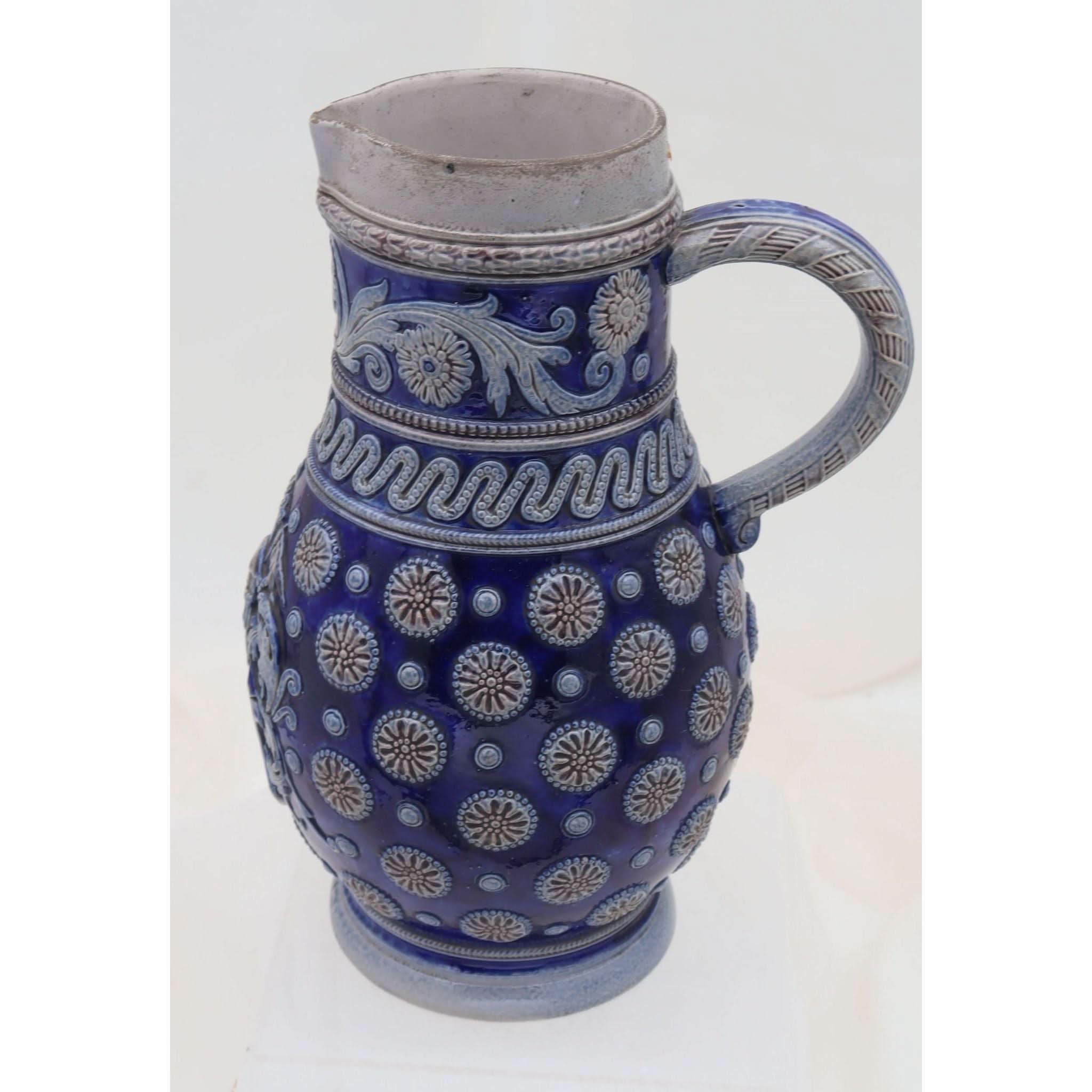 On the front of this Westerwald stoneware jug, amongst all the other raised decoration is a raised faux coat of arms. Parts of this armorial and the other decor on the jug are coloured in a rich cobalt blue with dashes of a manganese brown, set against the grey of the body. Probably a beer jug, it stands 258 mm (10 inches) high and has a diameter of 152 mm (6 inches). The base is marked with an impressed shape number 1242, which also appears where the top of the handle meets the rim. This is probably from the factory of Johann Wilhelm Remy of Hohr, then in Prussia. It is in very good condition and dates from around 1890.