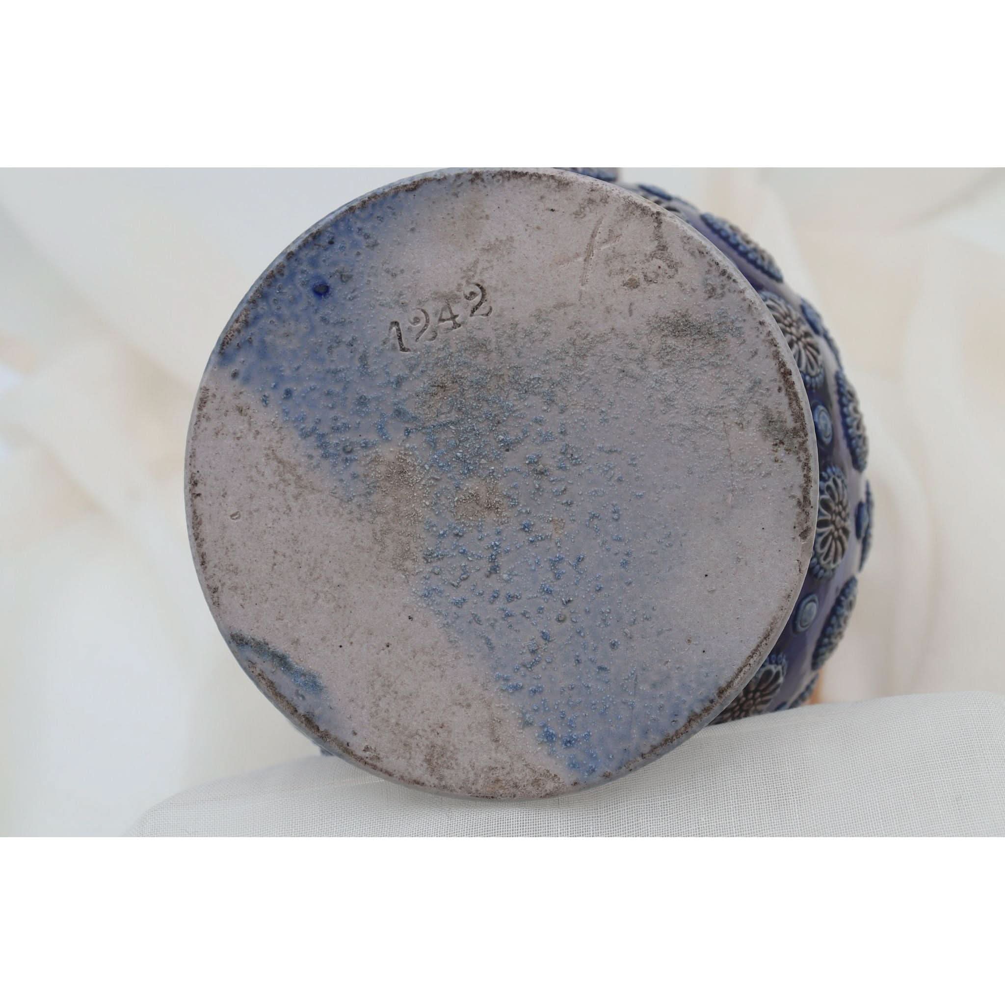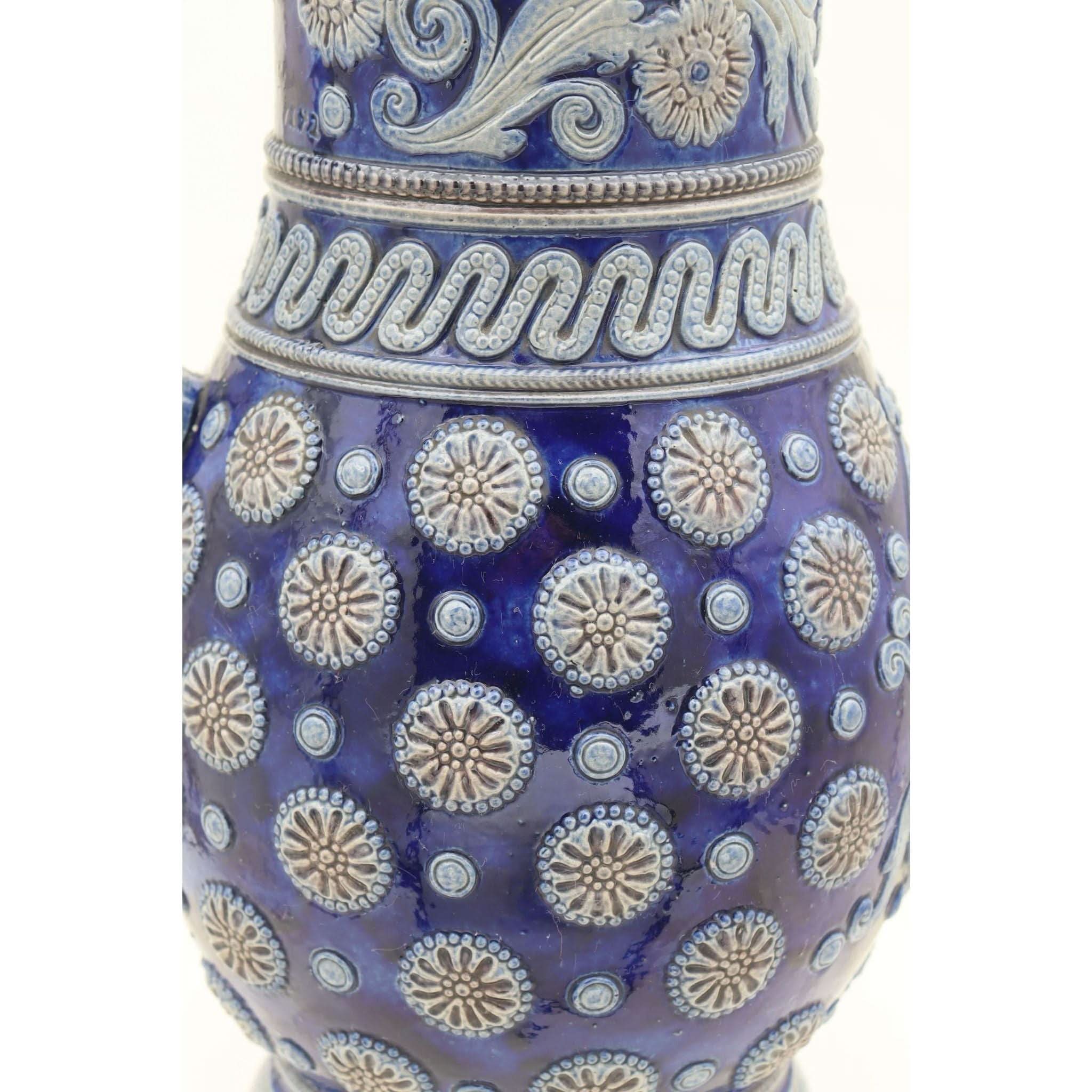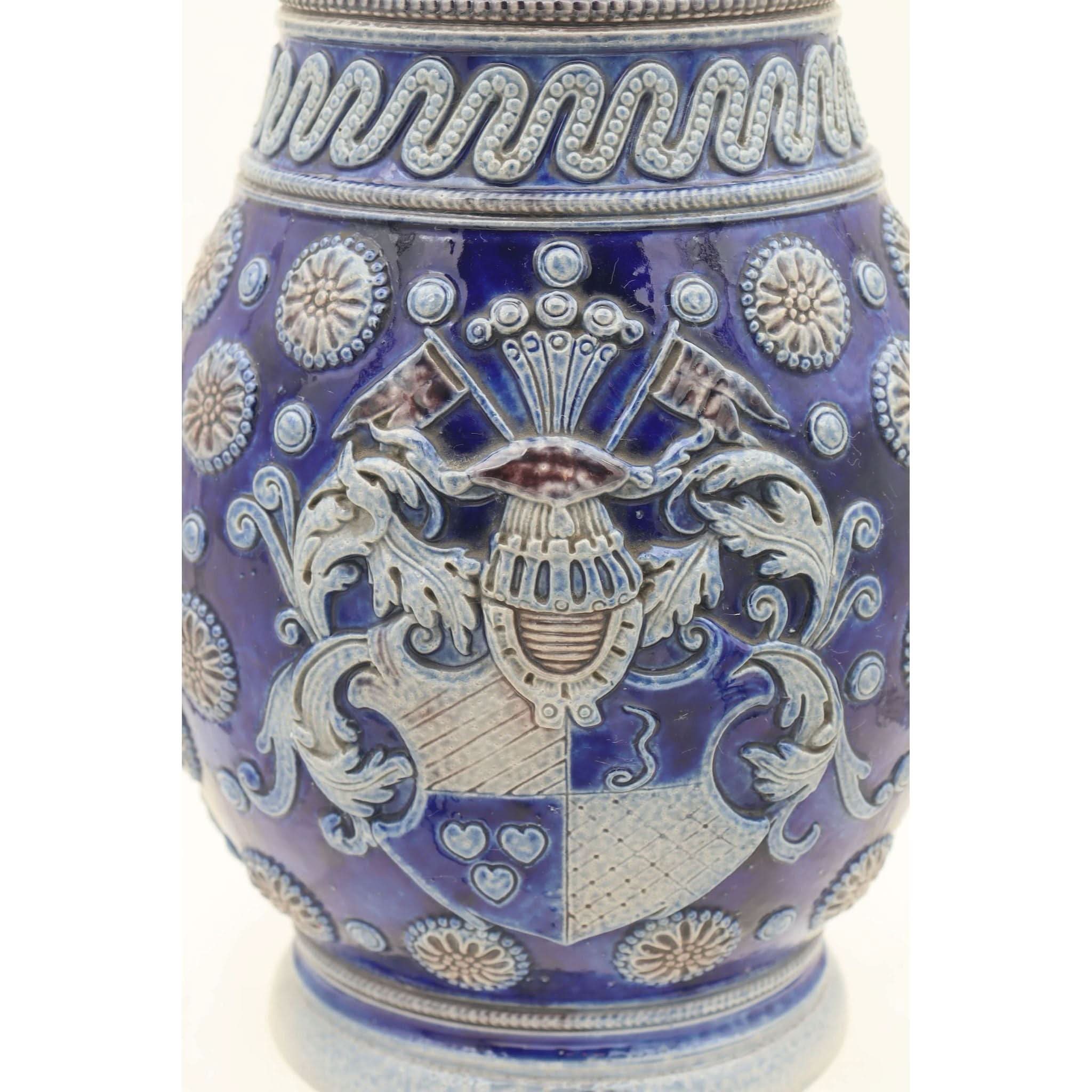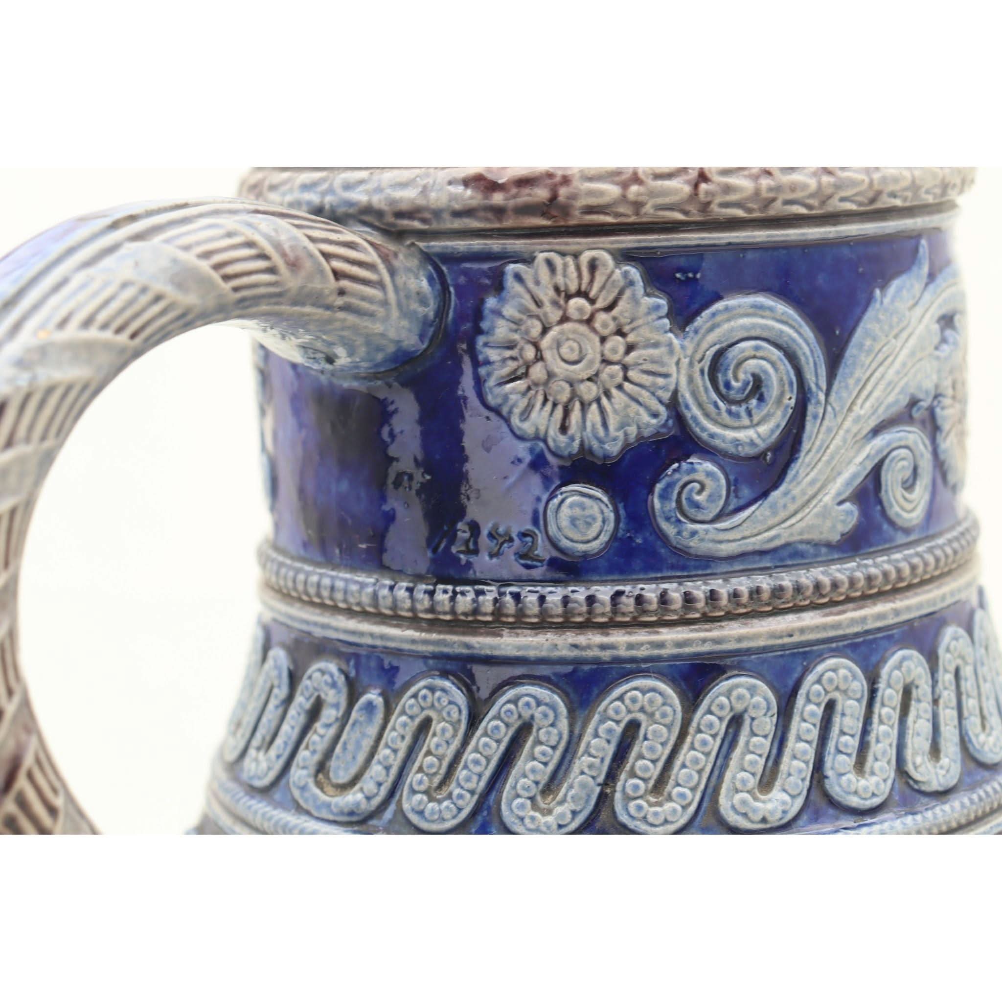 On the front of this Westerwald stoneware jug, amongst all the other raised decoration is a raised faux coat of arms. Parts of this armorial and the other decor on the jug are coloured in a rich cobalt blue with dashes of a manganese brown, set against the grey of the body. Probably a beer jug, it stands 258 mm (10 inches) high and has a diameter of 152 mm (6 inches). The base is marked with an impressed shape number 1242, which also appears where the top of the handle meets the rim. This is probably from the factory of Johann Wilhelm Remy of Hohr, then in Prussia. It is in very good condition and dates from around 1890.