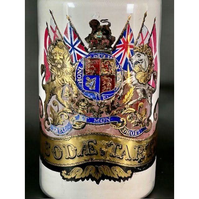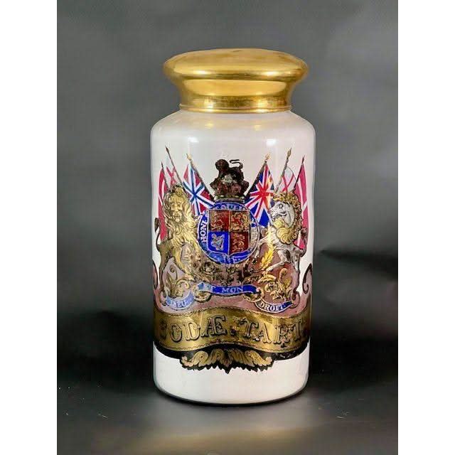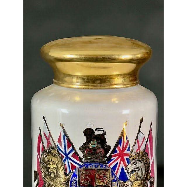 This is an impressive and monumental genuine antique English 19th century Victorian period Pharmaceutical glass Carboyd complete with its heavy glass gilded lid. The carboyd is painted white internally and is embellished with coloured paint and gold leaf in the form of a Heraldic Shield supported by a Lion and a Unicorn. There are also Latin inscriptions and various flags of the United Kingdom.