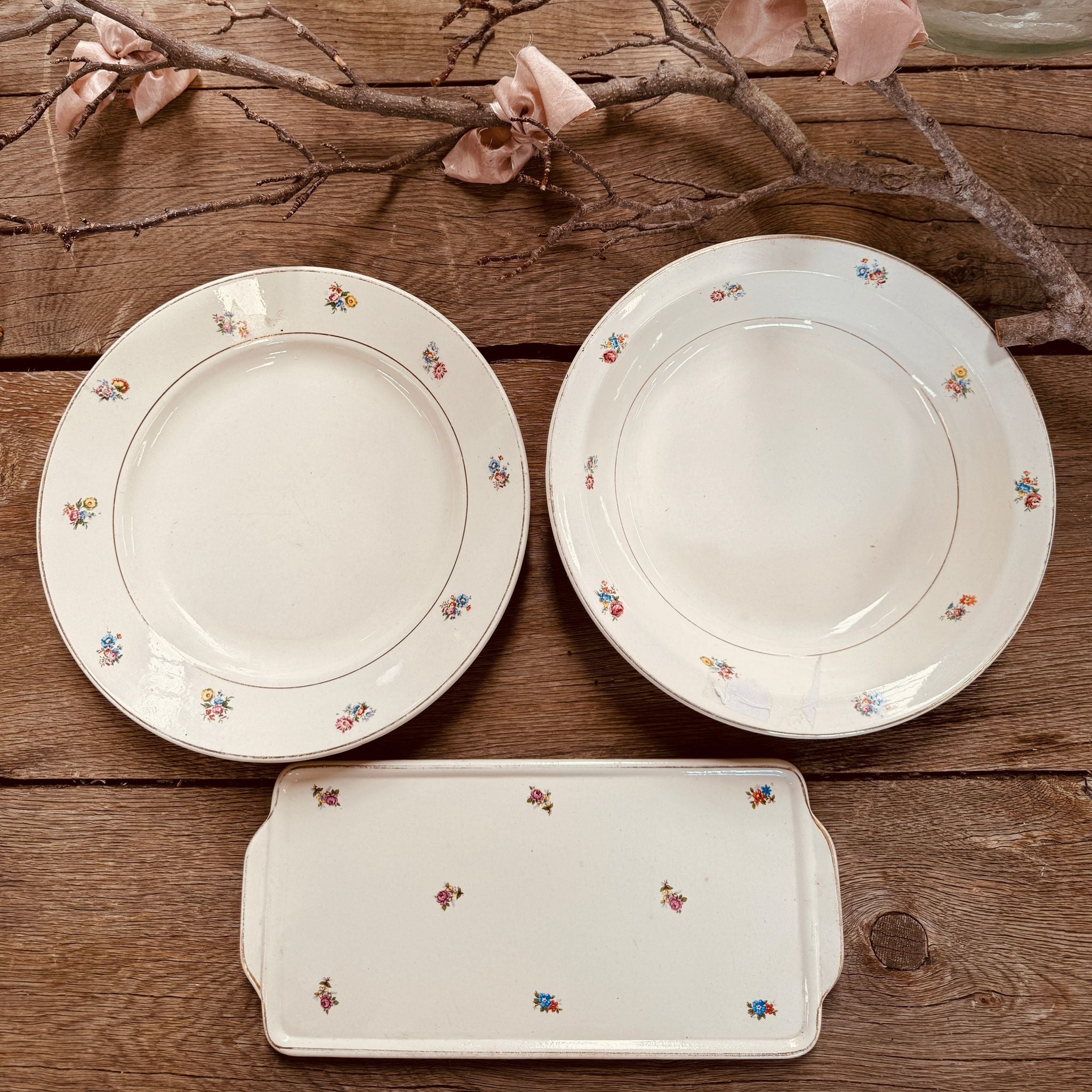 Beautiful 3-piece Antique French Serving Set Stamped with Makers Mark from Provence. Lovely delicate floral design with gold rim and aged patina.