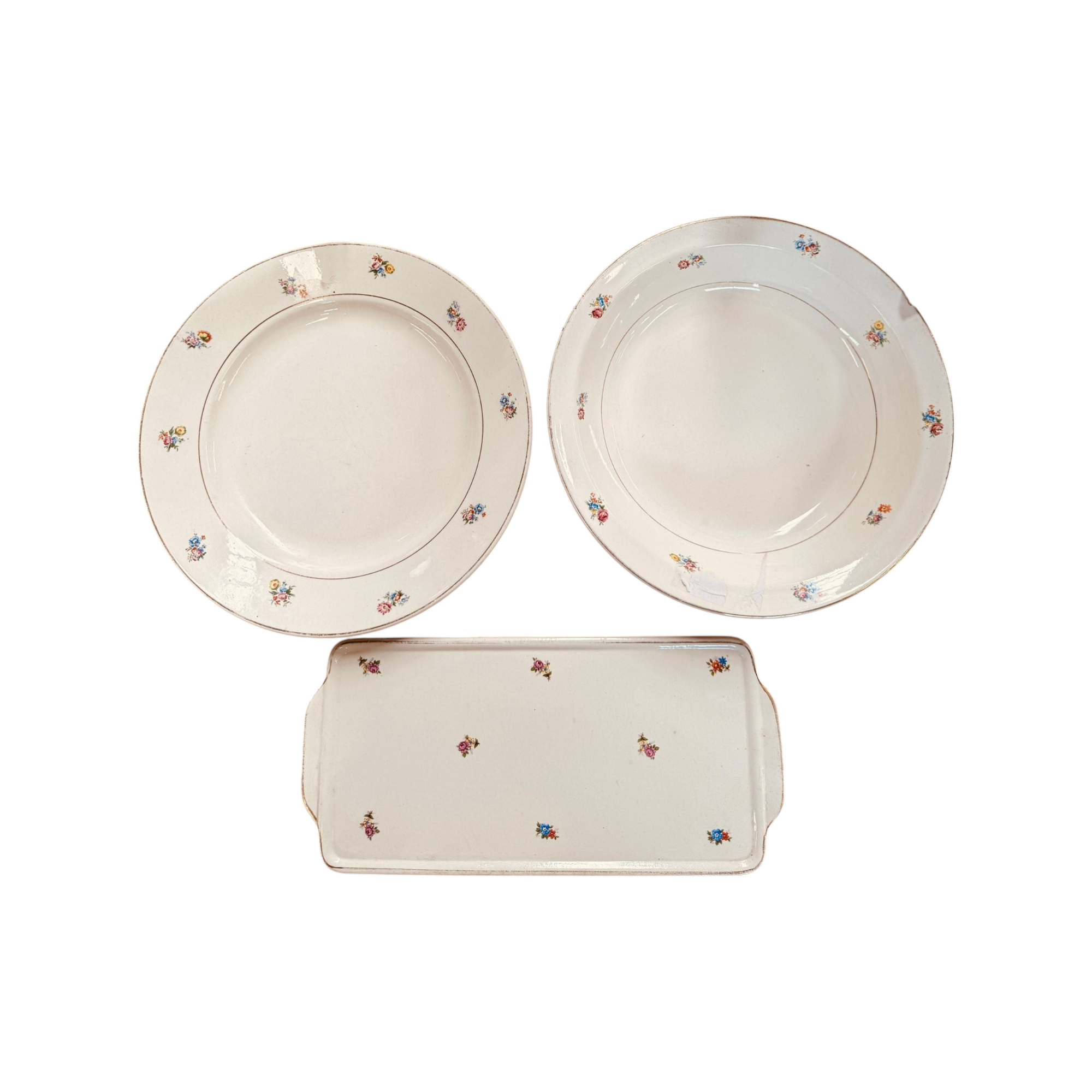 Set includes a round serving plate, a large round serving bowl and a gorgeous flat rectangular serving plate.