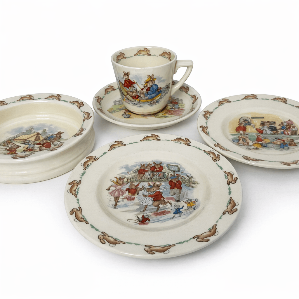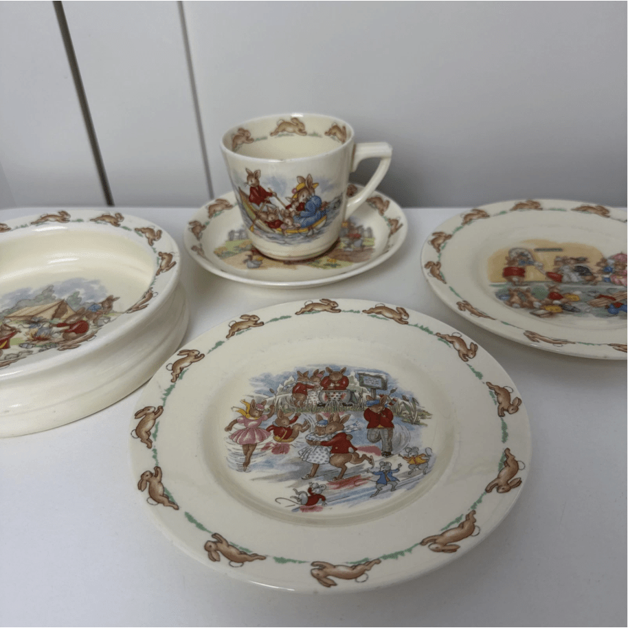 Charming vintage Royal Doulton Bunnykins children’s dinnerware set featuring classic storybook illustrations. A beautiful collectible set that’s perfect for display, gifting, or gentle everyday use.