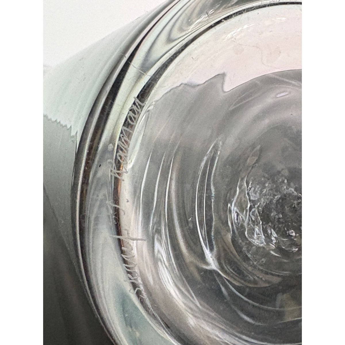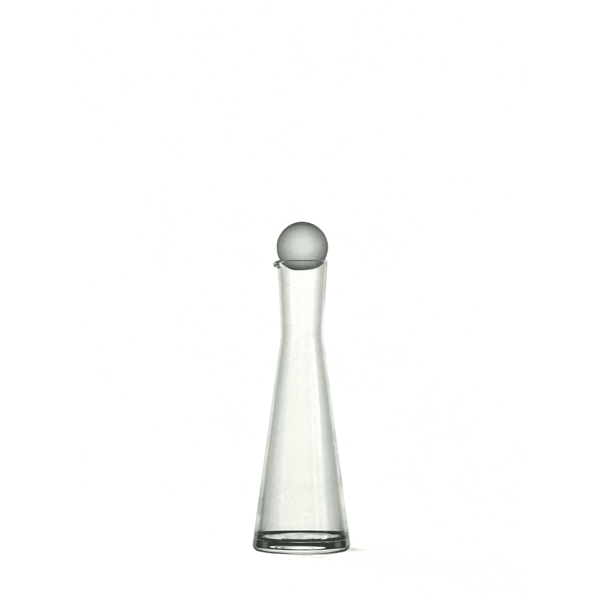 Clear glass bottle of tapering conical form with thickened base and fitted spherical stopper. Etched signature ‘Skruf I. Råman’ to the rim. The restrained silhouette and emphasis on proportion and material clarity are characteristic of Råman’s work for Skruf.