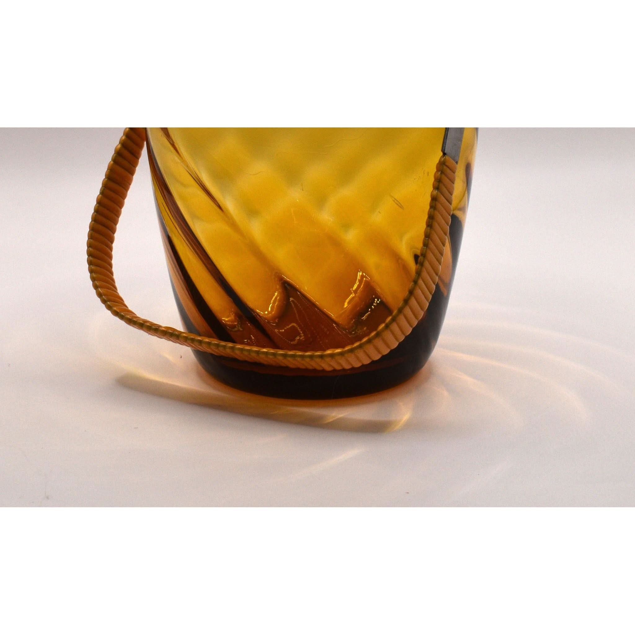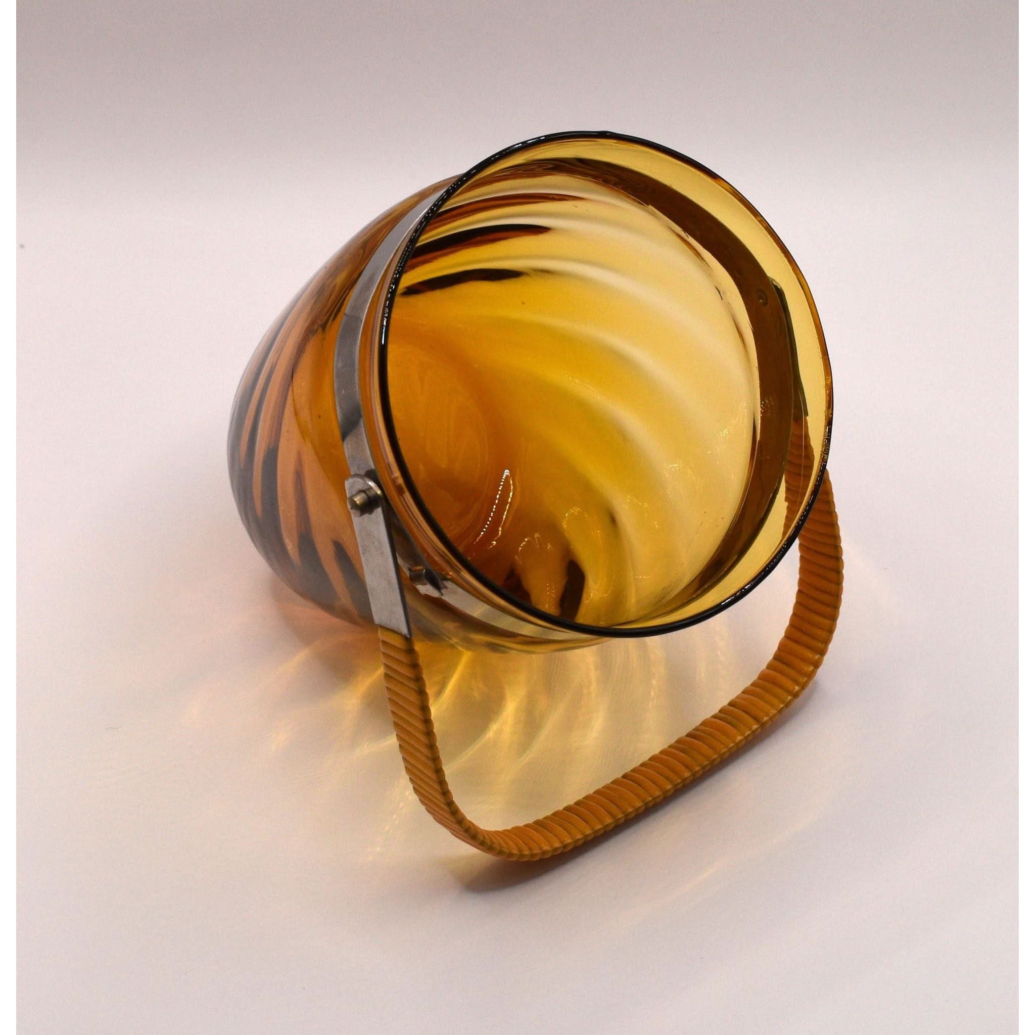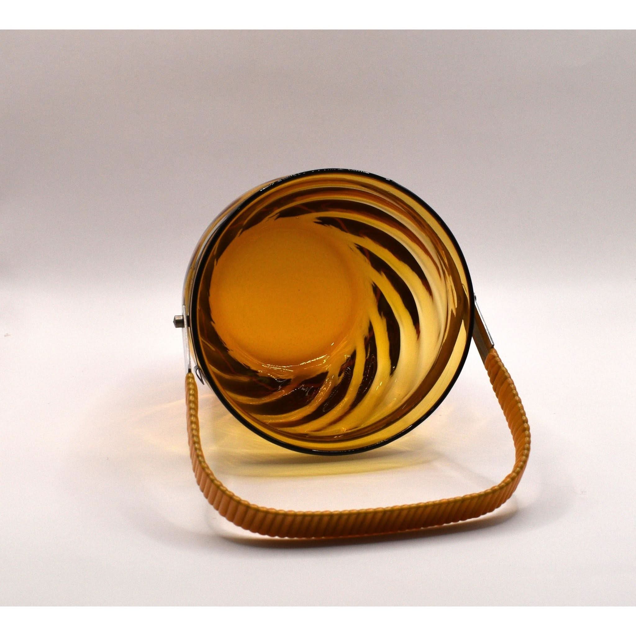Step back in time with this stunning ice bucket. The vinyl-wrapped swing handle and beautiful swirl pattern in amber glass make it a perfect addition to any retro or vintage bar or decor. And it's in perfect condition!