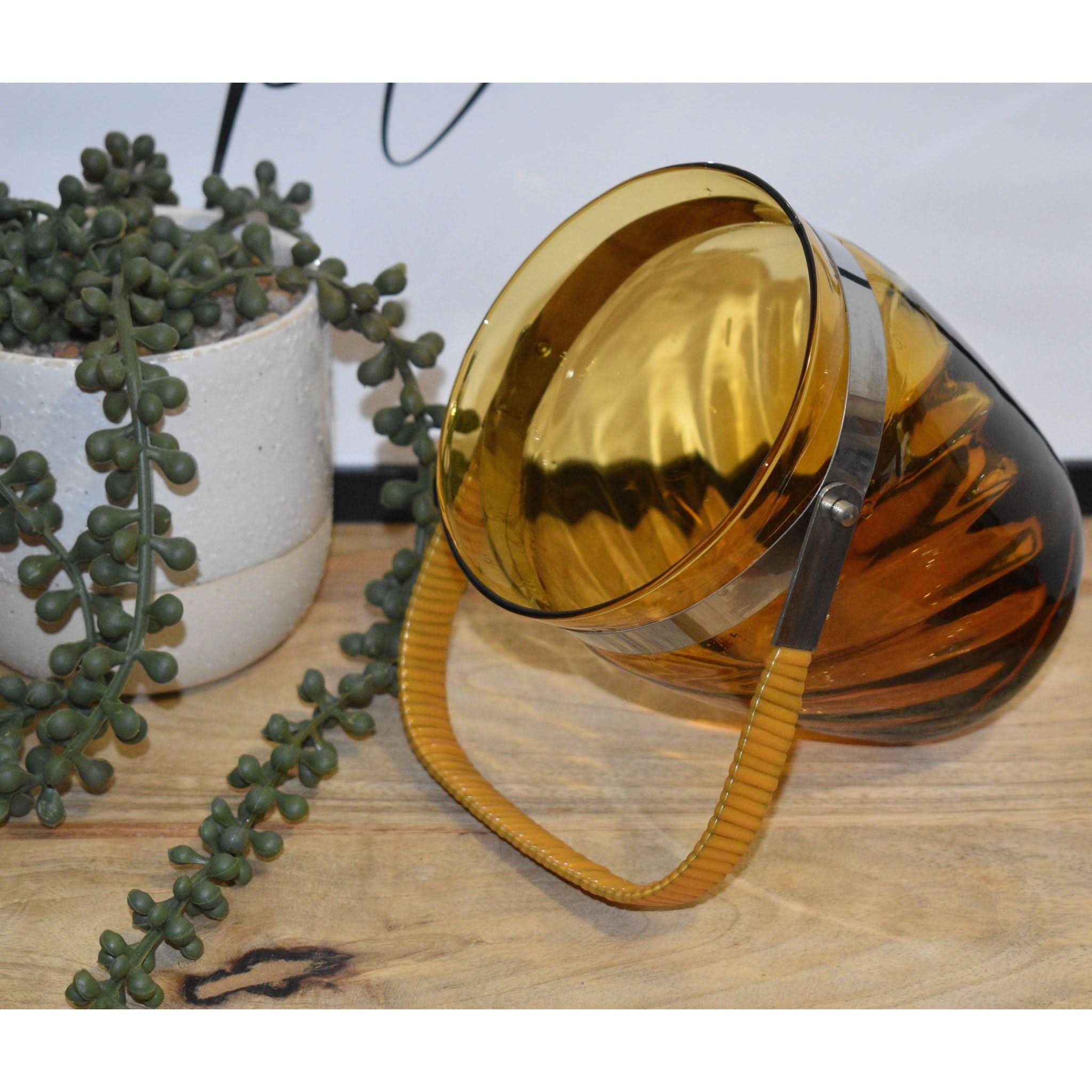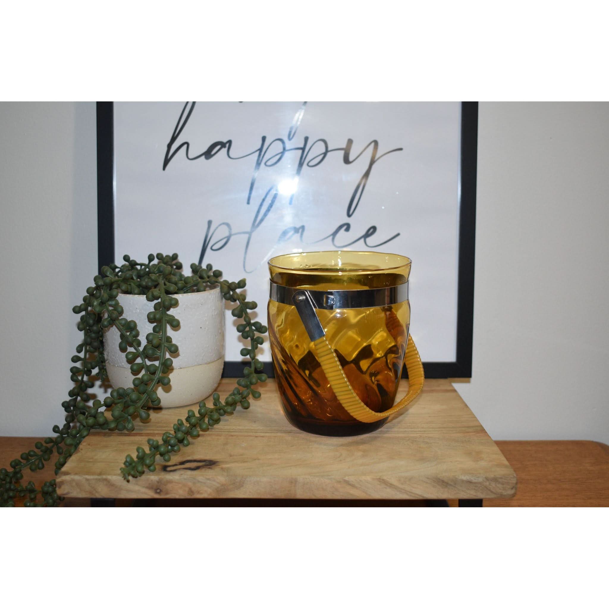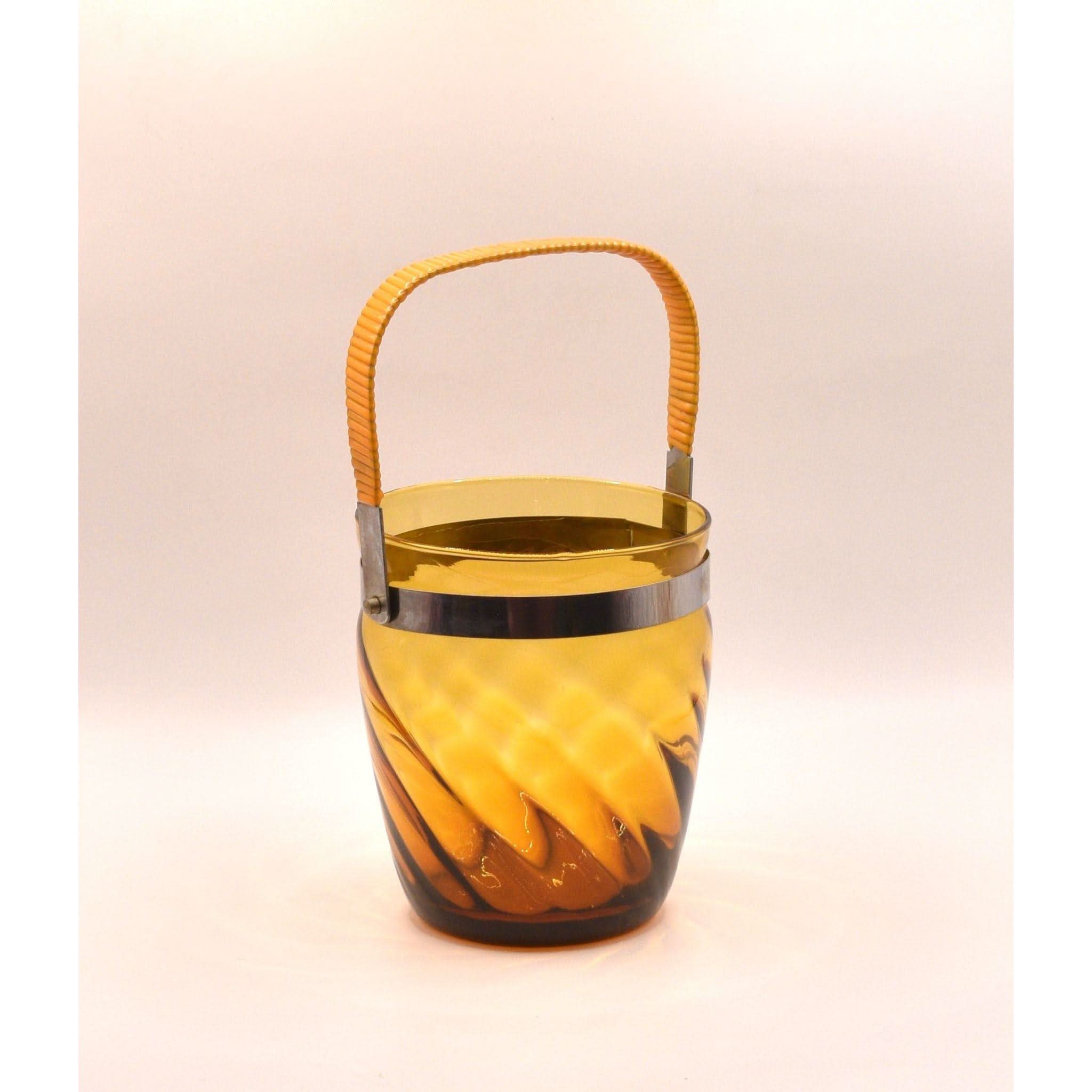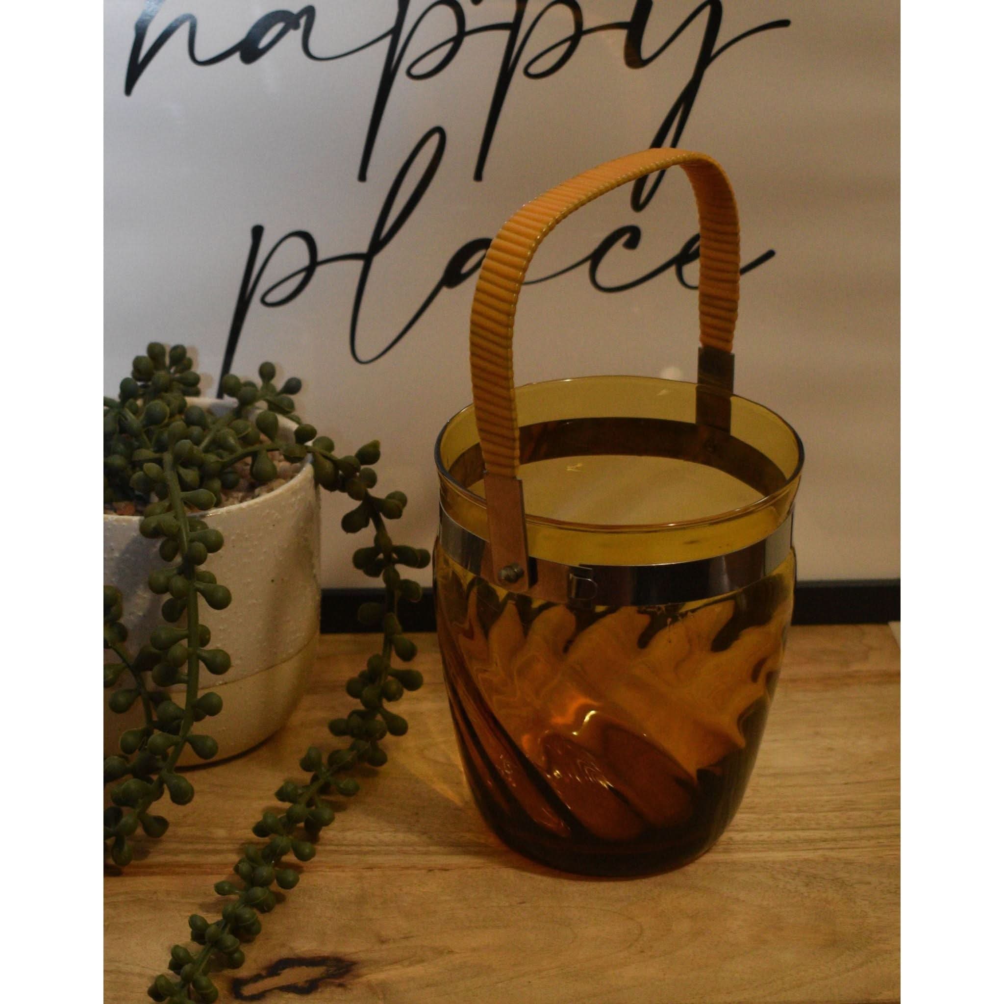 Step back in time with this stunning ice bucket. The vinyl-wrapped swing handle and beautiful swirl pattern in amber glass make it a perfect addition to any retro or vintage bar or decor. And it's in perfect condition!