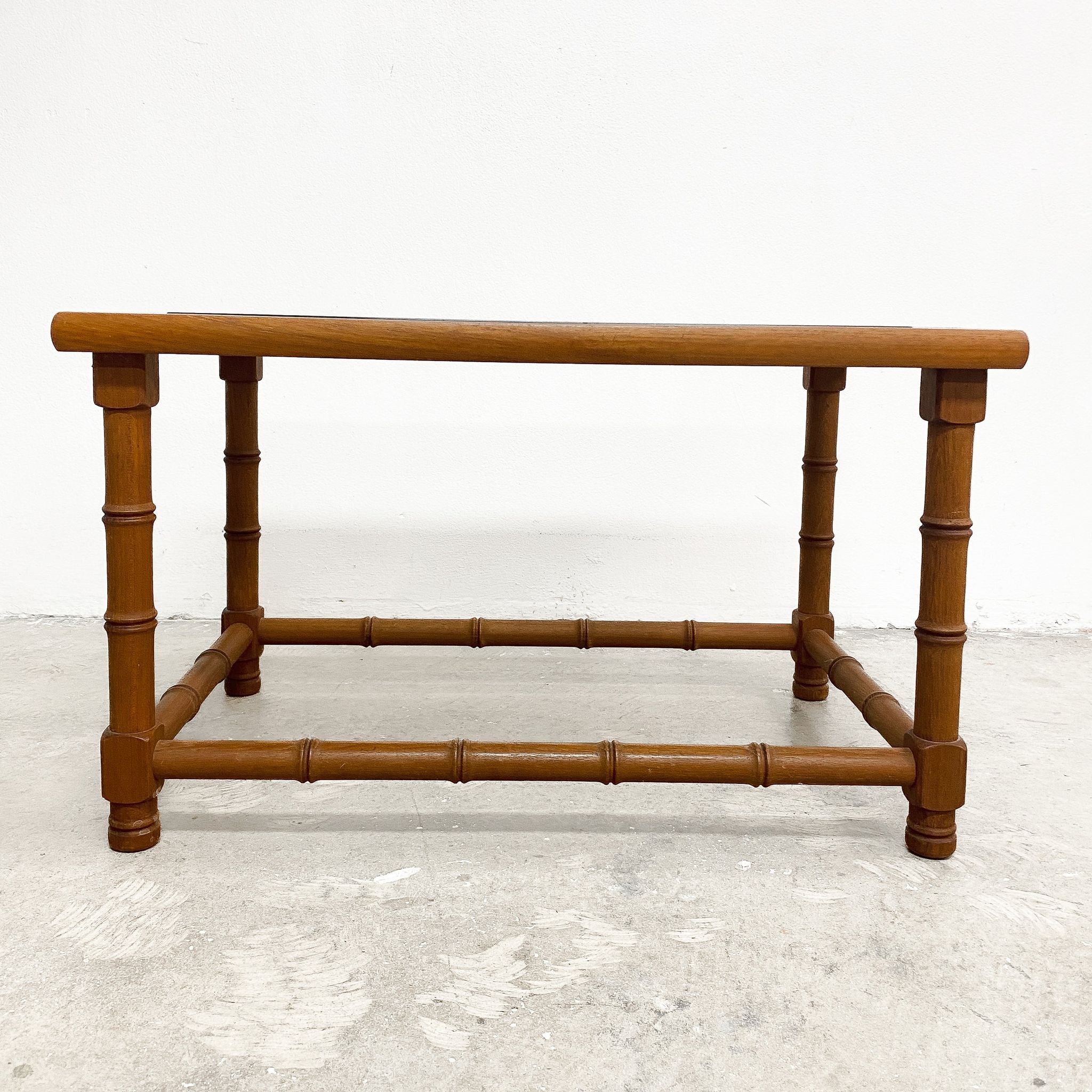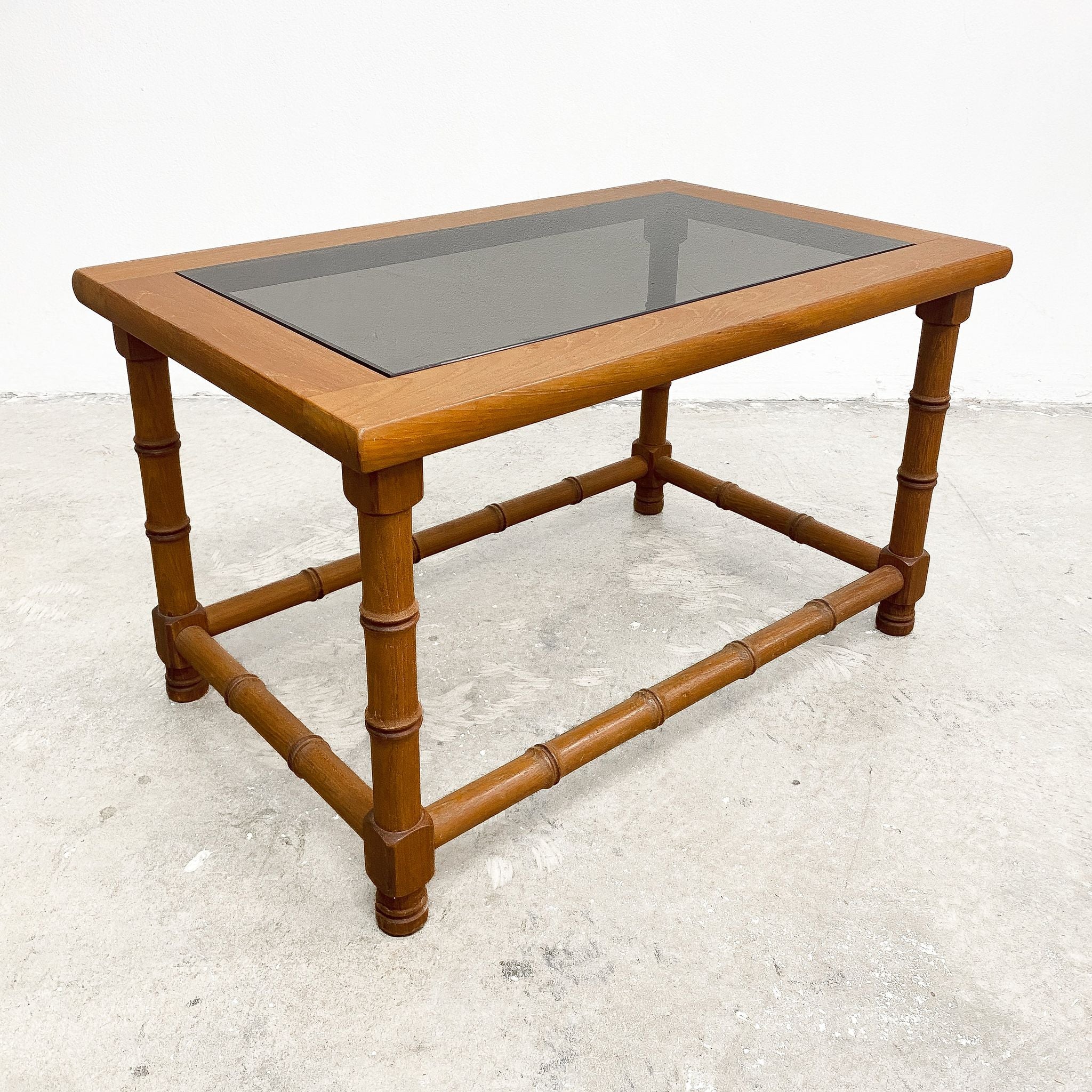 Great mid century rectangular teak coffee table. Featuring fun faux bamboo base and smokey glass top. In good condition with some minor signs of use commensurate with age.