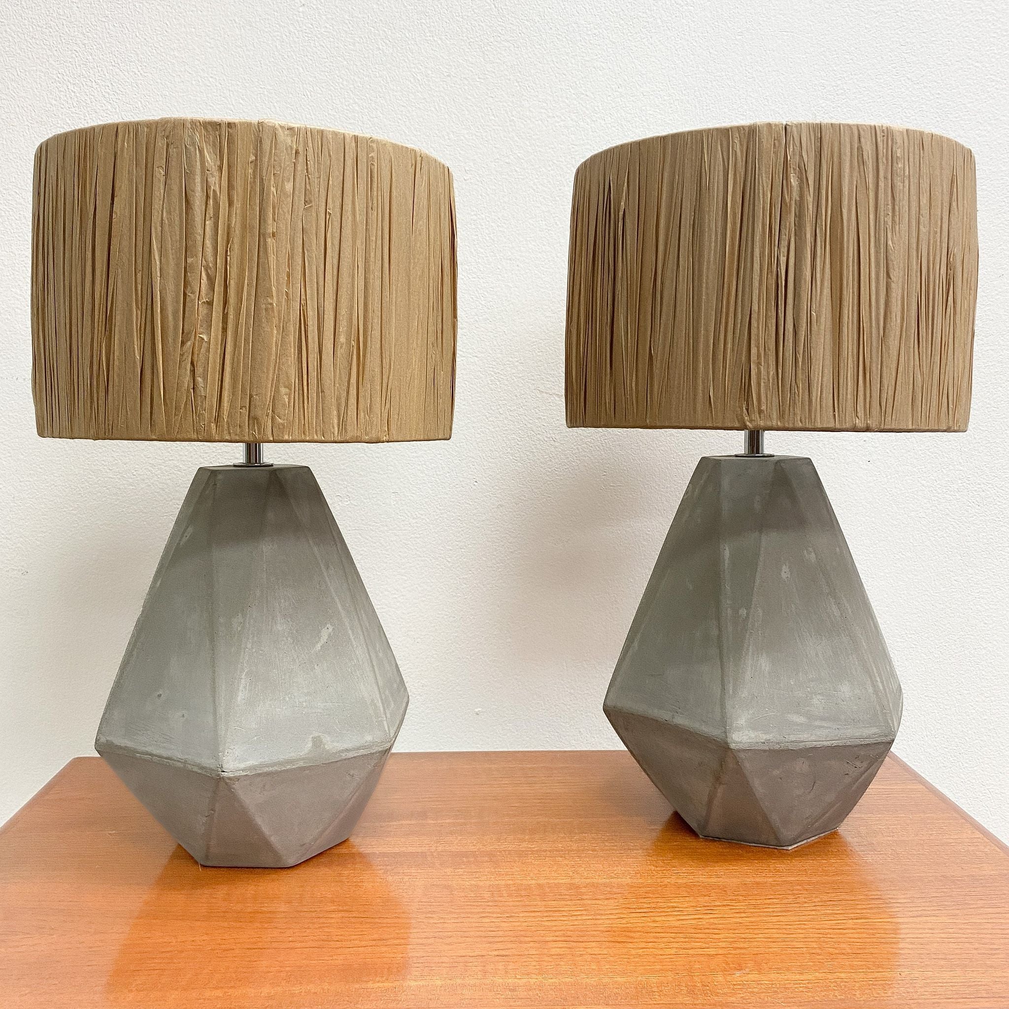 Pair of matt grey concrete look finish geometric table lamps and shades. They merge contemporary and industrial design.