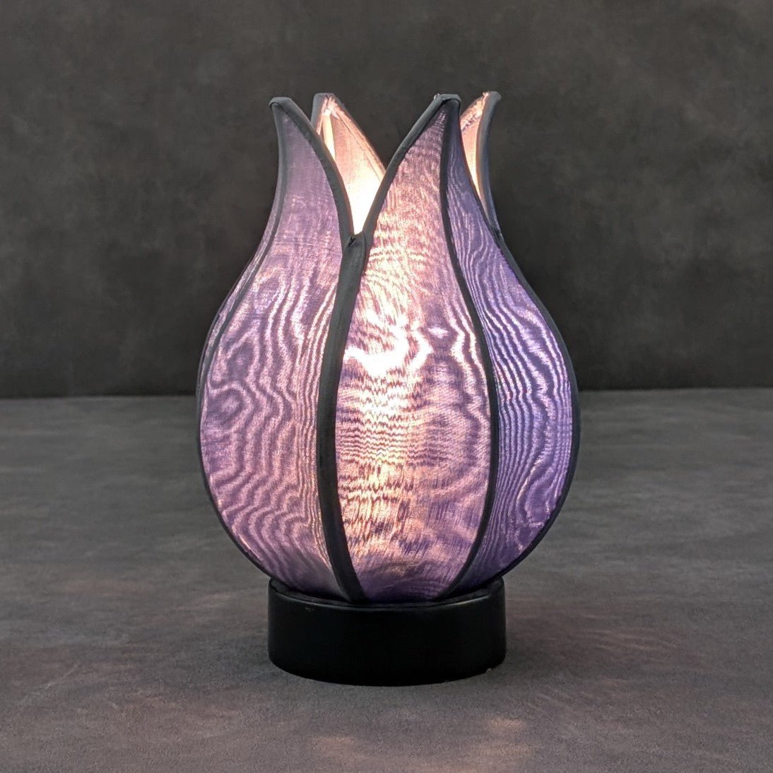 Shaped as a lotus bloom, this table lamp uses layered silk petals wrapped around a compact internal light source, allowing light to diffuse outward in a warm, even wash. Likely produced in the late twentieth or early twenty first century, it sits firmly in the decorative designer lighting category rather than the collectible or named maker tier. The focus here is material effect and surface rhythm rather than authorship. When unlit it reads as an object, and when illuminated it becomes a calm atmospheric presence.