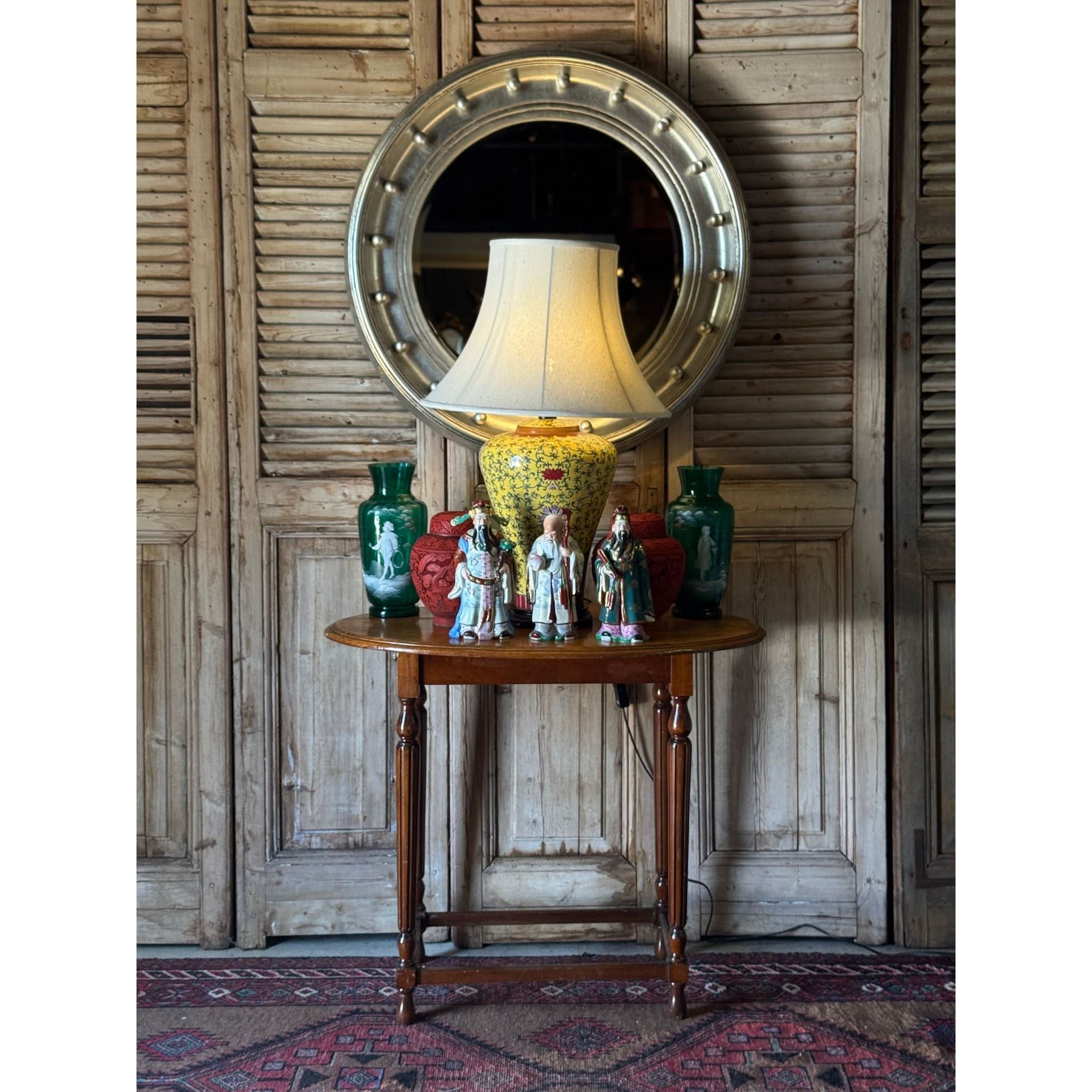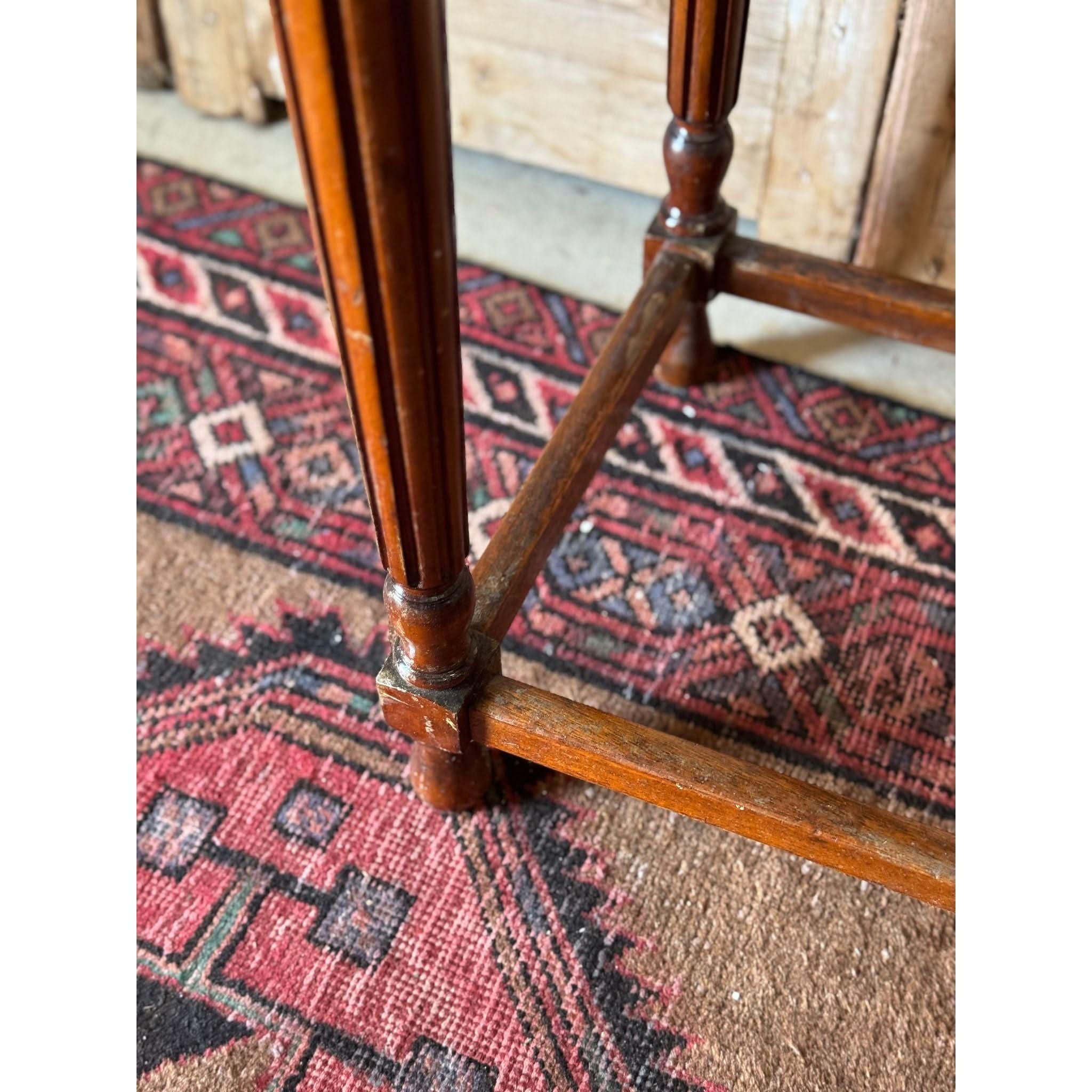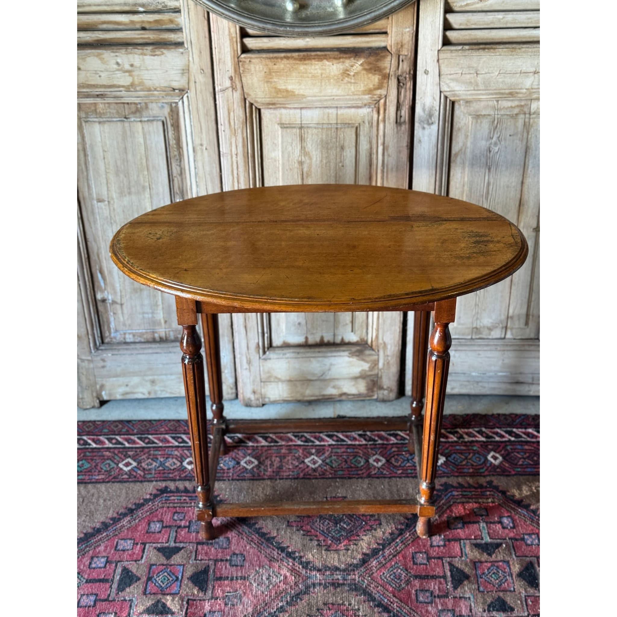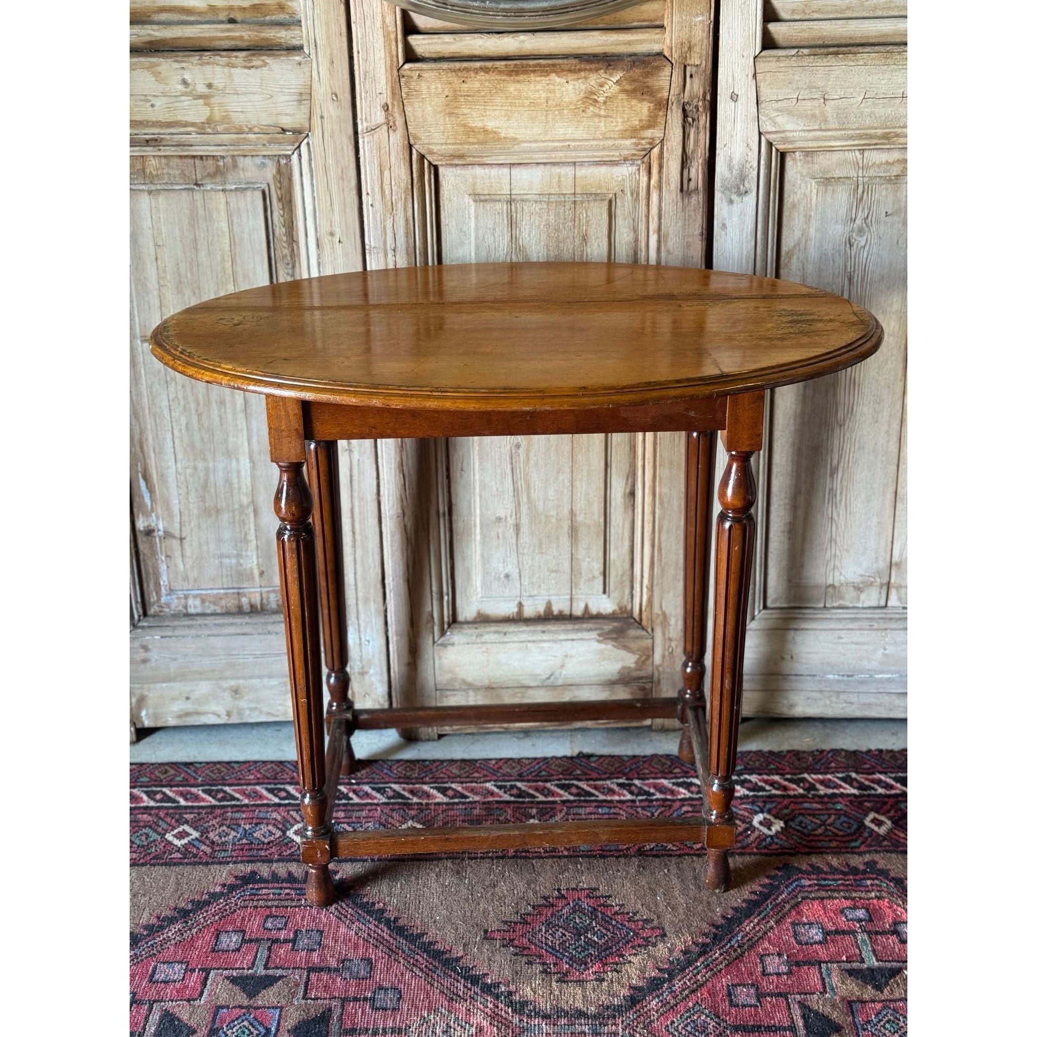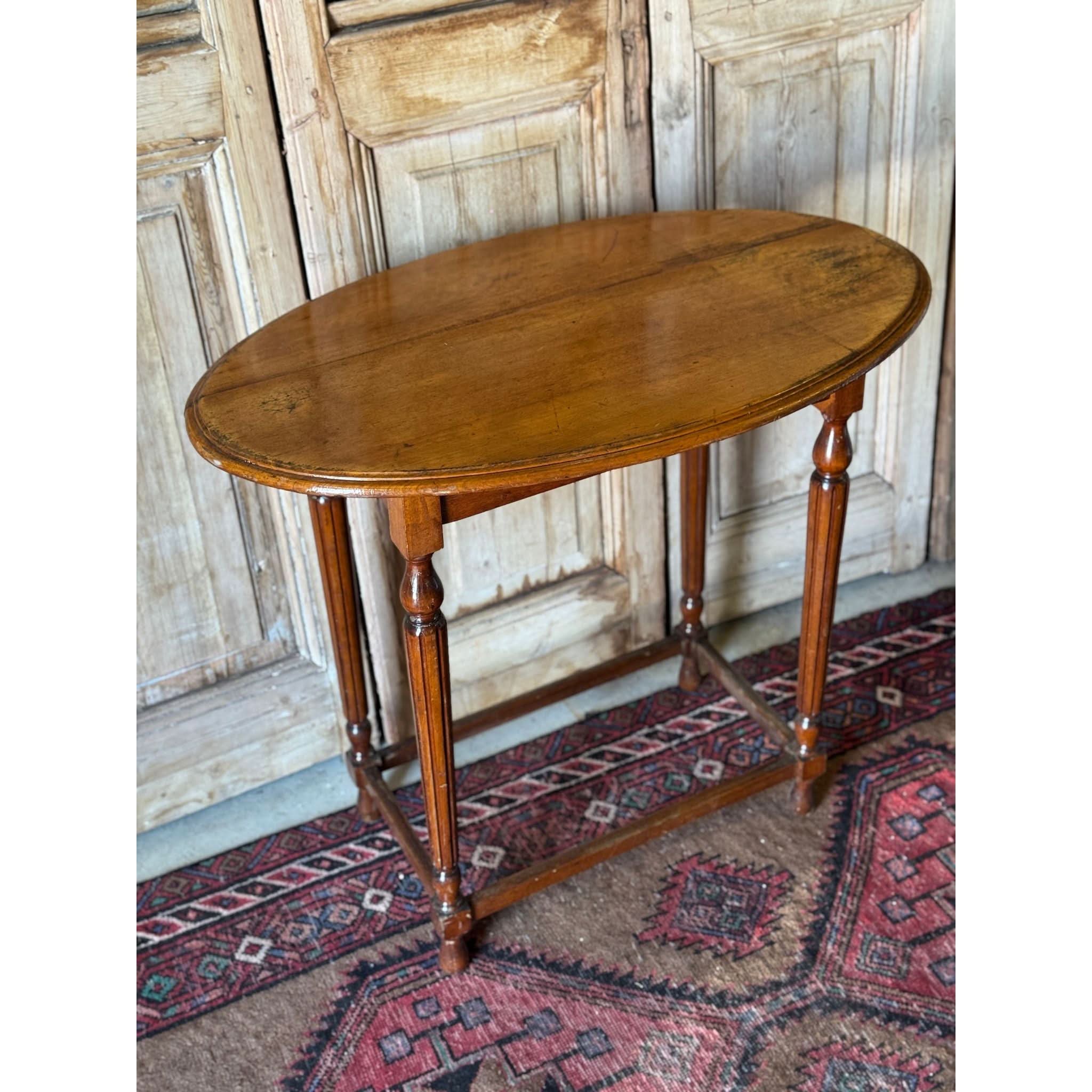 Beautiful vintage solid oak oval side table on elegantly turned and fluted legs and stretcher base. Some visible joins in timber on surface - refer photos. Signs of wear as expected with age. Condition reflected in price.