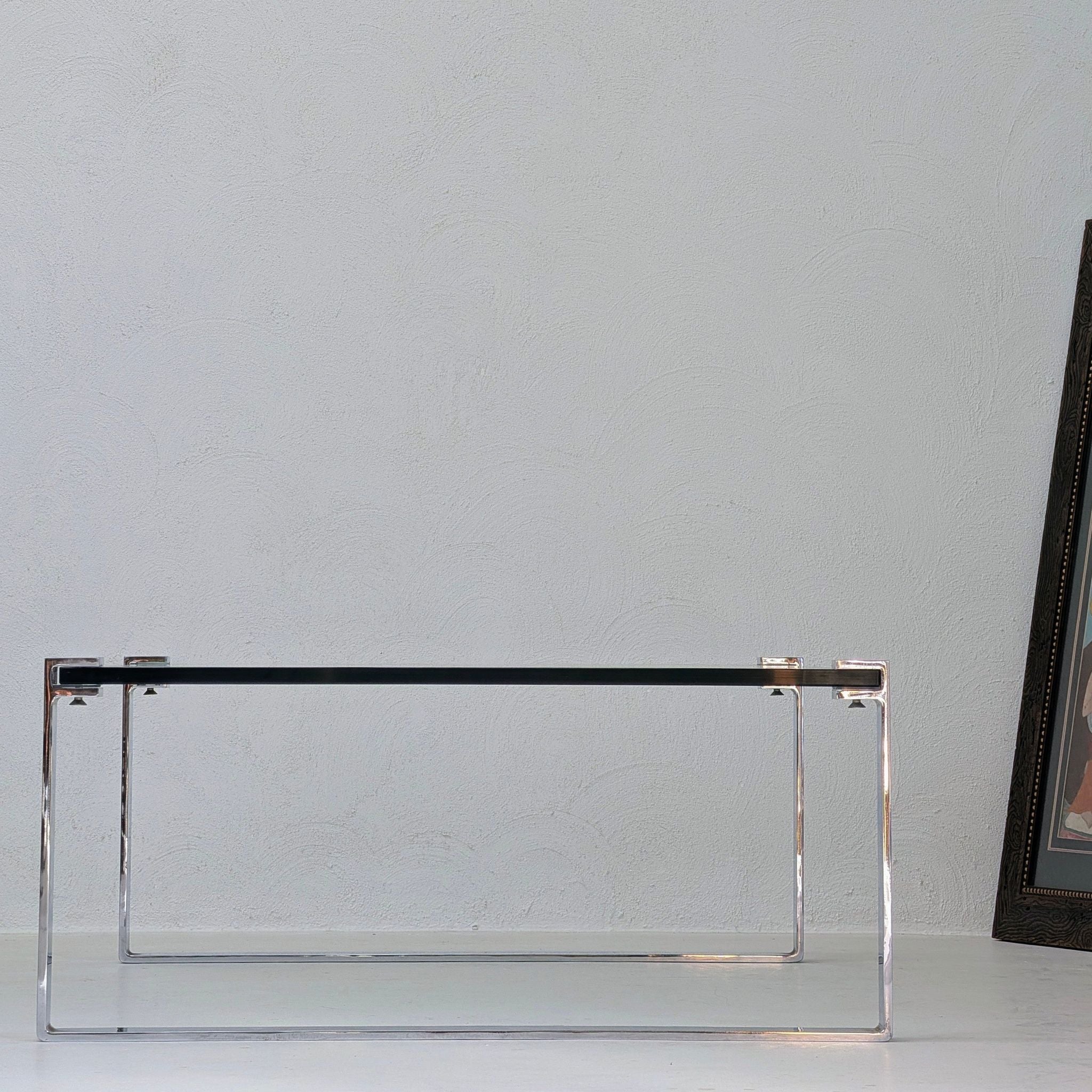 The design philosophy was born from Draenert's desire for pure, unobstructed forms. By engineering a proprietary clamp system, he allowed the heavy 20mm glass plate to span the distance between the steel runners without the need for a supporting subframe. This pioneering approach created a floating aesthetic that became a hallmark of the Space Age and High Tech design movements. Today, the 1022 remains a staple in permanent collections worldwide, including the Metropolitan Museum of Art in New York and the Victoria and Albert Museum in London.