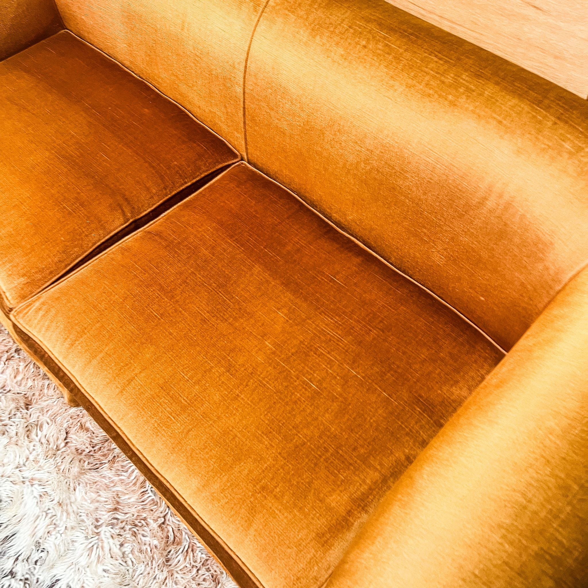 The velvet has a soft sheen that shifts beautifully between brown and gold depending on the light, making it an eye-catching statement without overpowering a space. Solidly built and comfortable, this sofa suits mid-century, eclectic, bohemian and vintage-inspired interiors perfectly.