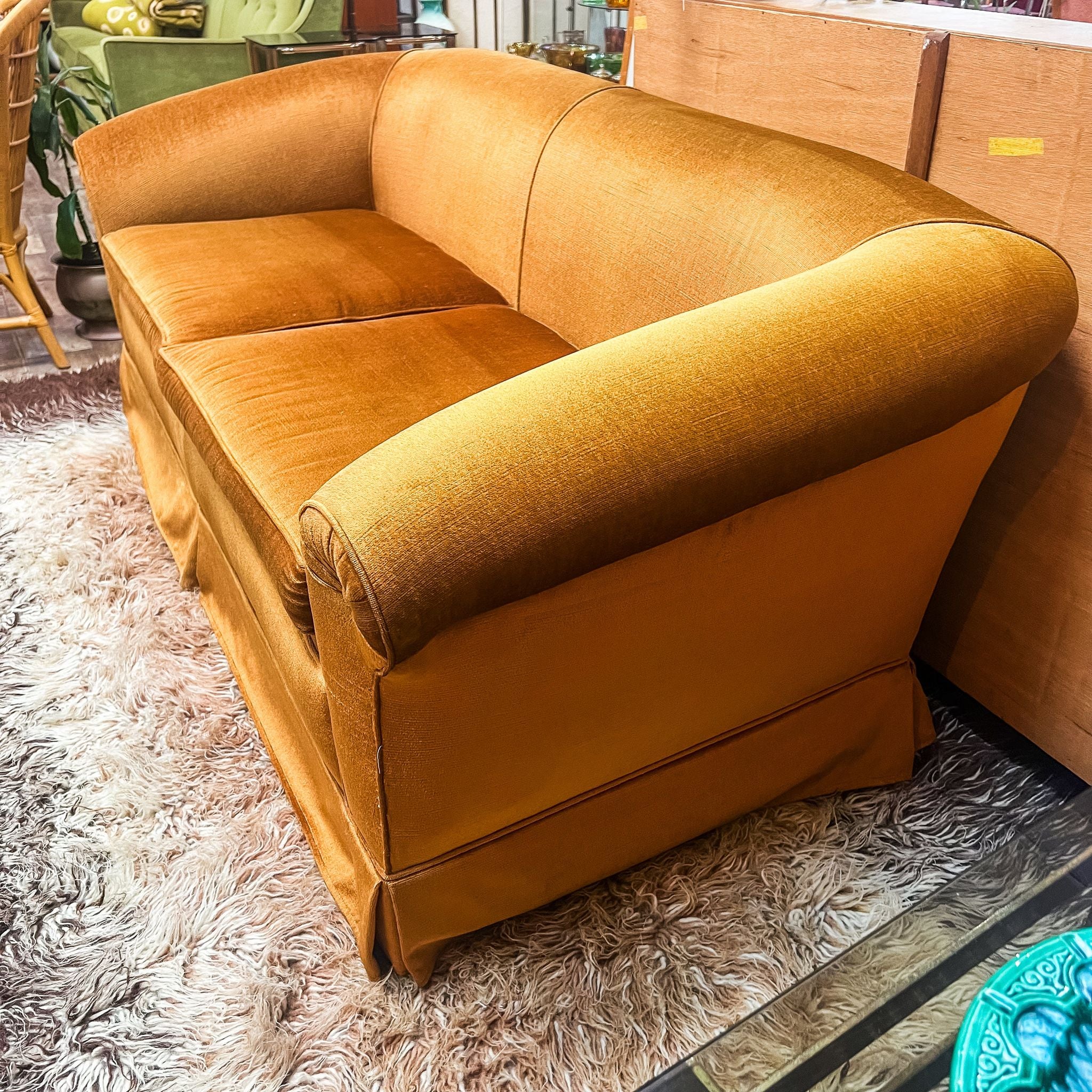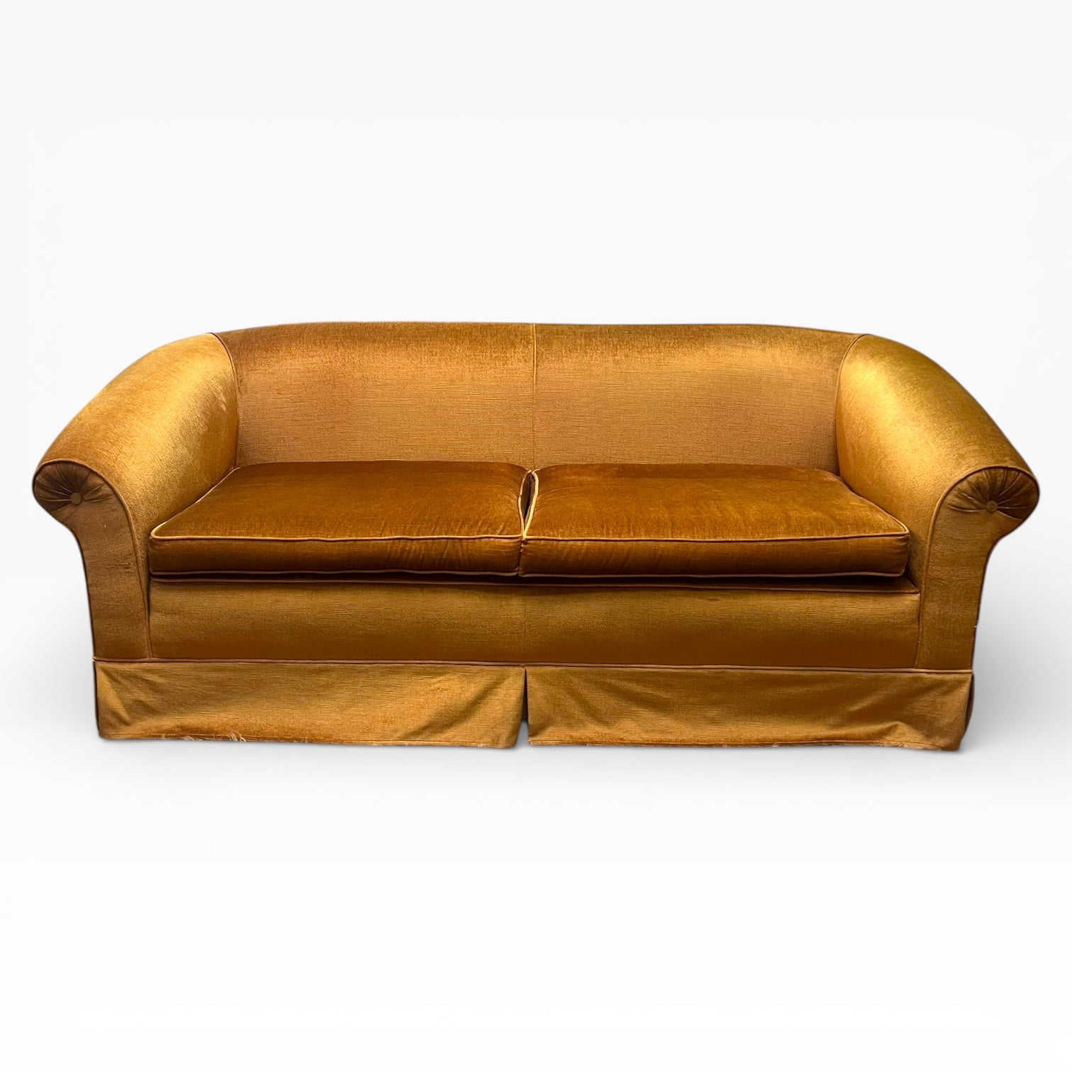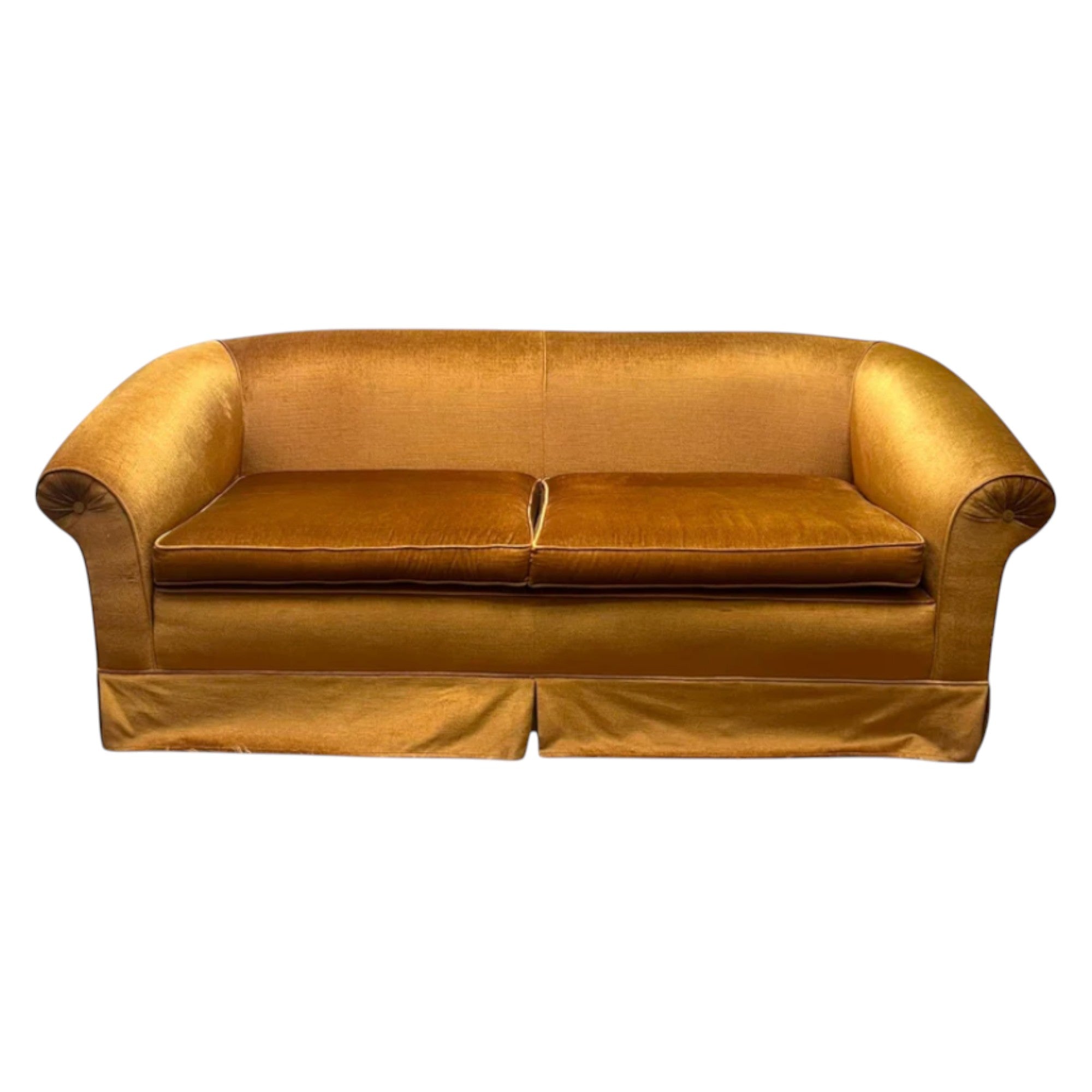 A beautifully proportioned vintage velvet sofa upholstered in a rich brown-gold velvet, featuring warm golden undertones with a subtle earthy depth. This piece showcases classic rolled arms with button detailing, a generous deep seat and a fully skirted base, giving it a timeless yet relaxed silhouette.