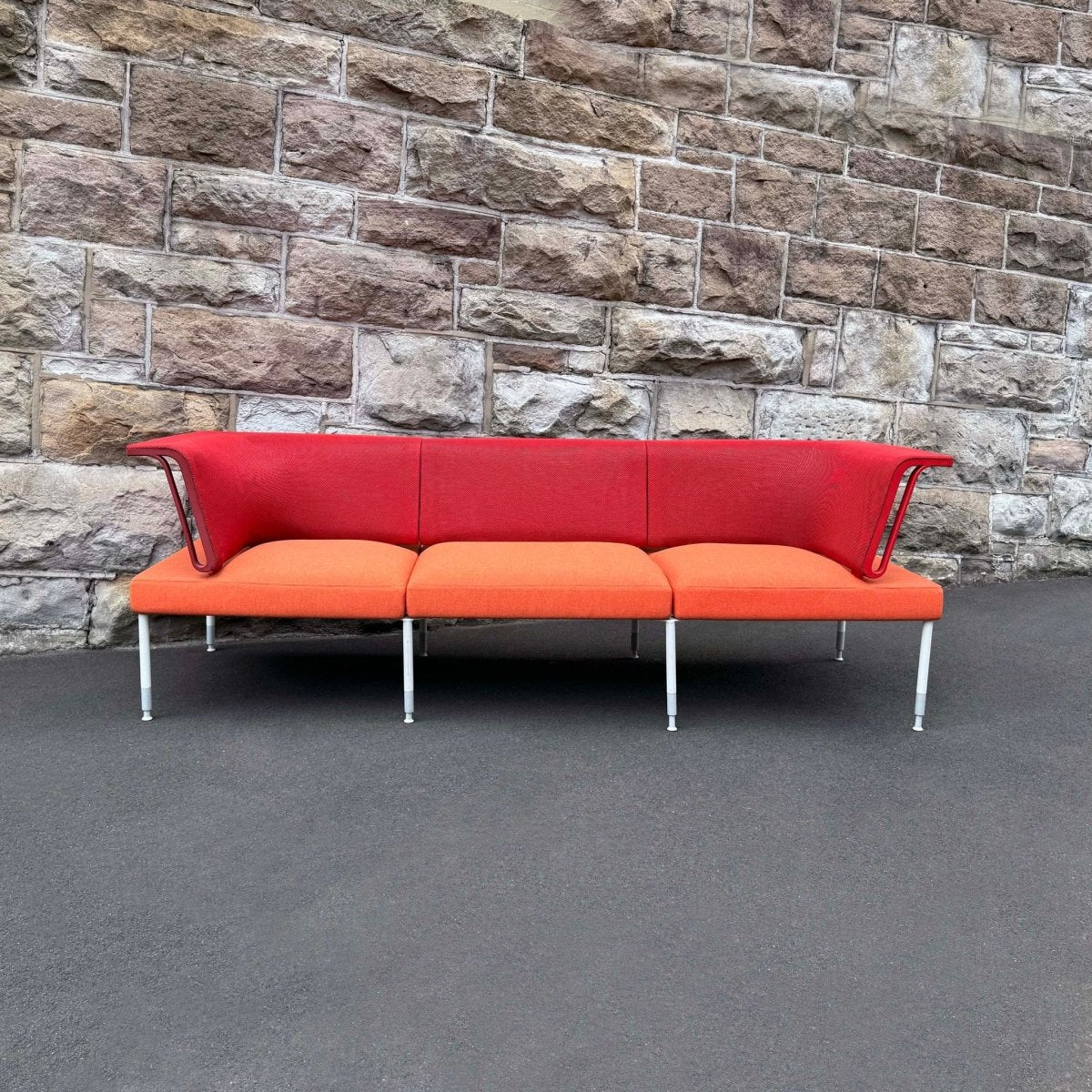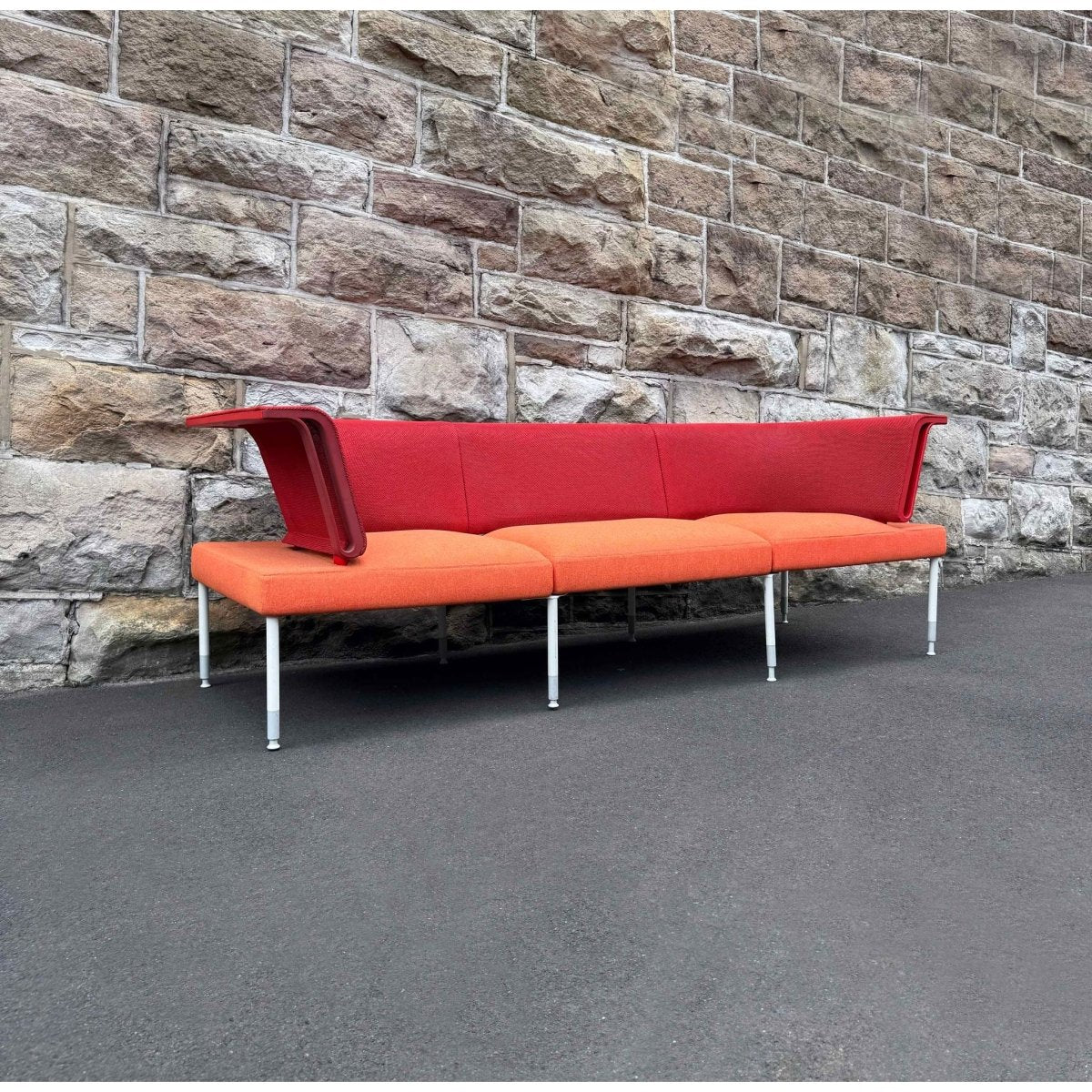 Construction: Aluminium, plastic, upholstered in an orange fabric with a red mesh fabric on the back