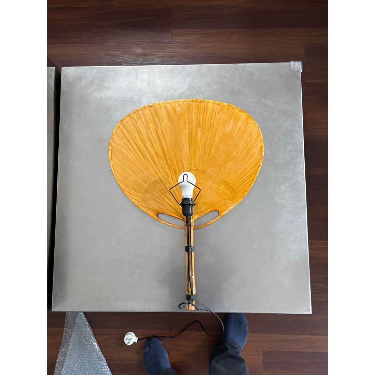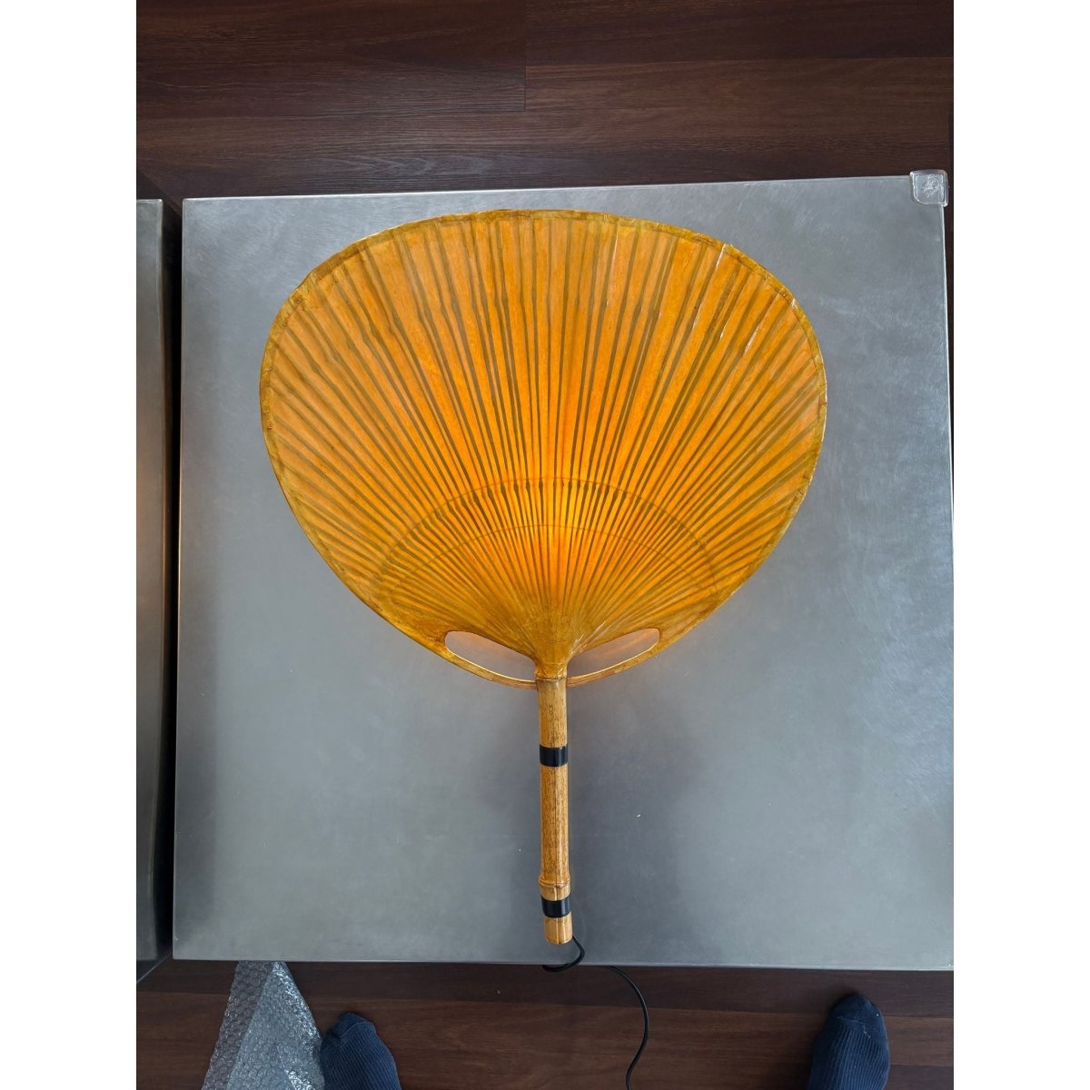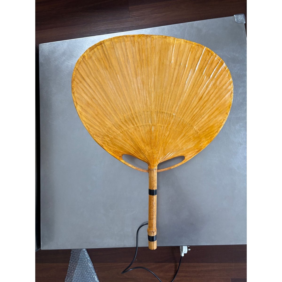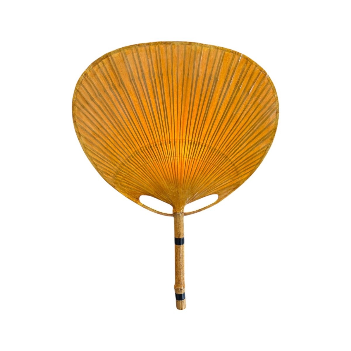 The Ingo Maurer Uchiwa wall lamp, from the 1970s, made of bamboo and lacquered rice paper, almost round lampshade, and black iron rods. It has a mid century modern style resembling an oriental fan. Uchiwa is the Japanese word for fan and it is a traditional Japanese fan.