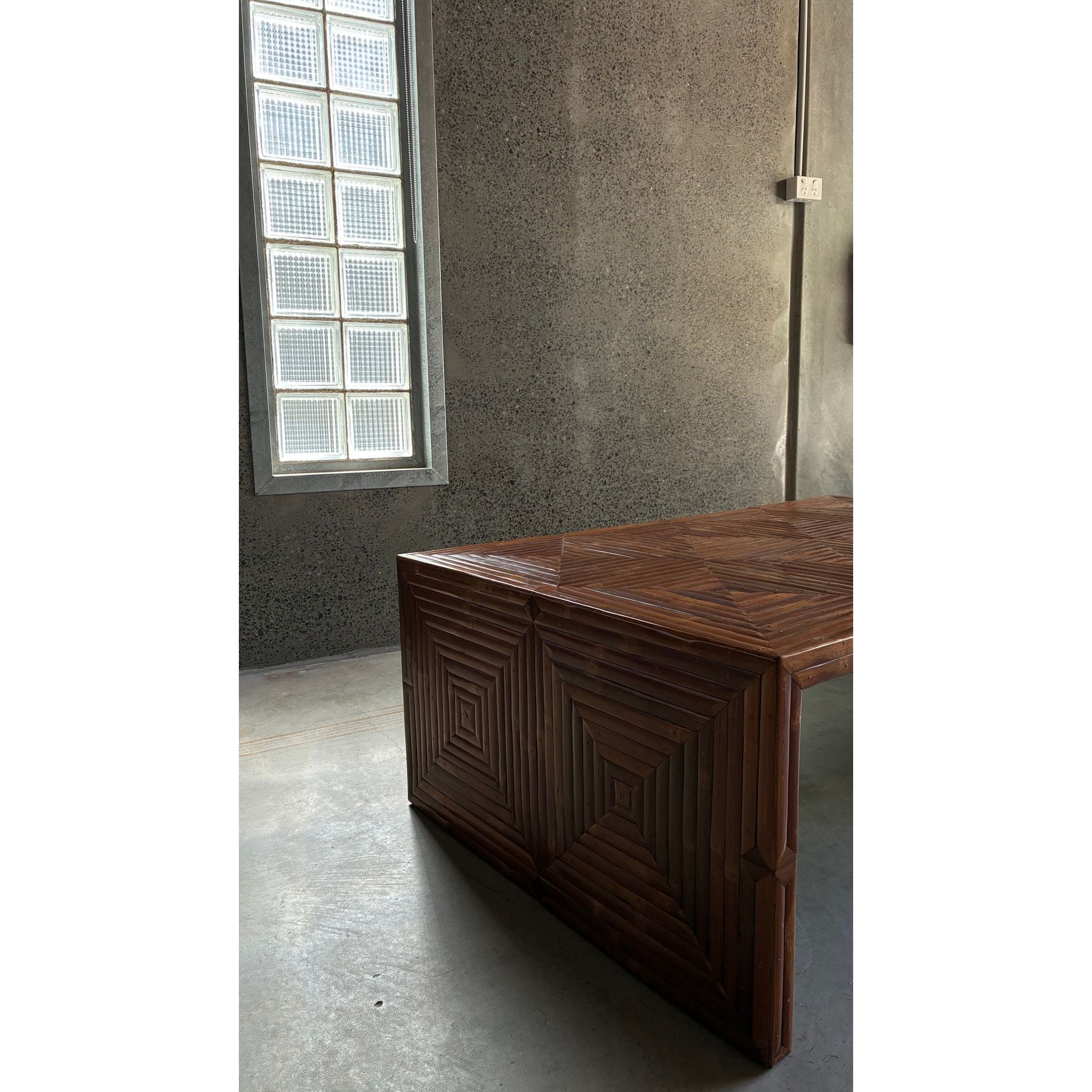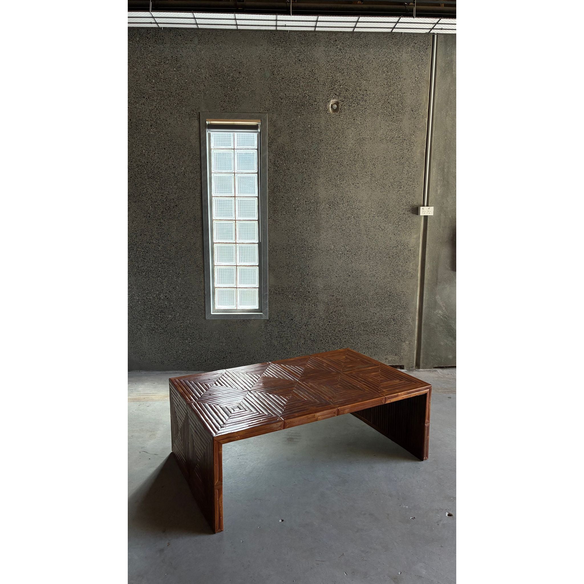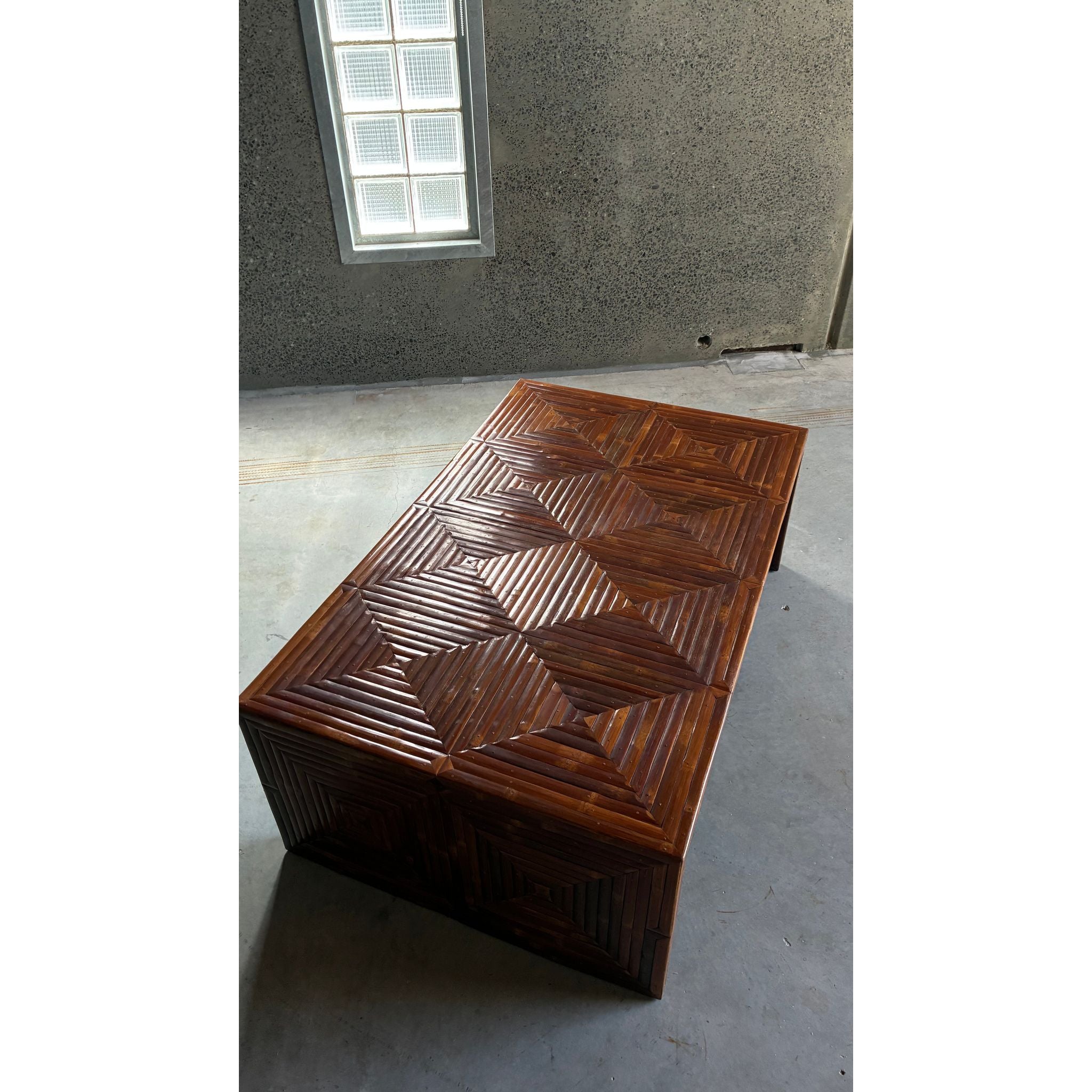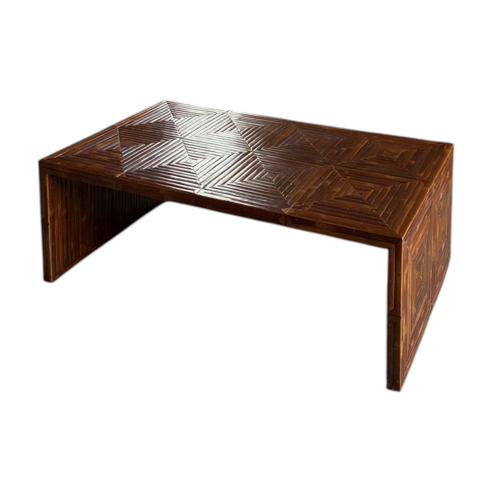 A striking Italian coffee table featuring a richly patterned geometric surface created from carefully arranged bamboo slats. The top and sides are composed of repeating angular motifs, producing a subtle parquet-like effect that highlights the natural tonal variation of the material.