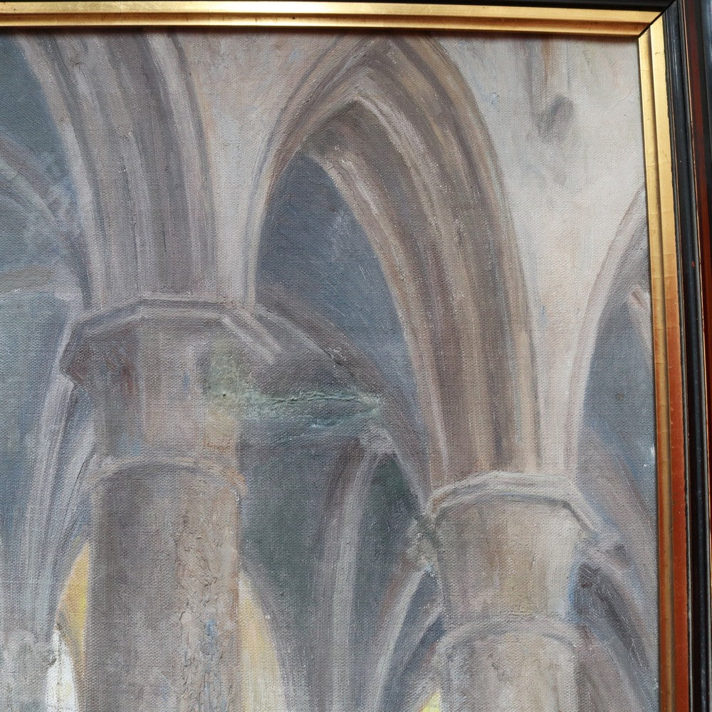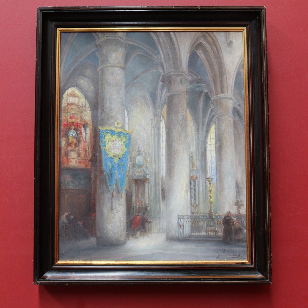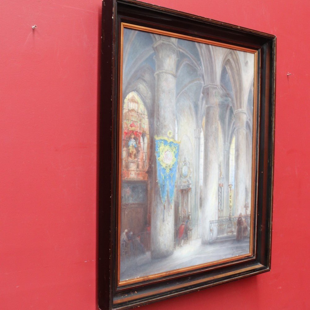 Description: An artwork titled “Cathedral Interior” (also known as “Interior of the Church”) by Belgian artist Jozef Horenbant (1863–1956), believed to depict the interior of a Strasbourg church. Painted with strong architectural detail and atmospheric light. The canvas has a small repair, noted for accuracy. Presented in a heavy black and gilt-toned frame and ready to hang. A striking piece by a well-regarded European artist.