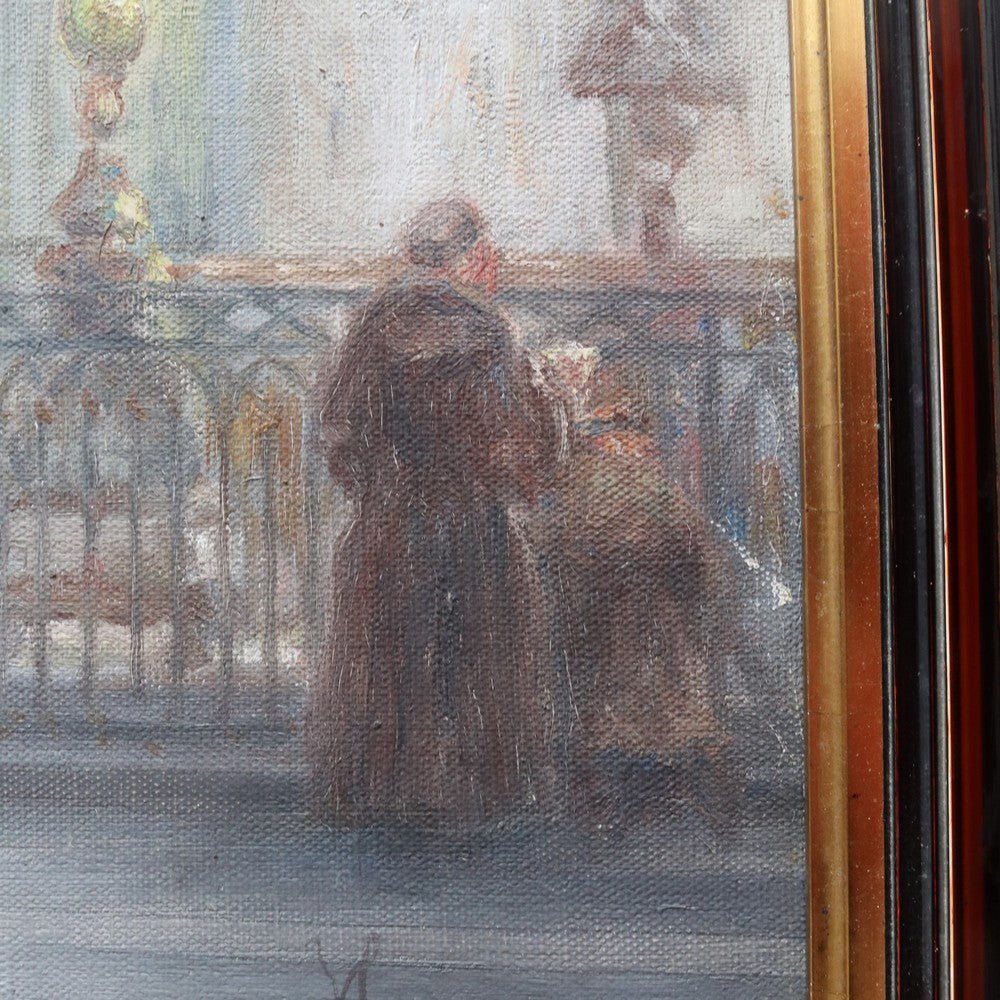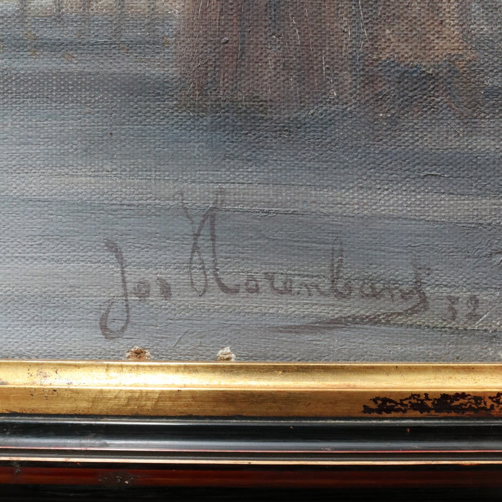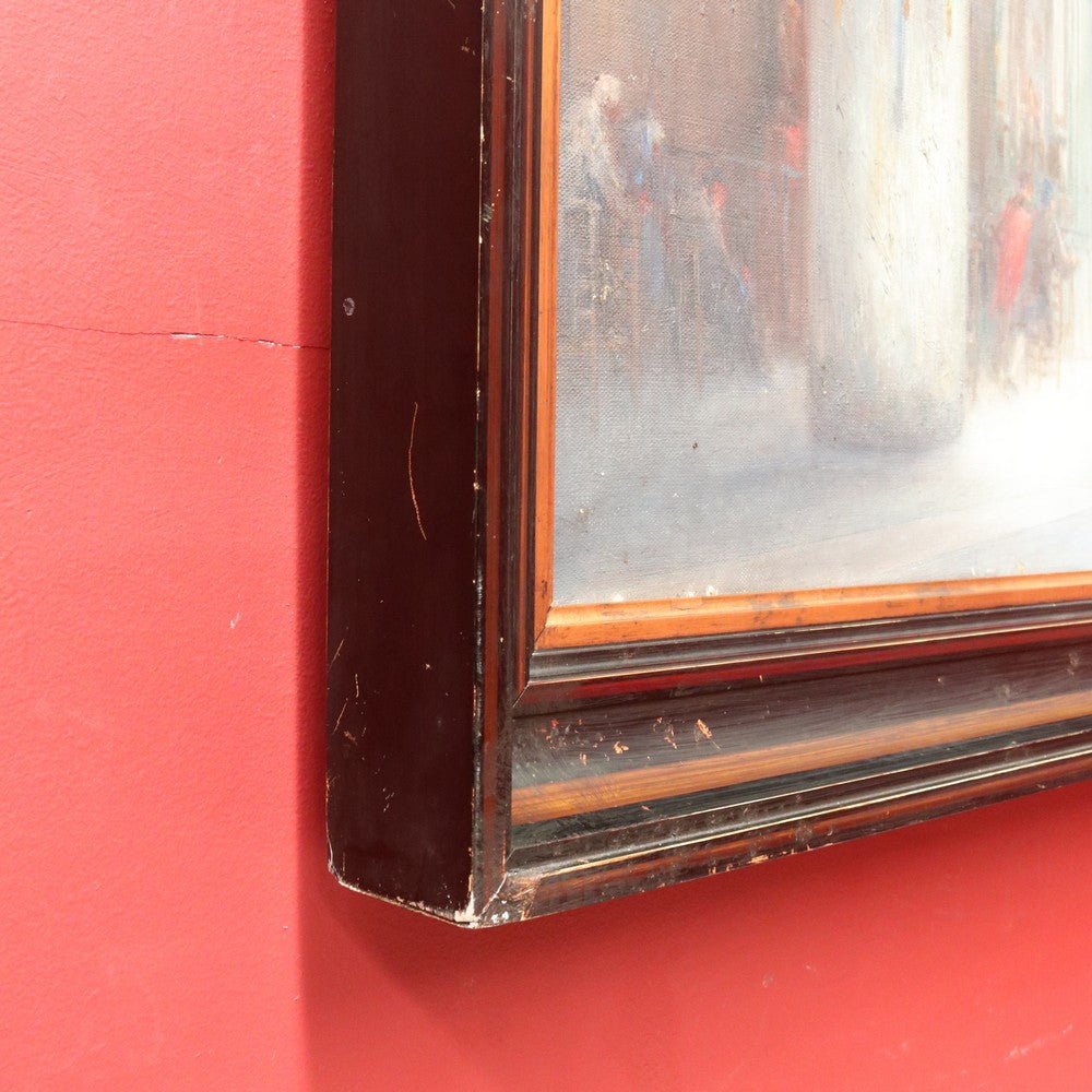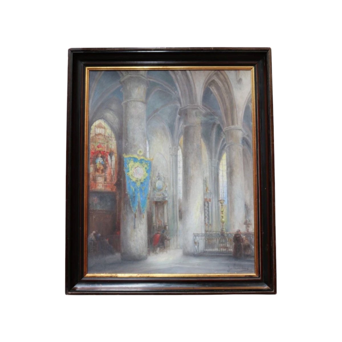 Description: An artwork titled “Cathedral Interior” (also known as “Interior of the Church”) by Belgian artist Jozef Horenbant (1863–1956), believed to depict the interior of a Strasbourg church. Painted with strong architectural detail and atmospheric light. The canvas has a small repair, noted for accuracy. Presented in a heavy black and gilt-toned frame and ready to hang. A striking piece by a well-regarded European artist.