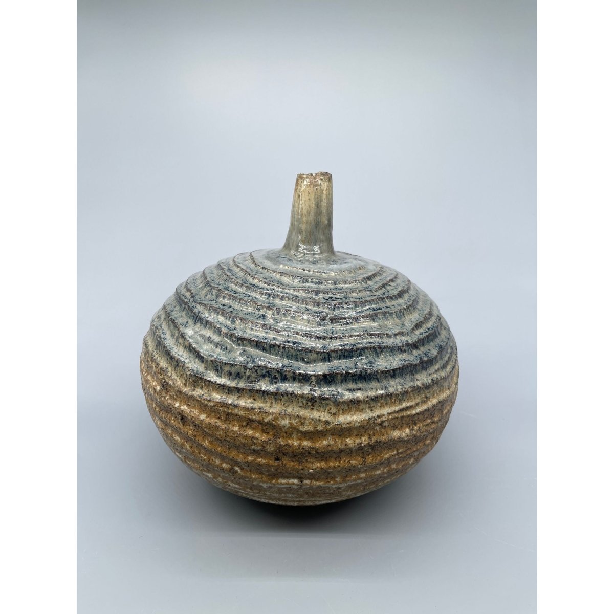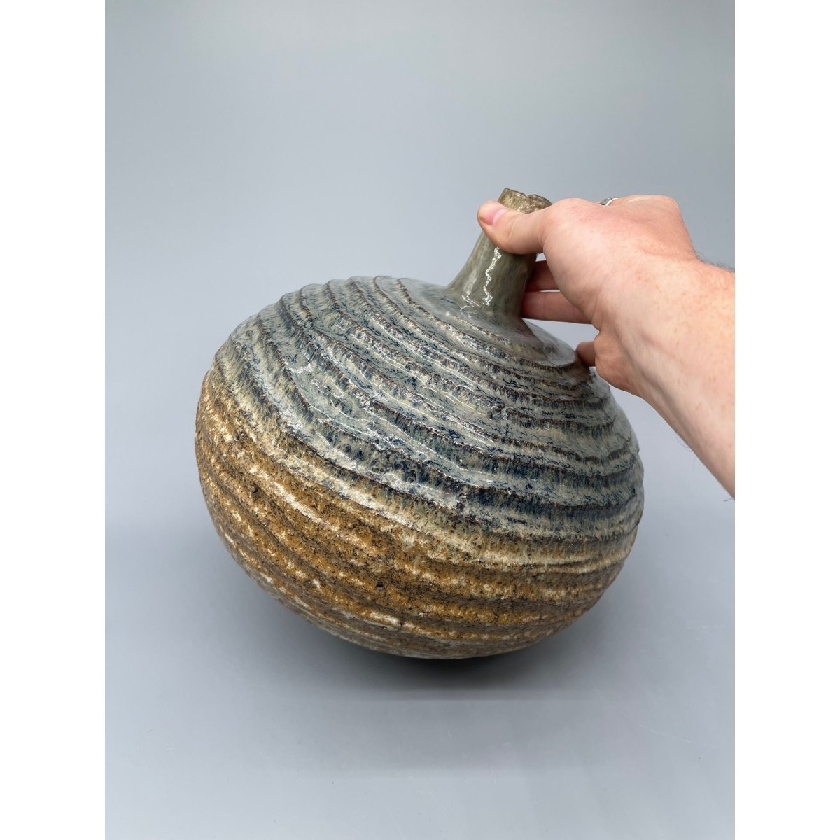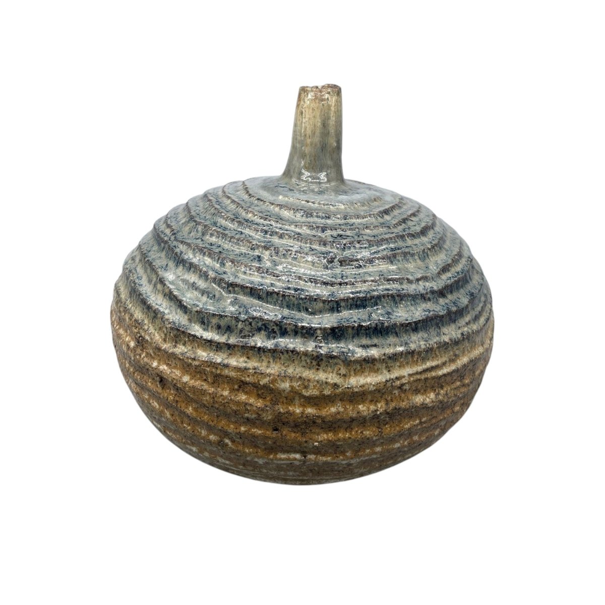 This piece features an earthy glaze of greens, blues, and browns, an interesting ridged shape, and a narrow opening.